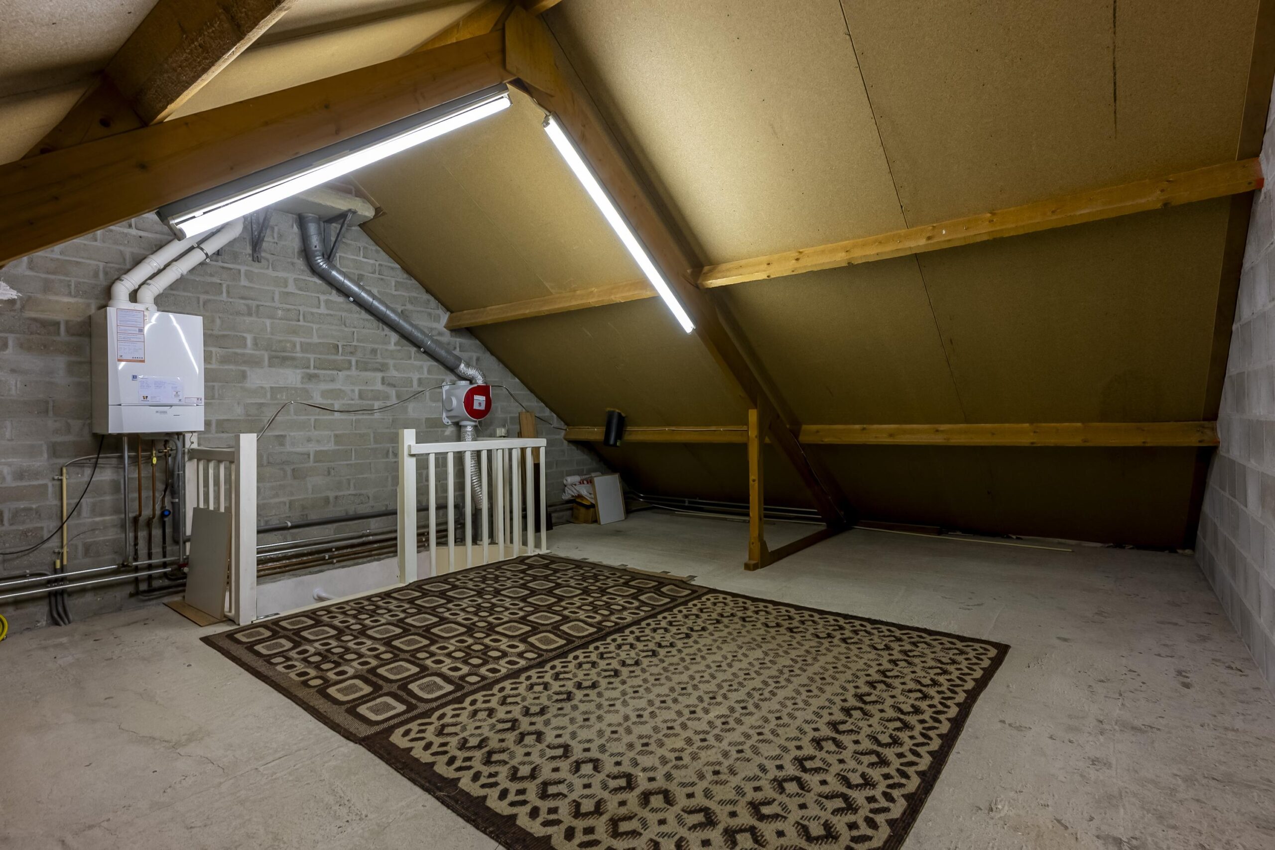 Tweede verdieping: middels vaste trap is de ruime zolderverdieping bereikbaar. Deze fungeert nu als bergzolder maar zou middels een Velux-raam of dakkapel als extra slaapkamer geschikt kunnen zijn. Hier bevindt zich de C.V.-installatie en de mechanische ventilatie-unit.