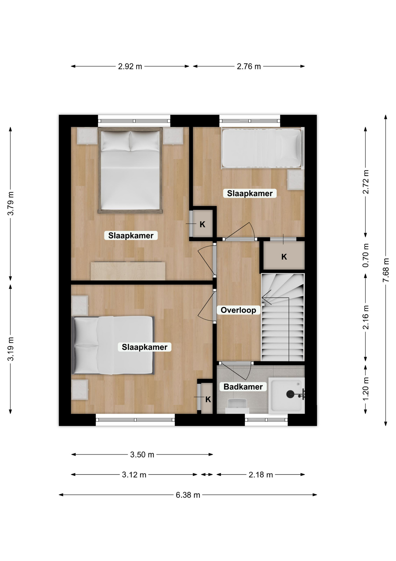 De overloop geeft toegang tot drie slaapkamers van respectievelijk: