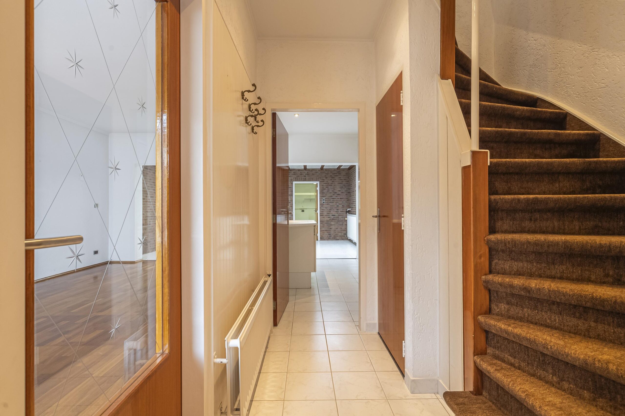 Via de onderhoudsvrije voortuin bereikt men de overdekte entree. Naast de woning ligt een oprit met plaats voor meerdere auto’s (erfdienstbaarheid). Middels degelijke voordeur te bereiken ruime ontvangsthal met gestoffeerde trap naar de eerste verdieping, meterkast en een deels betegeld toilet met fonteintje en raam voor natuurlijke ventilatie.
