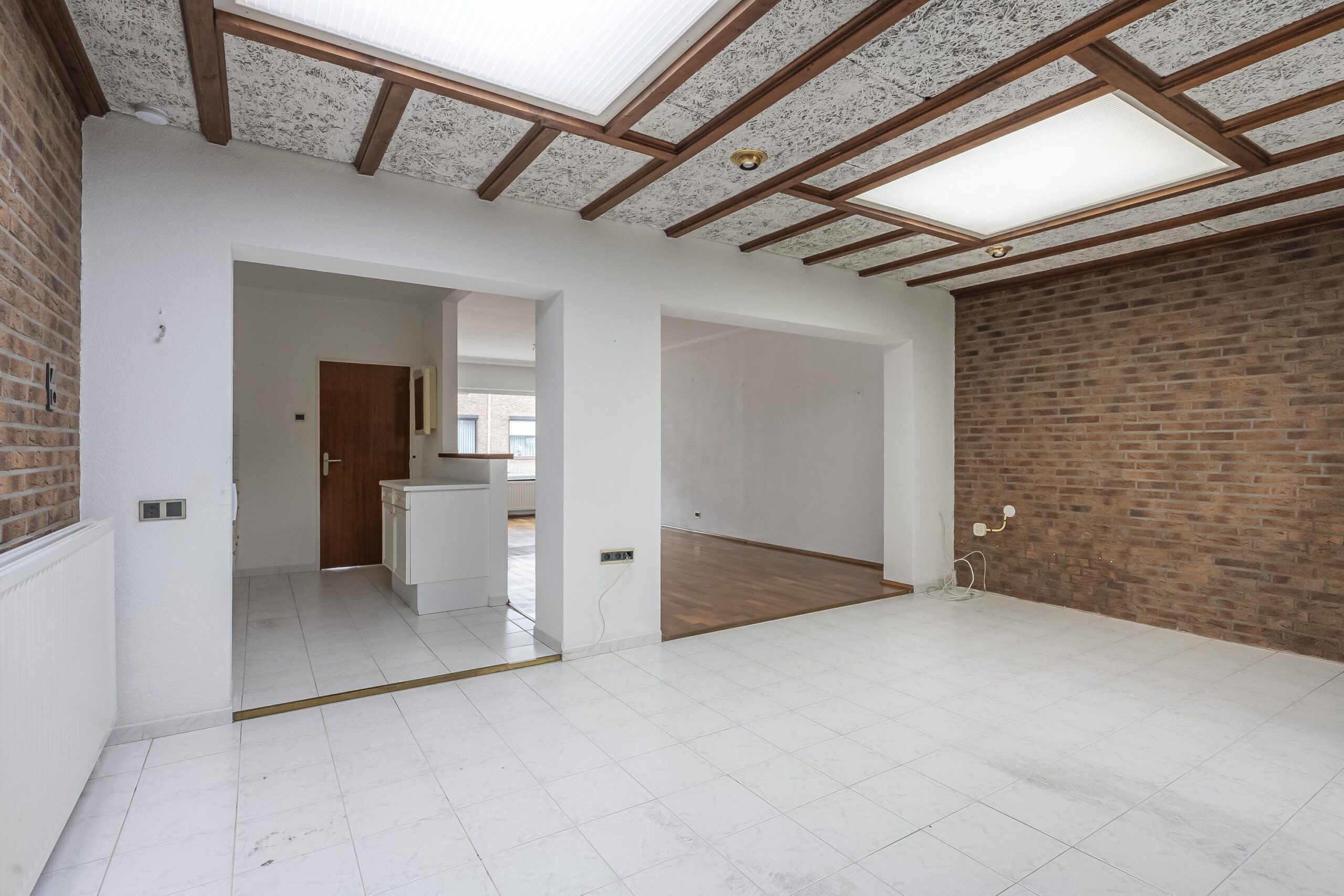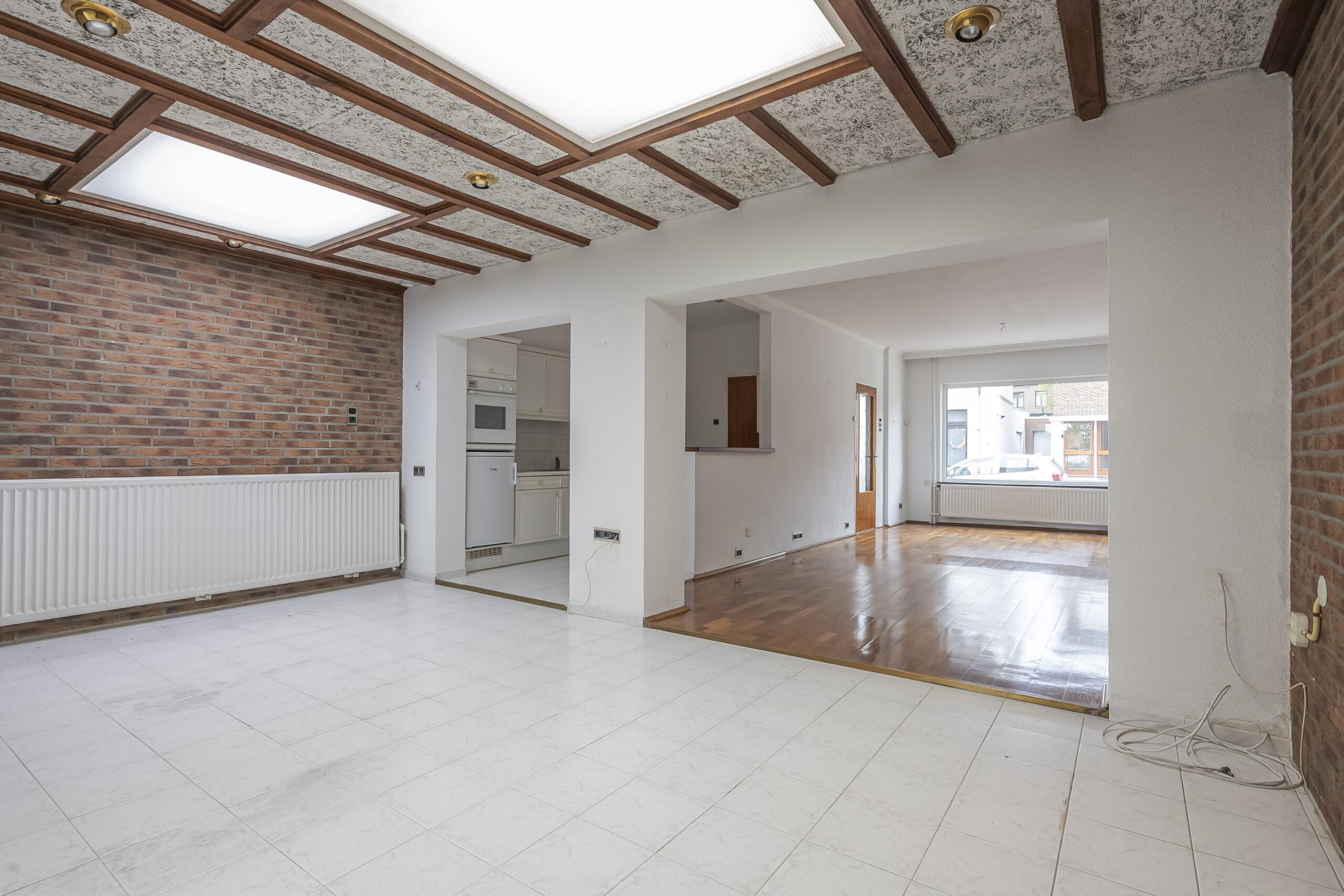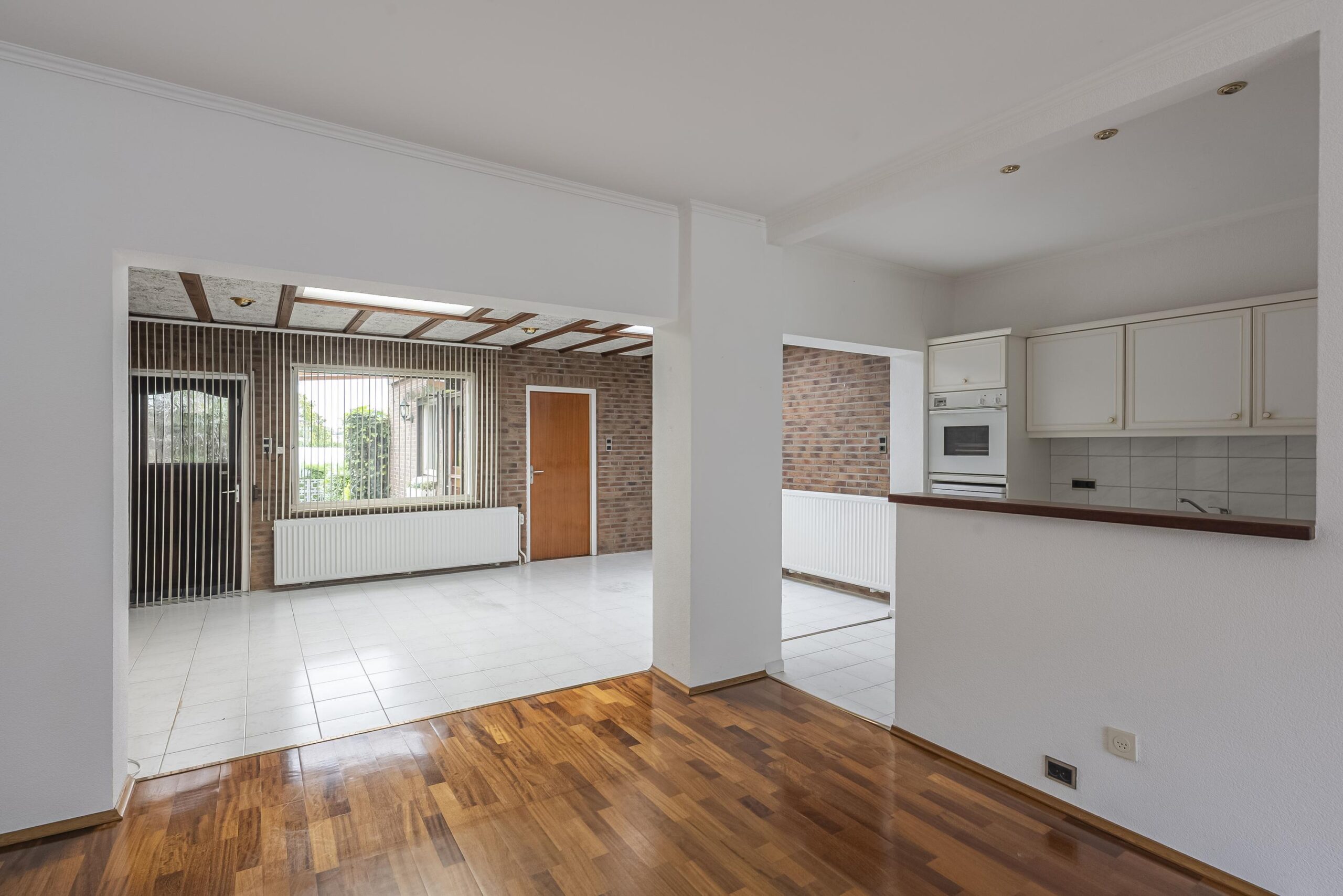 De royale woonkamer met aanbouw is voorzien van een combinatie van parket en plavuizen vloer. Deze lichte ruimte biedt volop mogelijkheden om geheel naar eigen smaak te moderniseren. De centraal gelegen open keuken is functioneel uitgerust met een oven, koelkast, keramische kookplaat en afzuigkap.