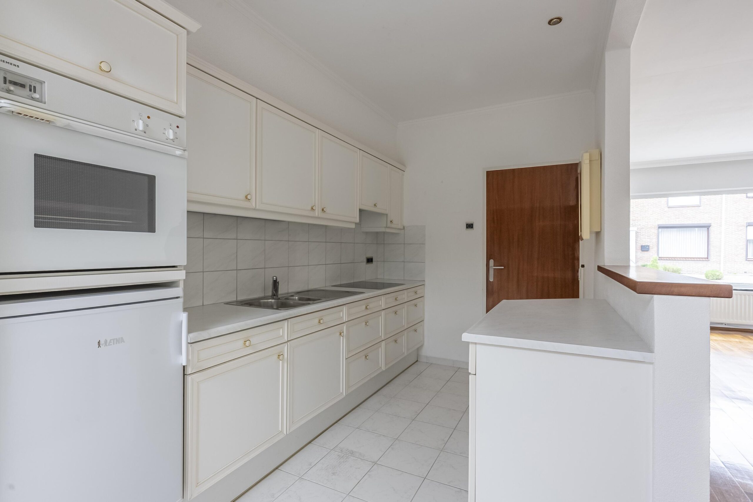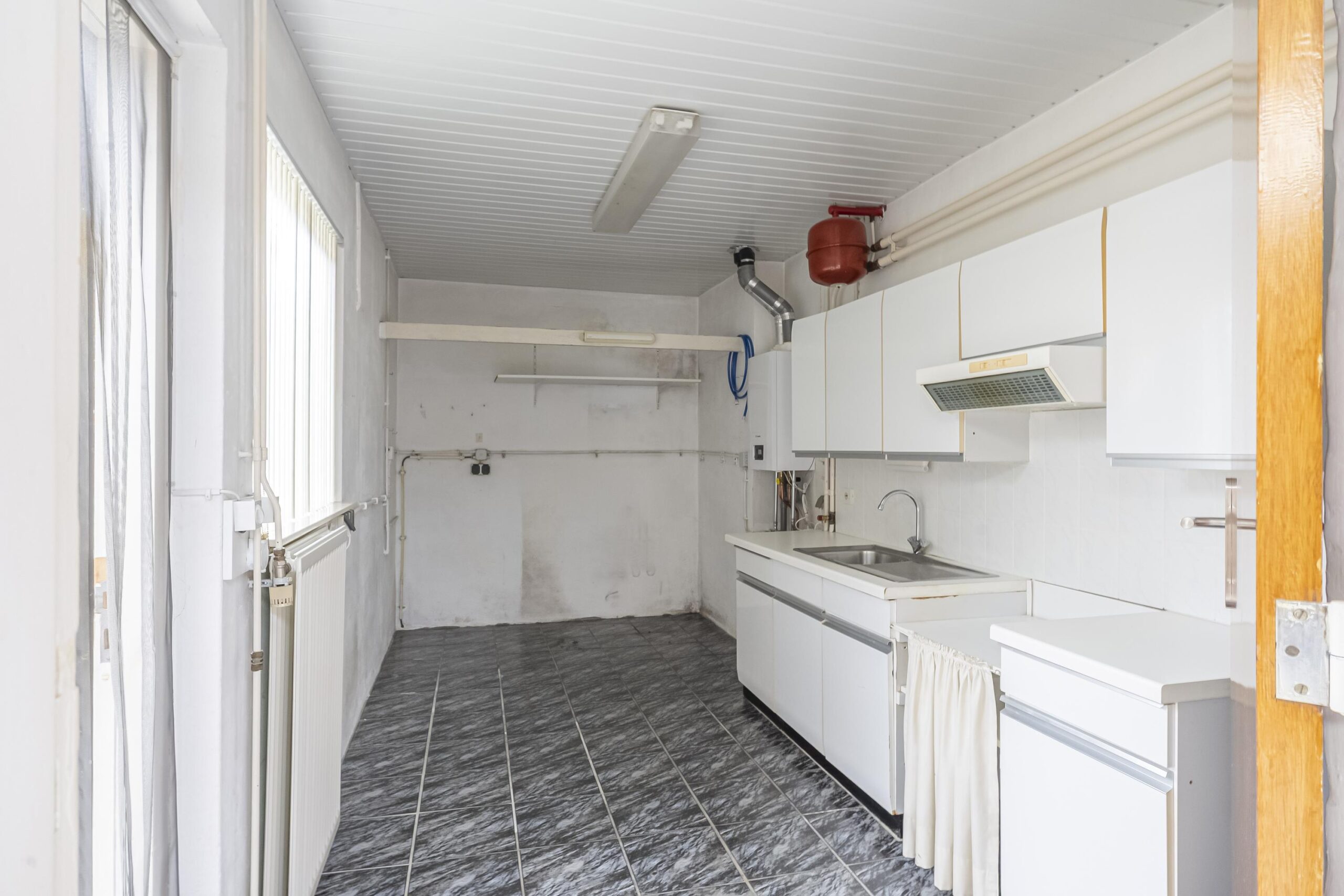 Aansluitend vindt men de verwarmde en ruime bijkeuken met aansluitpunten voor witgoedapparatuur, een keukenblok met bovenkasten en de opstelplaats van de cv-ketel (Remeha, 2021, eigendom).