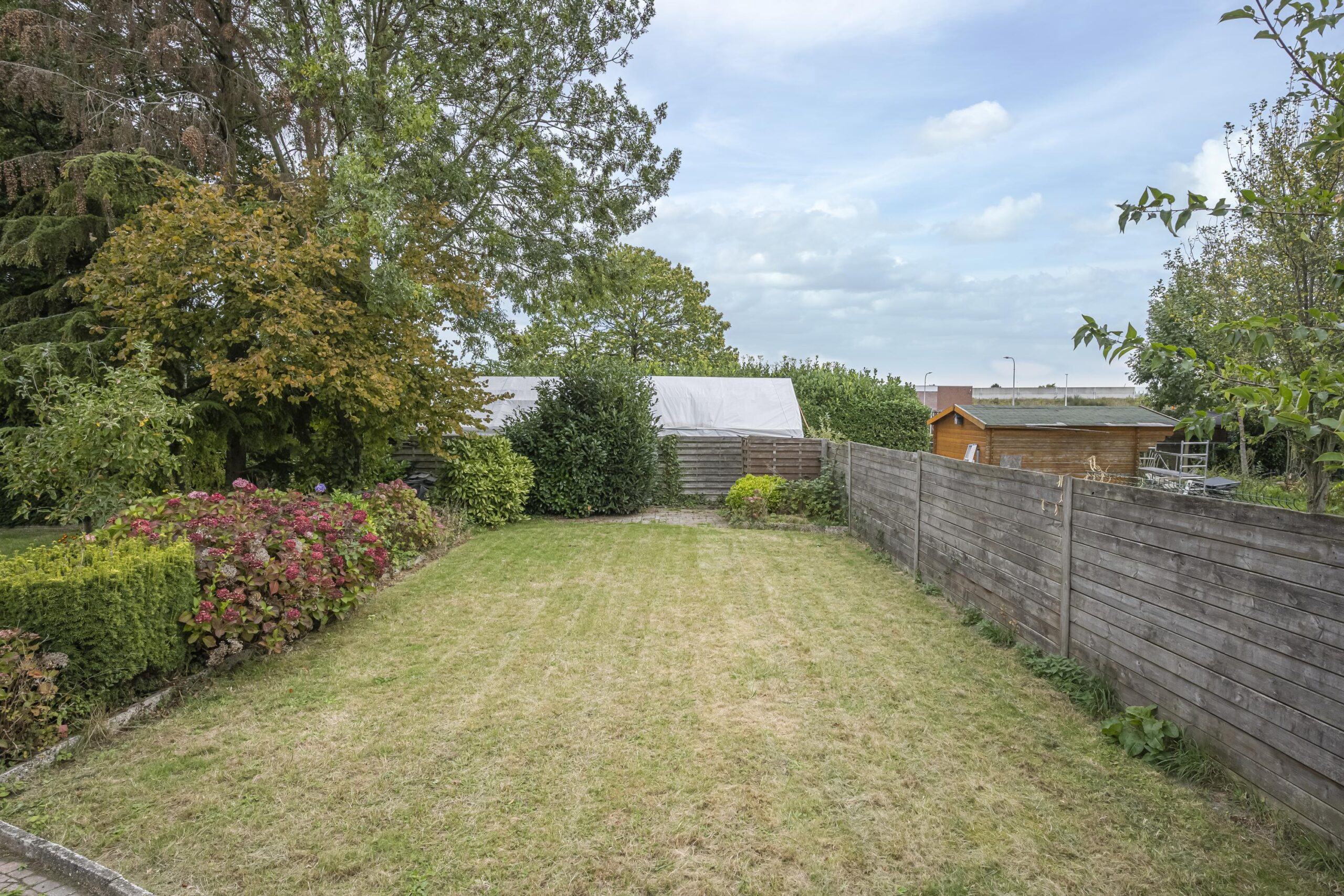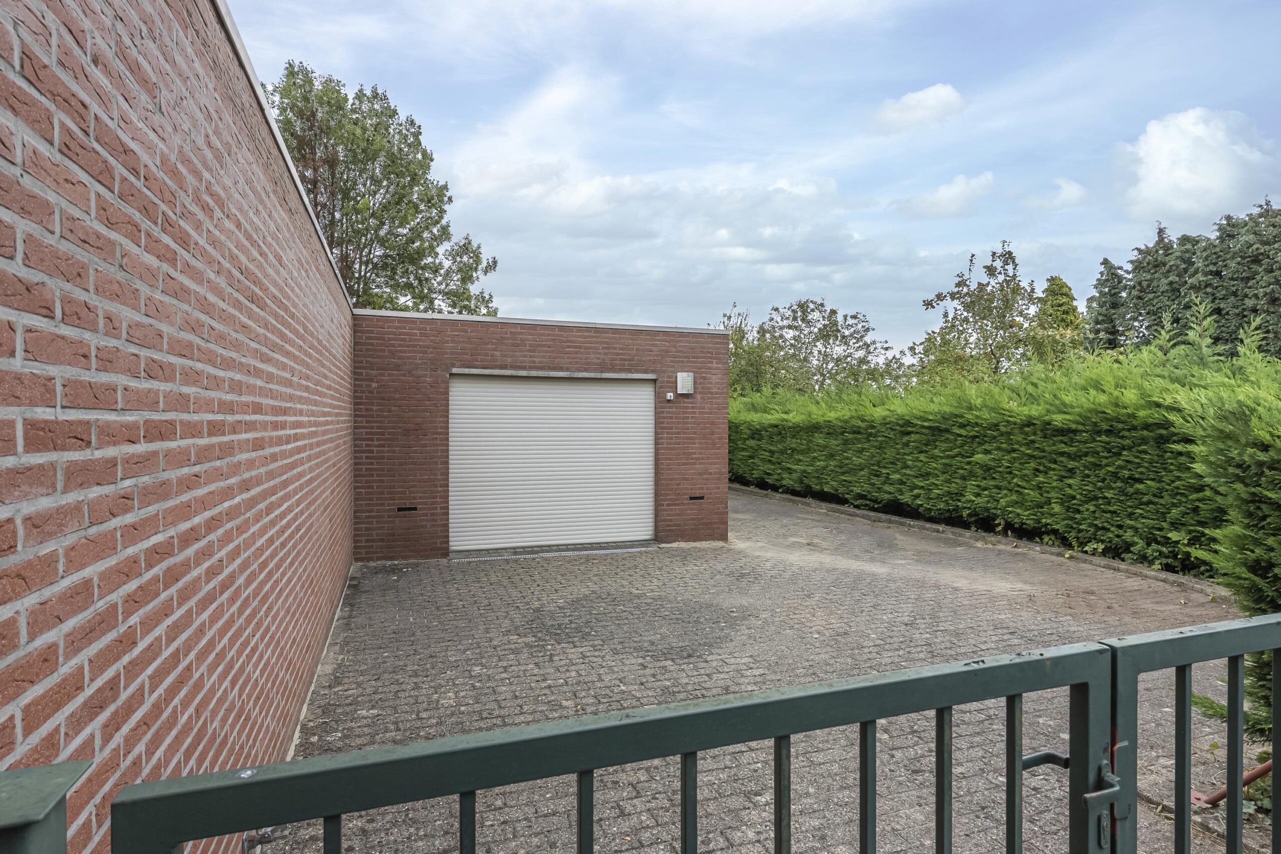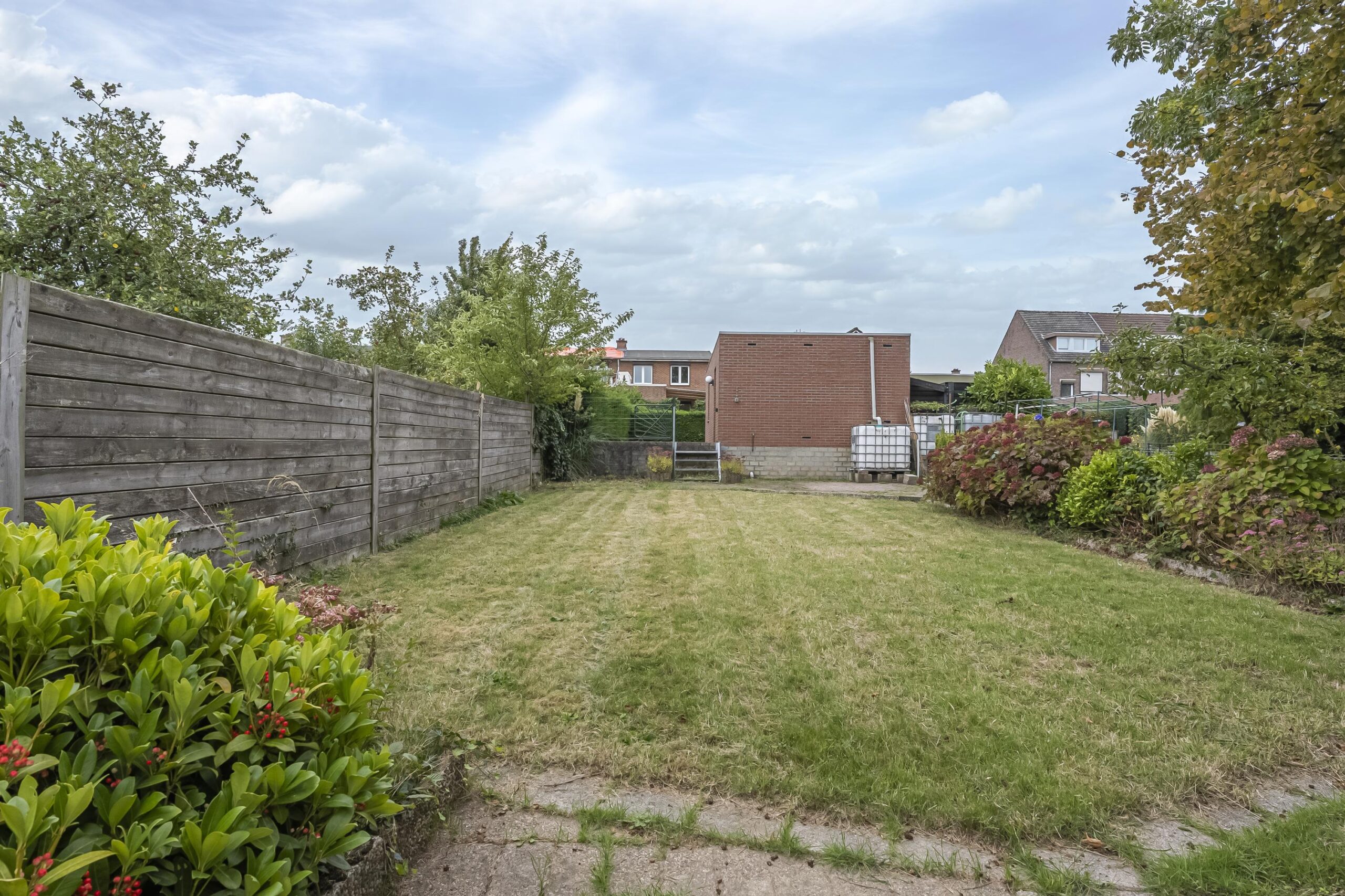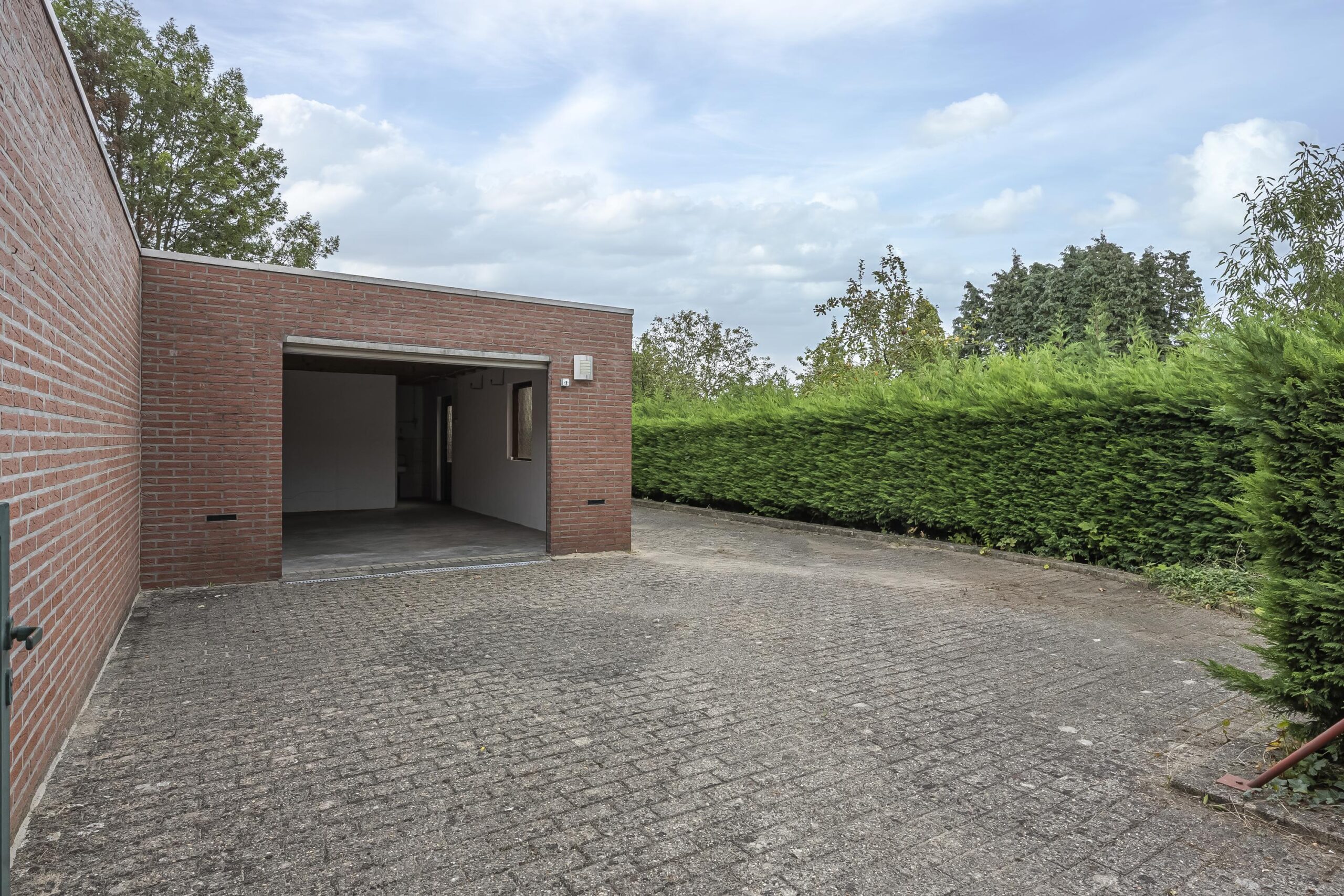 Direct achter de woning bevindt zich een overdekt, bescheiden terras waar je heerlijk beschut kunt zitten. Via een pad (erfdienstbaarheid) is het achterste gedeelte van het perceel bereikbaar. Hier vind je een gemetselde garage met elektrische roldeur en een lager gelegen speelgazon, ideaal voor kinderen en tuinliefhebbers.