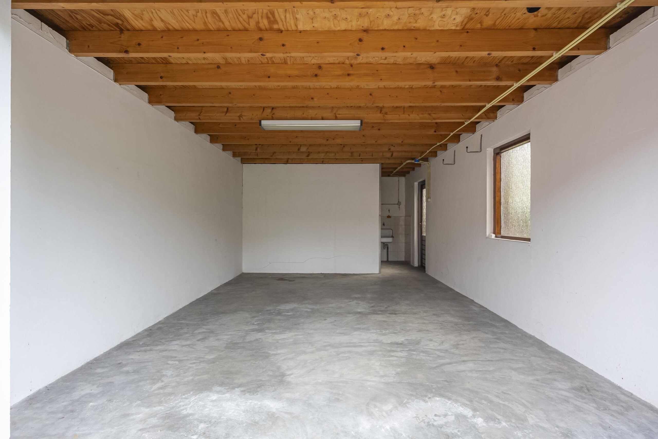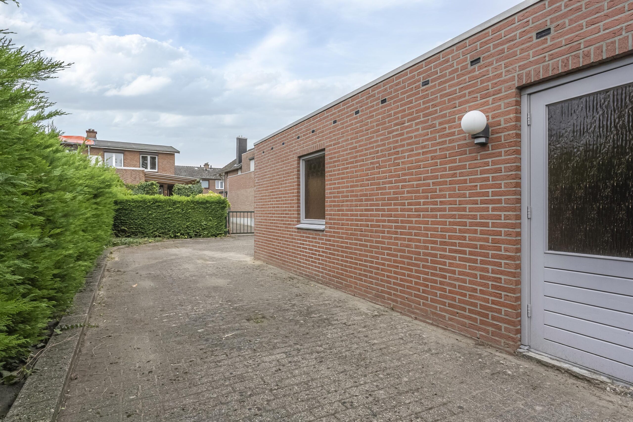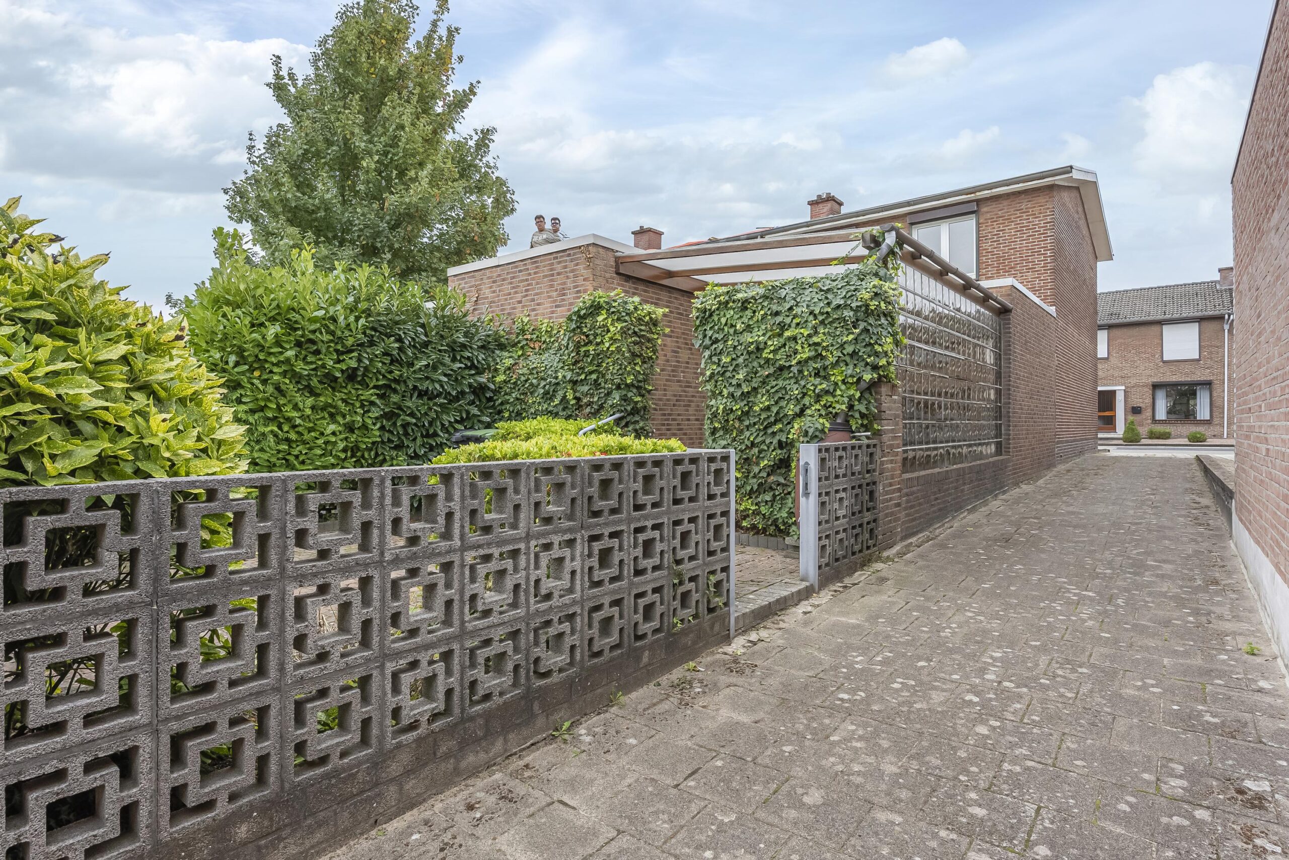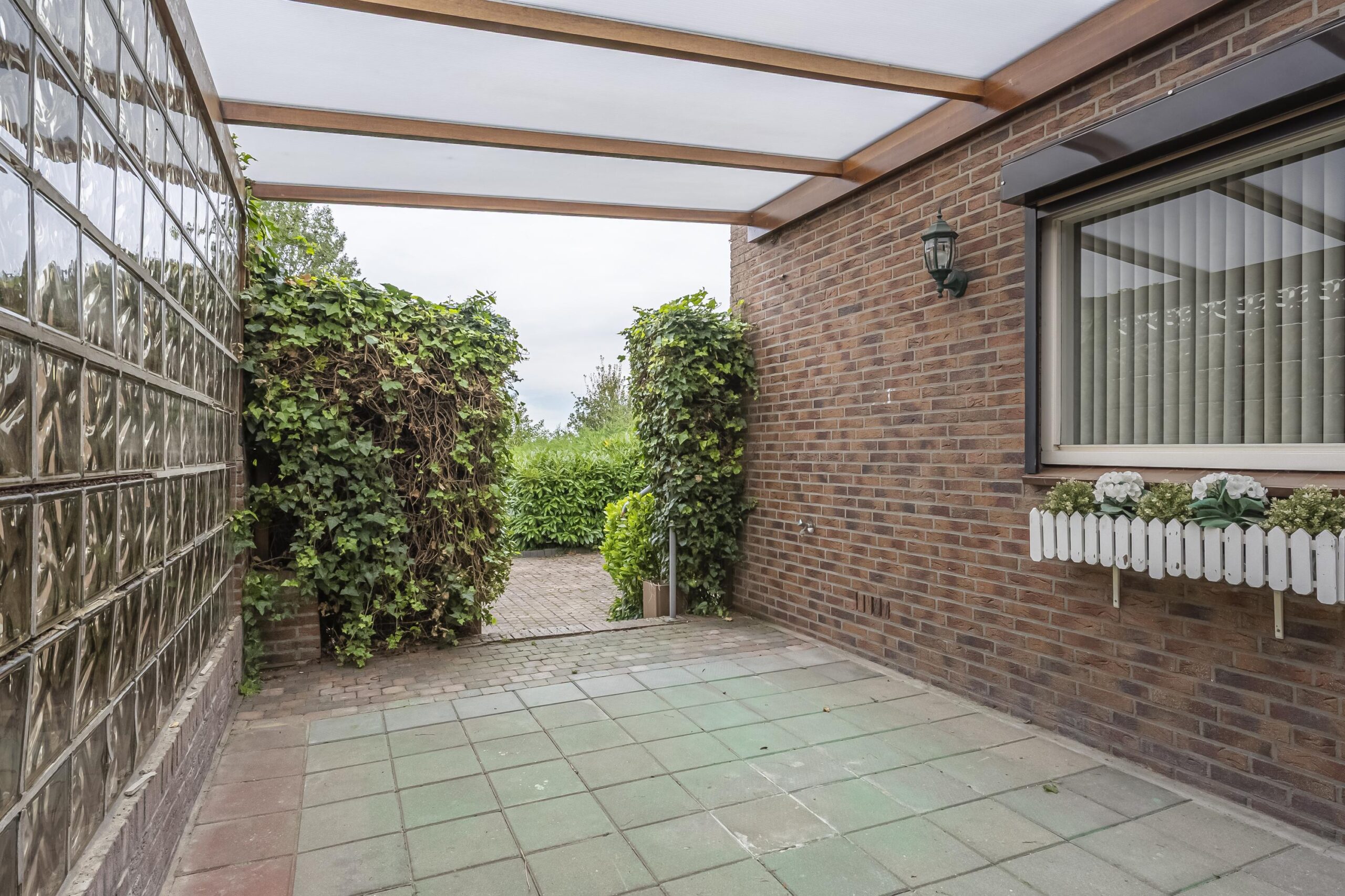 Direct achter de woning bevindt zich een overdekt, bescheiden terras waar je heerlijk beschut kunt zitten. Via een pad (erfdienstbaarheid) is het achterste gedeelte van het perceel bereikbaar. Hier vind je een gemetselde garage met elektrische roldeur en een lager gelegen speelgazon, ideaal voor kinderen en tuinliefhebbers.