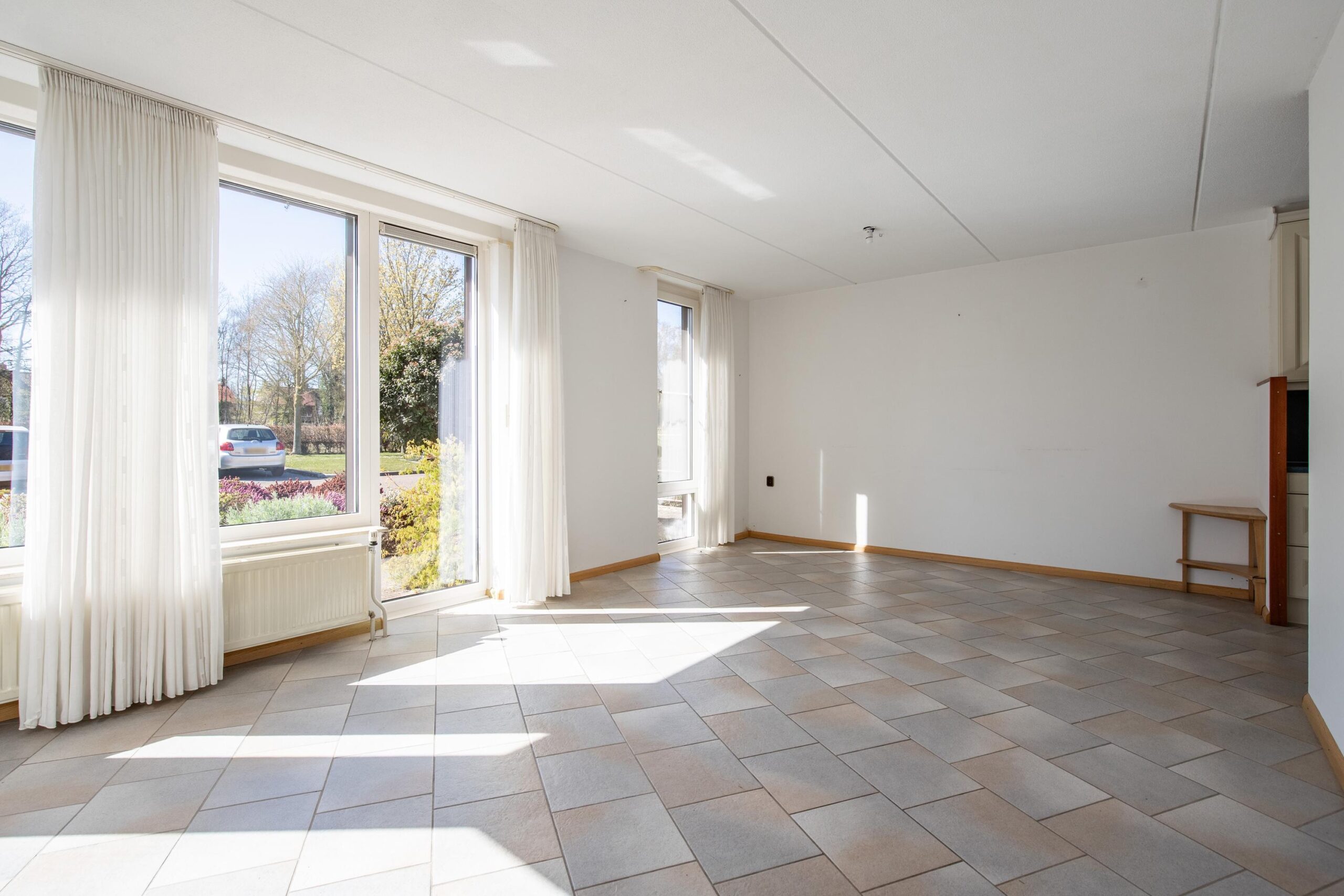 De woonkamer (ca. 24 m²) ligt aan de voorzijde van de woning en is voorzien van meerdere ramen met triple beglazing, wat zorgt voor veel natuurlijke lichtinval. De aanwezige rolluiken dragen bij aan extra comfort.