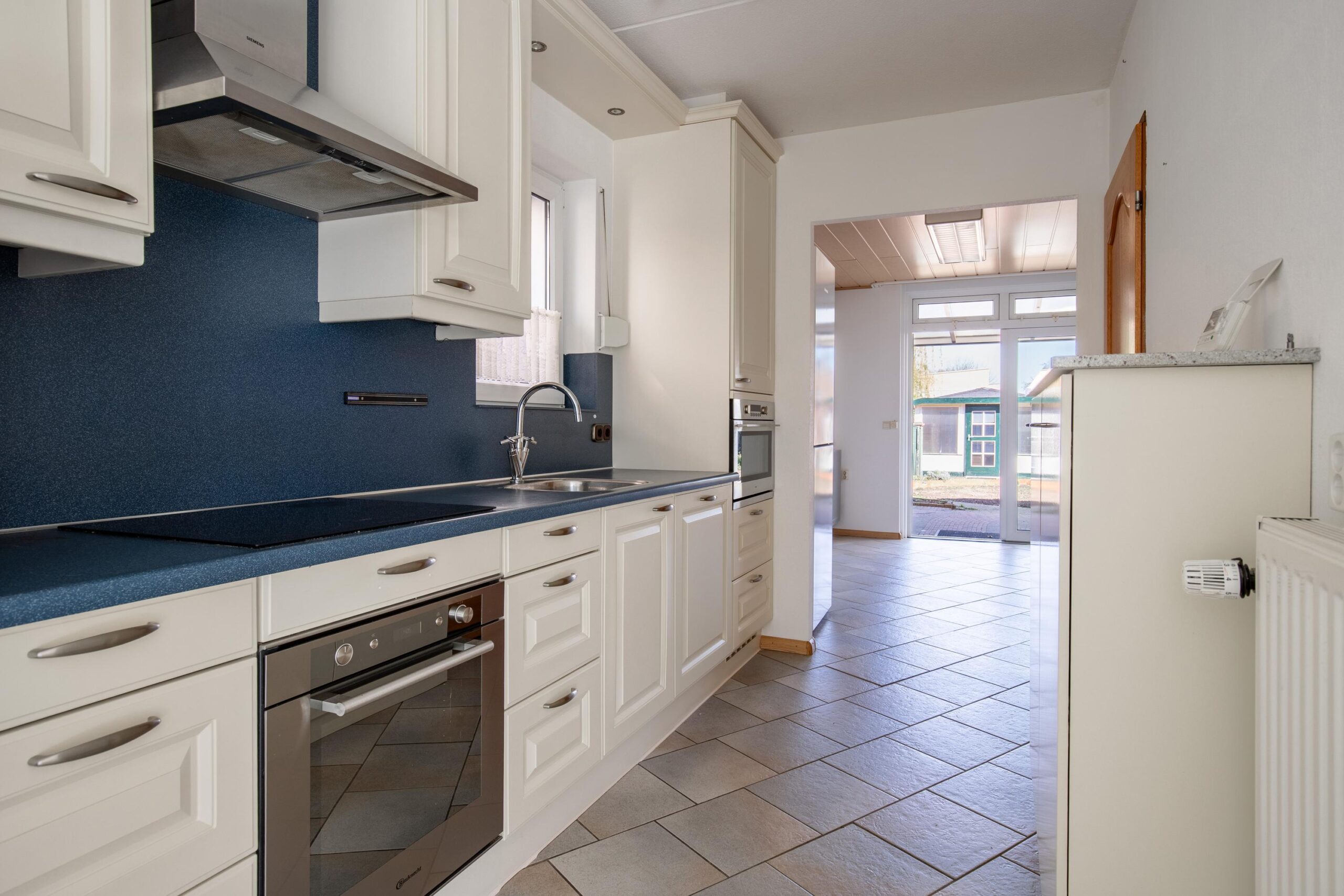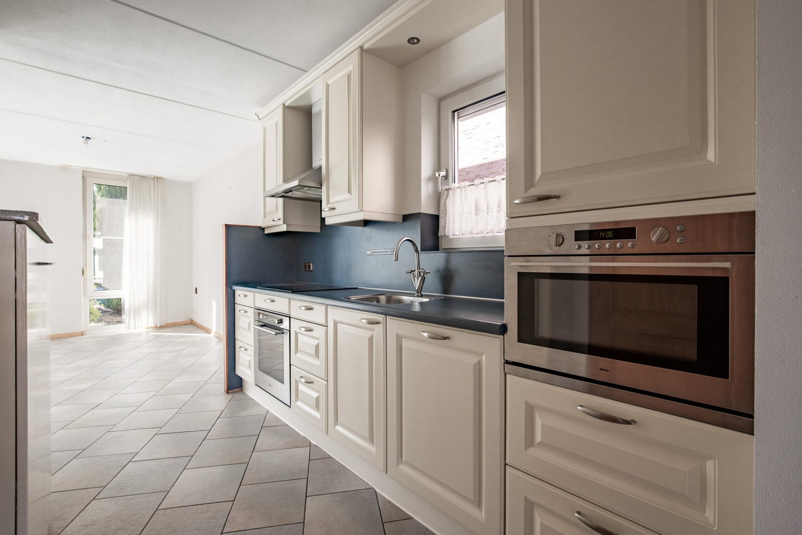 Aansluitend bevindt zich de keuken (ca. 6 m²), uitgevoerd in een praktische wandopstelling. De keuken is voorzien van een 4-pits inductiekookplaat, spoelbak, vaatwasser, oven en magnetron. Daarnaast is er een losse koel-vriescombinatie (Liebherr) aanwezig, welke achterblijft in de woning. Een groot deel van de apparatuur is vernieuwd in 2025. In de keuken bevindt zich ook een trapkast (ca. 3 m²), die zorgt voor extra bergruimte.