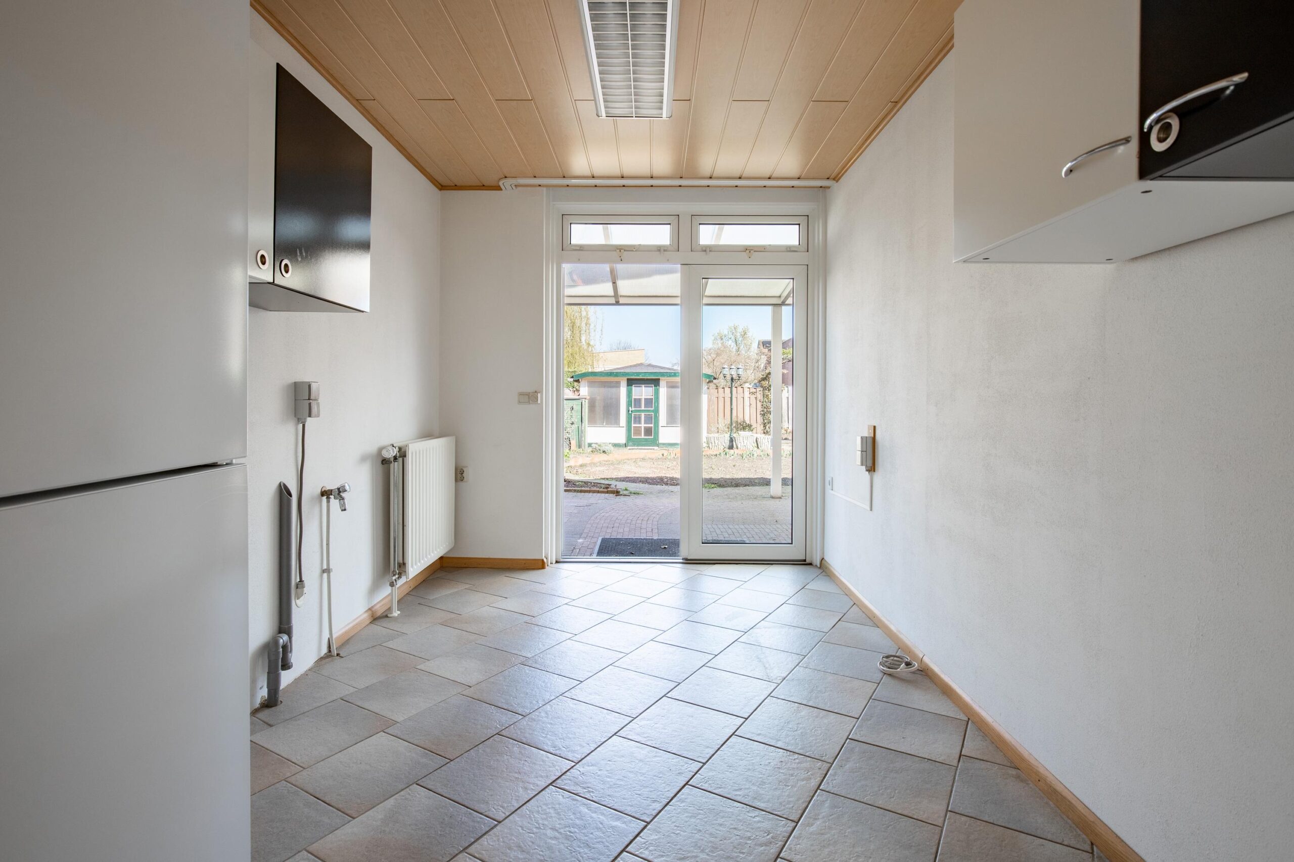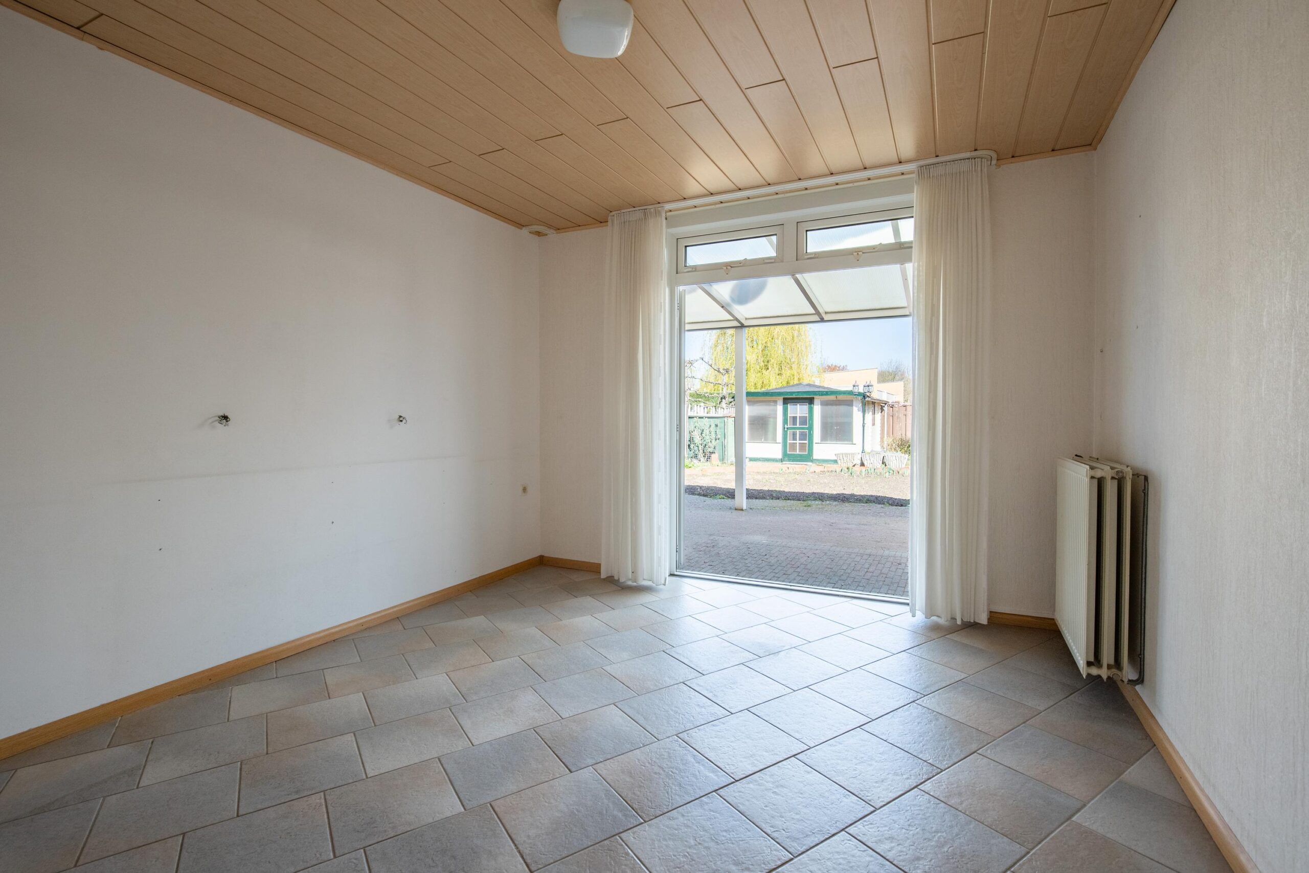 Aan de achterzijde van de woning bevindt zich een ruimte (ca. 13 m²) die uitstekend kan dienen als slaapkamer. Via de openslaande deuren heeft u vanuit deze ruimte direct toegang tot de tuin.