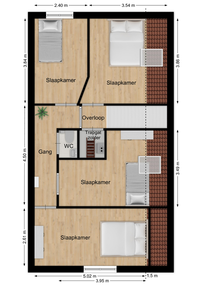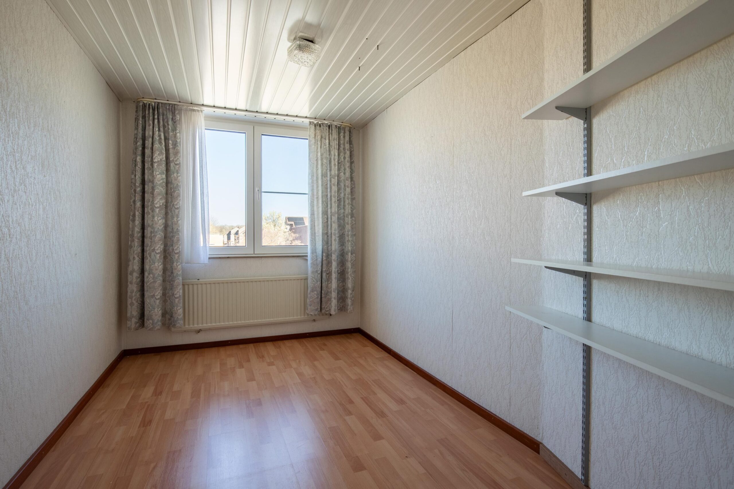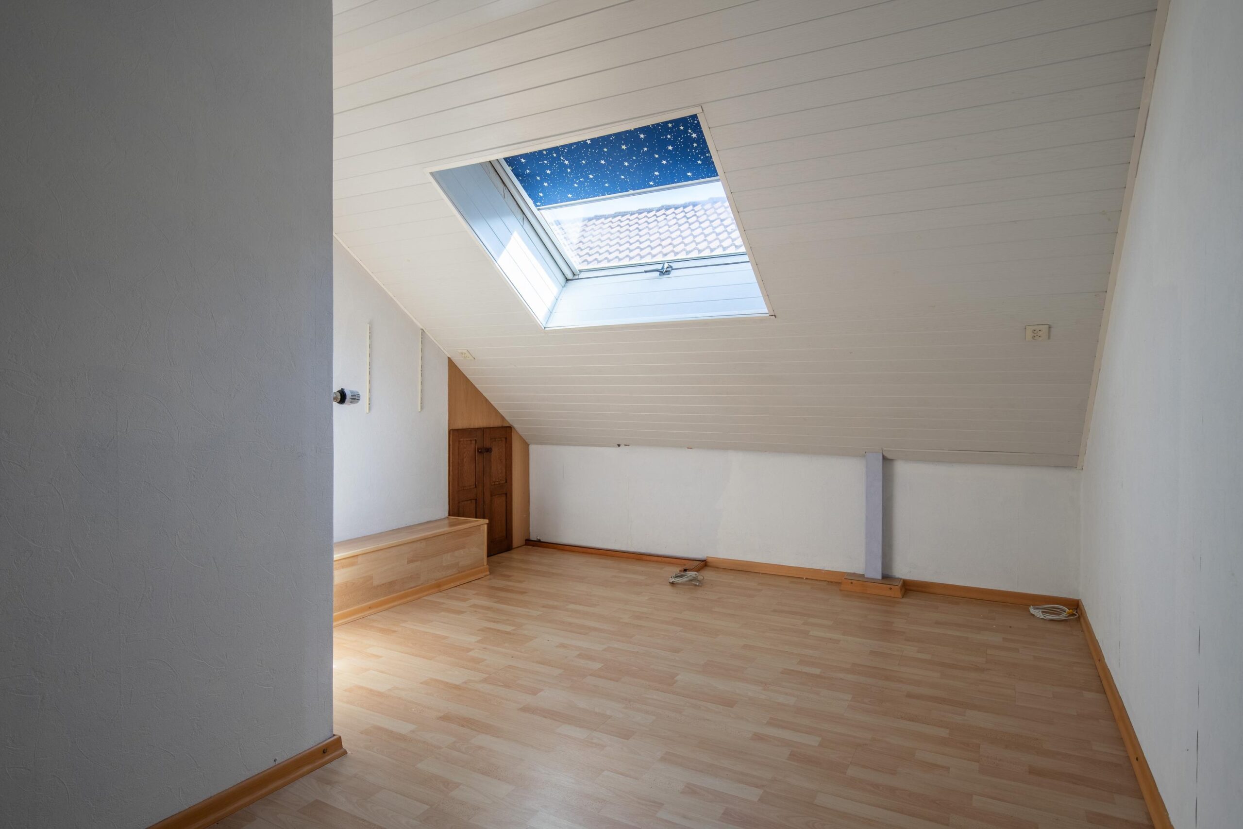 De vierde slaapkamer (ca. 13 m²) heeft een L-vorm en is eveneens voorzien van een dakraam met dubbele beglazing.