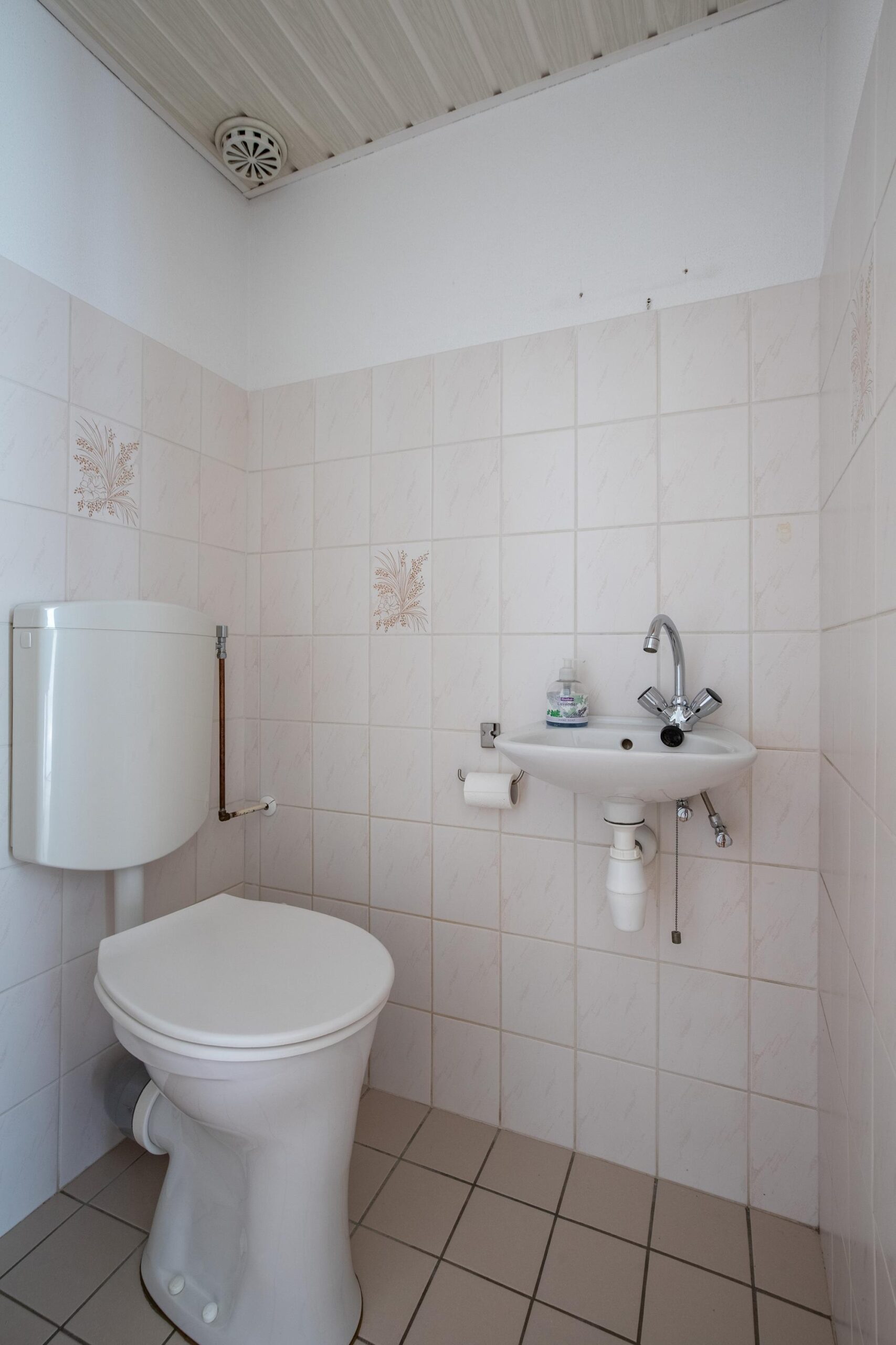 De badkamer (ca. 4 m²) is uitgerust met een douche en een wastafelmeubel. Aangrenzend bevindt zich een separaat toilet. Door de aanwezigheid van de badkamer en slaapkamer op de begane grond, is deze woning levensloopbestendig te noemen.