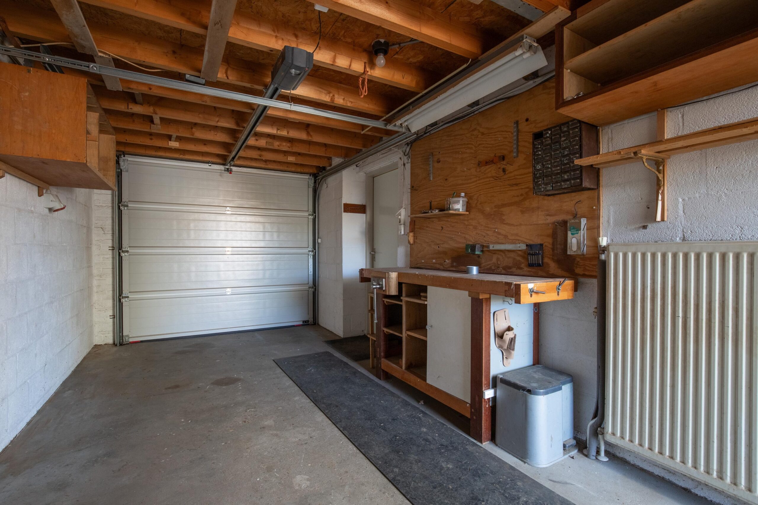 De inpandige garage (ca. 15 m²) ligt eveneens aan de achterzijde van de woning en is voorzien van elektra- en wateraansluitingen en een verwarming. Vanuit de garage heeft u tevens toegang tot de achtertuin.