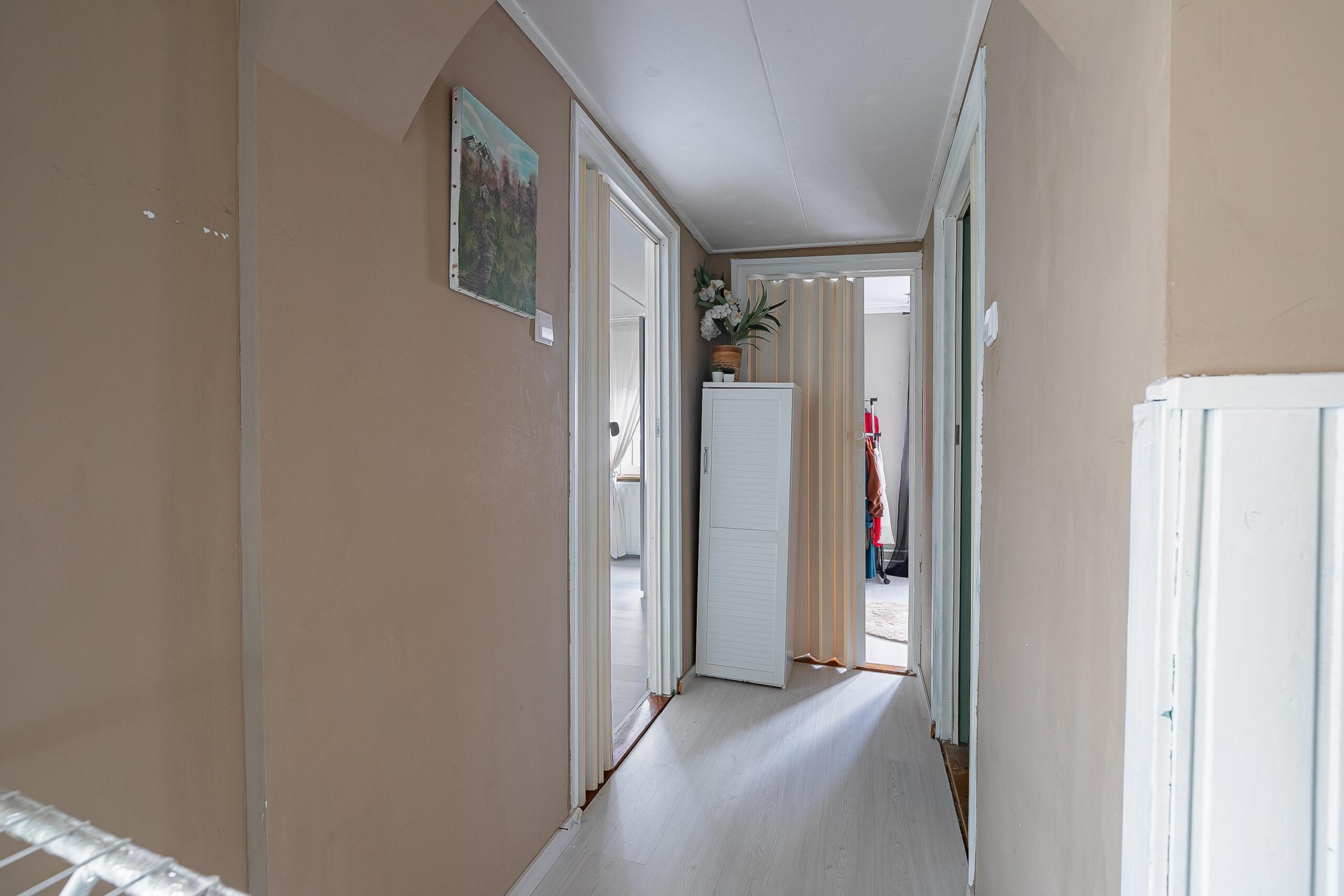 Bij binnenkomst via de hal, waar zich ook de meterkast en garderobe bevindt, biedt de hal toegang tot de woonkamer. De woonkamer is voorzien van een keurige laminaatvloer en siert zichtzelf door de authentieke balkconstructie. Naast de woonkamer is de hal gelegen met trapopgang naar de 1e verdieping, toiletruimte en toegang naar de keuken en het overdekt terras. De gedeeltelijk betegelde toiletruimte is voorzien van een hangcloset. De gesloten leefkeuken beschikt over een functioneel keukenblokje, oven, wasbak en keramische kookplaat.