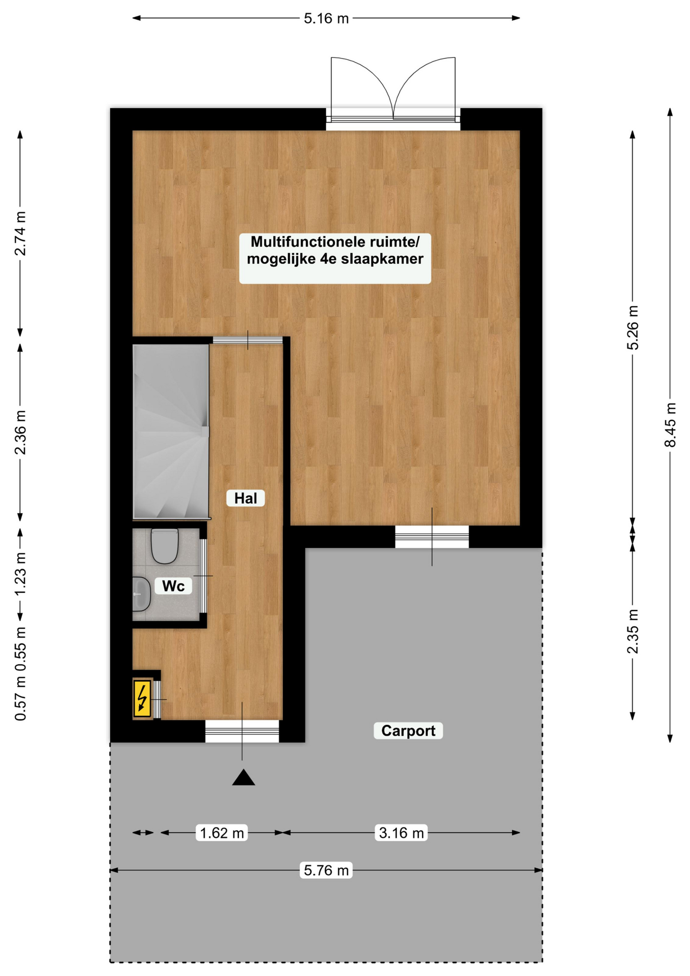 Via de carport bereikt men de overdekte entree van de woning. De ontvangsthal is voorzien van een garderobe, meterkast, trapopgang naar de eerste verdieping en een deels betegeld toilet met fonteintje. Op de begane grond bevindt zich een multifunctionele ruimte die zich uitstekend leent als kantoor, extra slaapkamer, bergruimte of praktijkruimte. Deze ruimte beschikt over een loopdeur naar de oprit én dubbel openslaande deuren naar de tuin. Tevens bevinden zich hier de aansluitpunten voor witgoedapparatuur.
