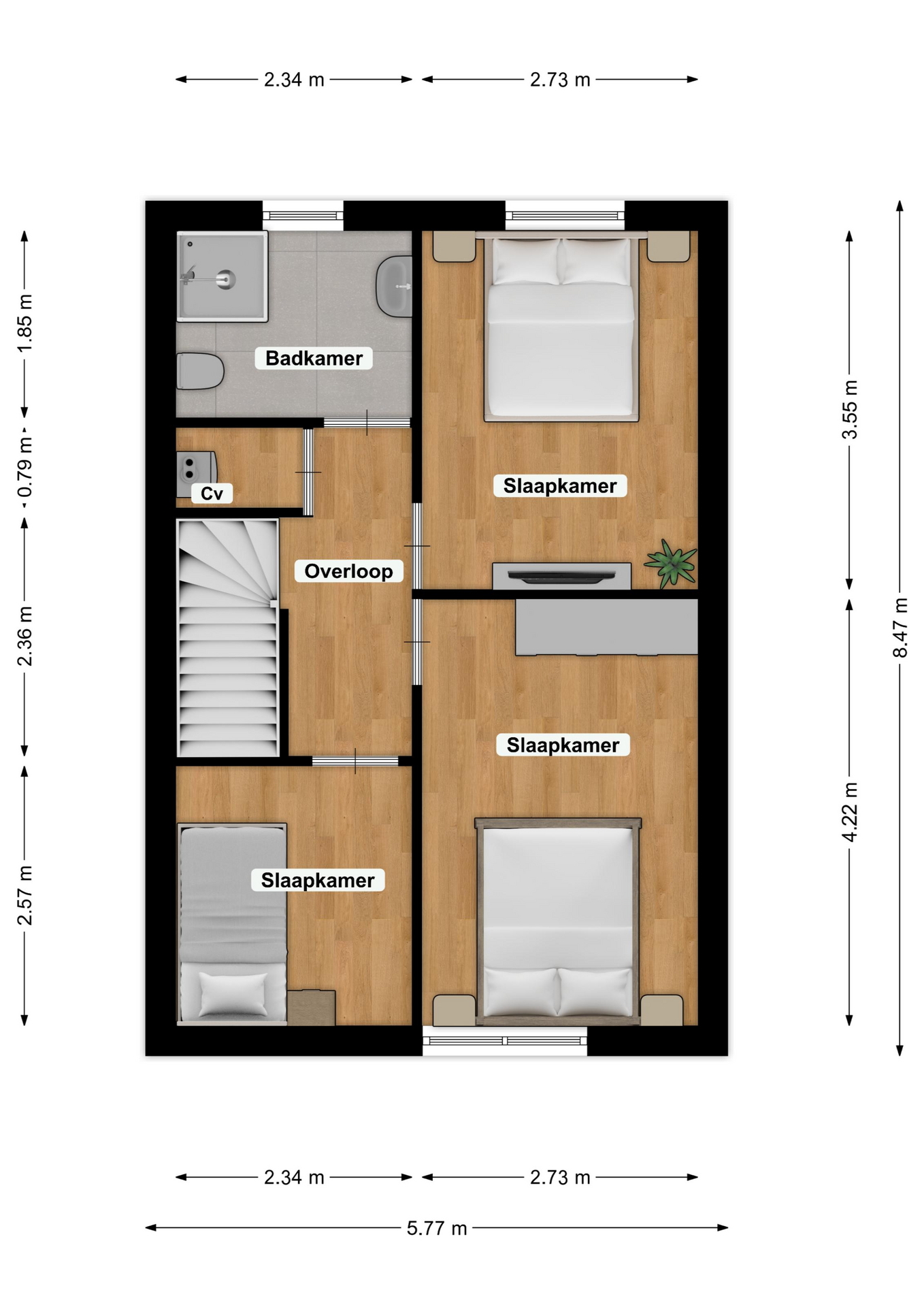 De ruime overloop biedt toegang tot drie goed afgewerkte slaapkamers, allen voorzien van moderne laminaatvloeren, strak spuitwerk en rolluiken. De slaapkamers zijn respectievelijk groot: