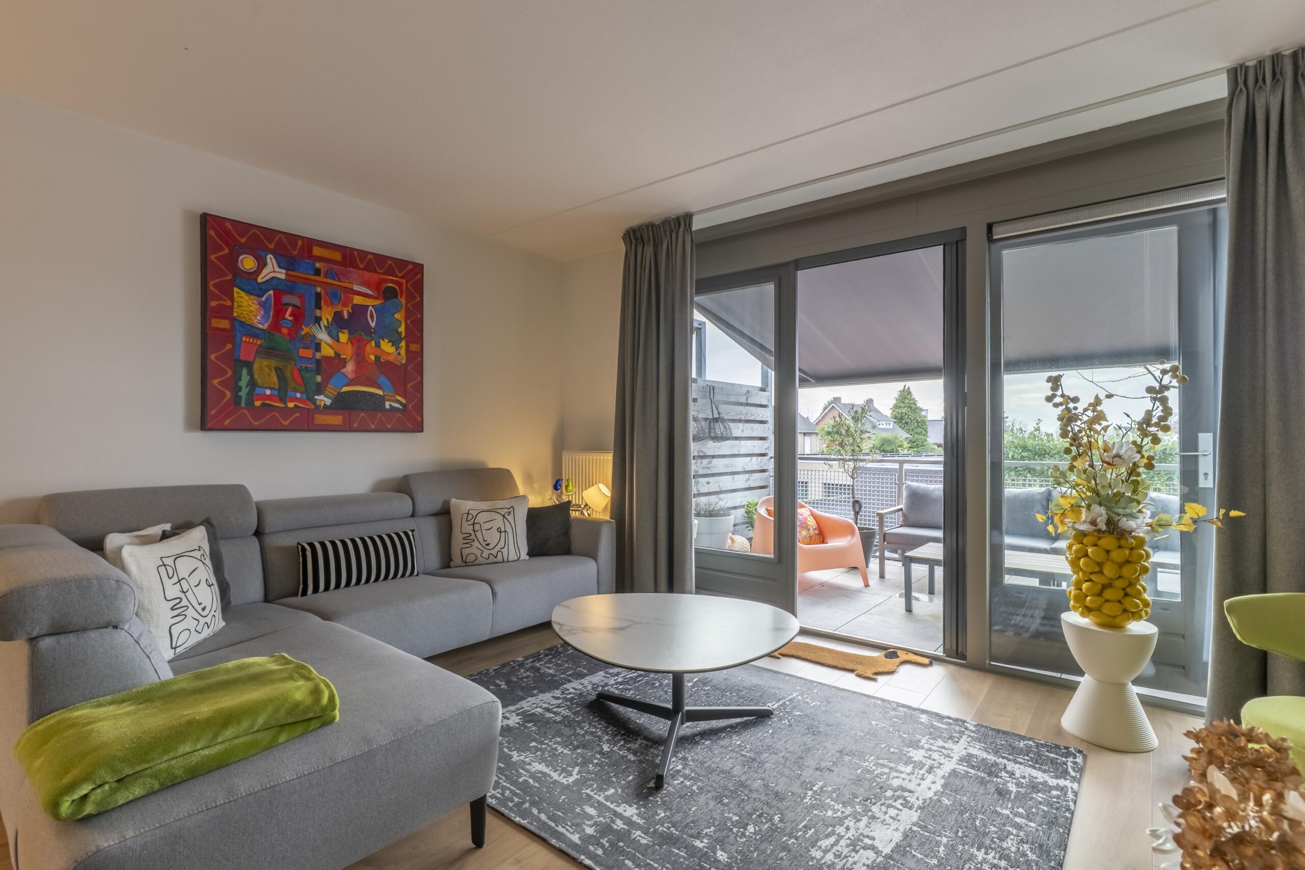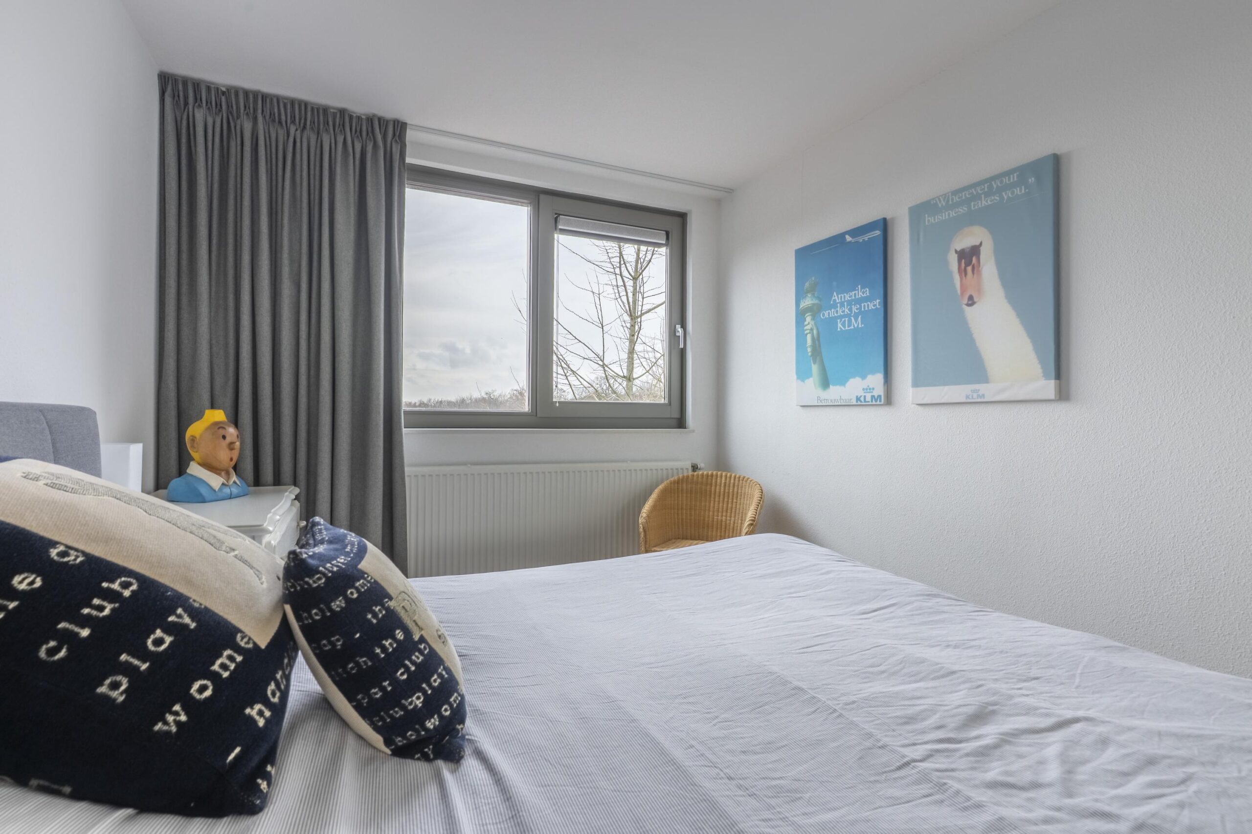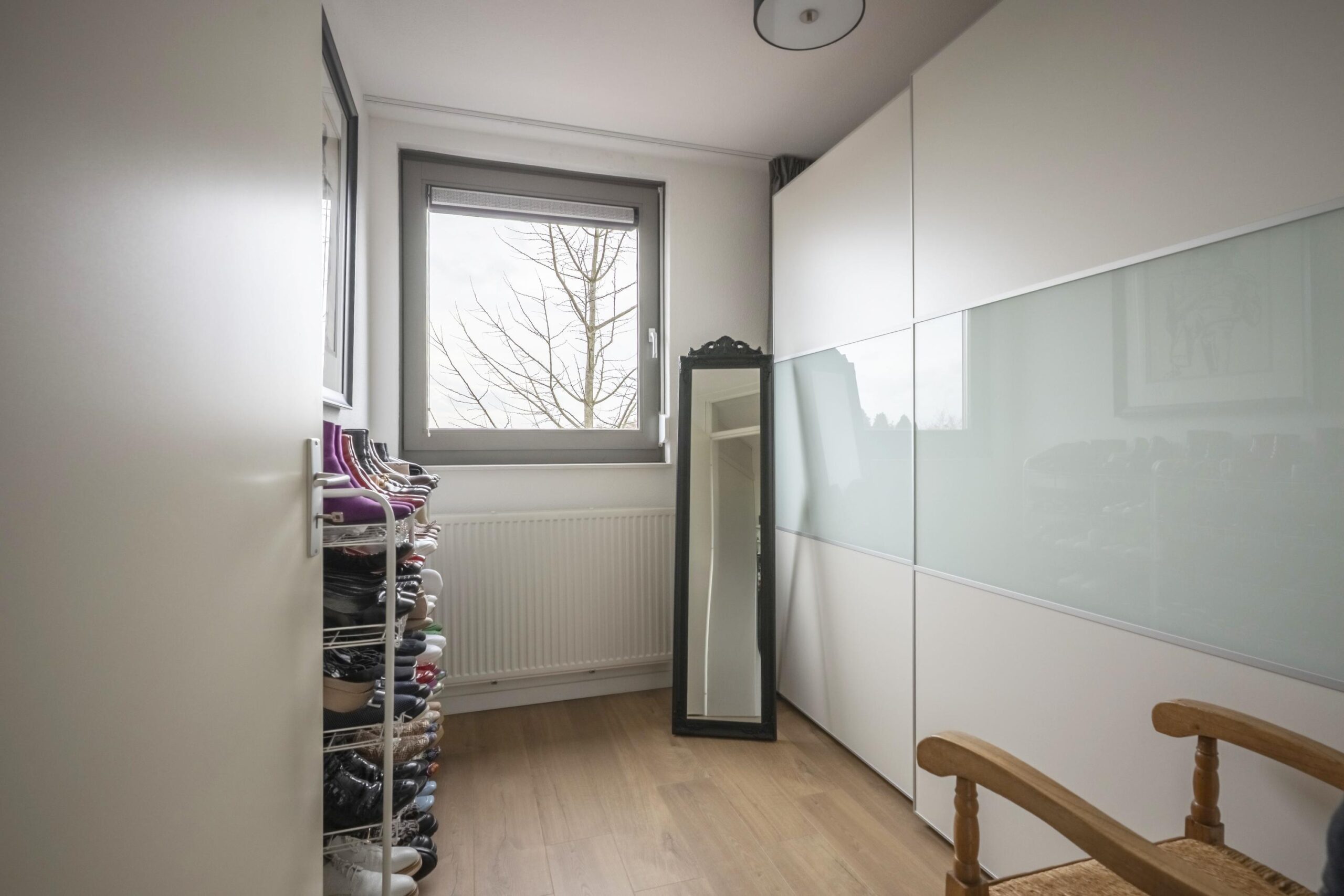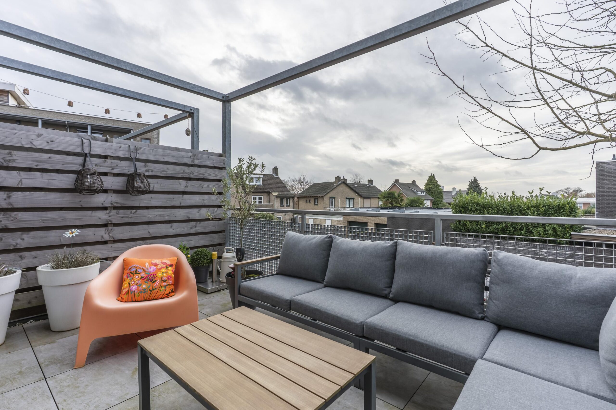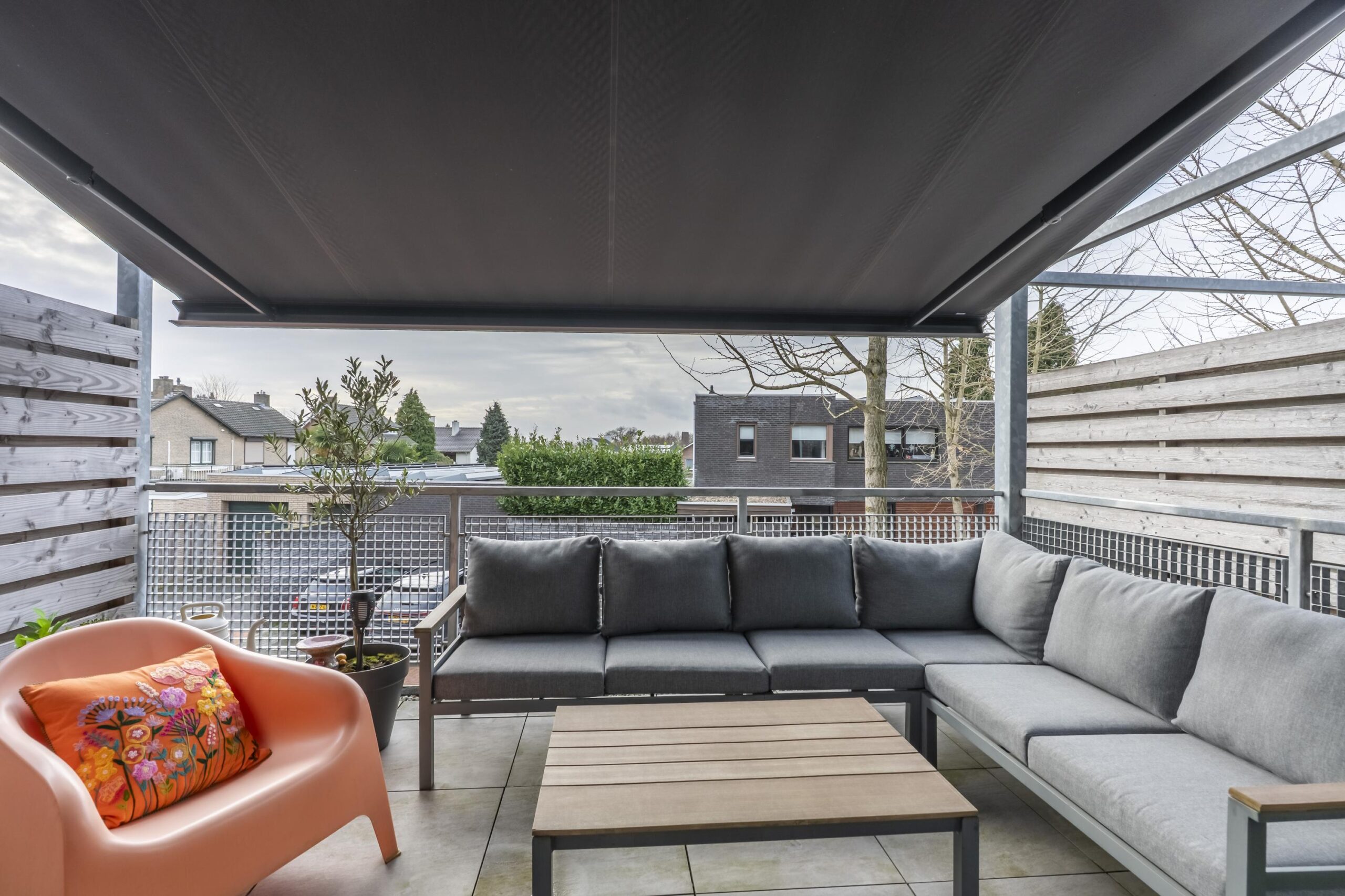 Via openslaande deuren met ingebouwde hordeur bereikt men het royale dakterras, voorzien van keramische terrastegels en een elektrisch bedienbaar zonnescherm. Dankzij de westelijke ligging kan men hier heerlijk genieten van de middag- en avondzon.