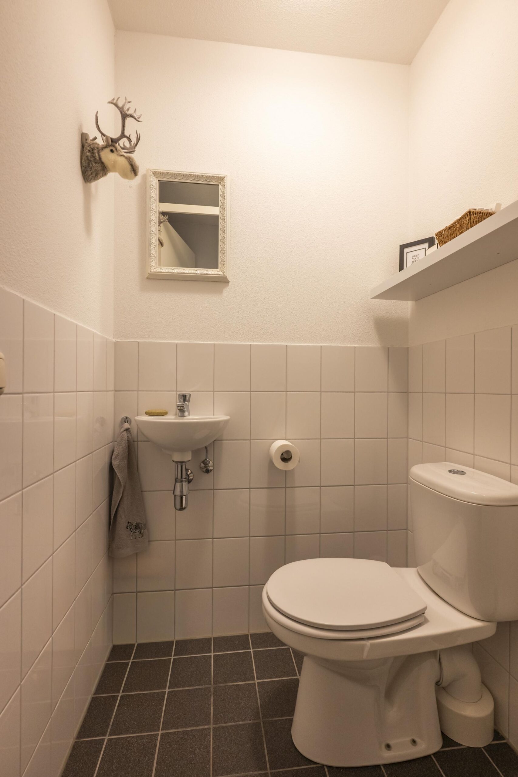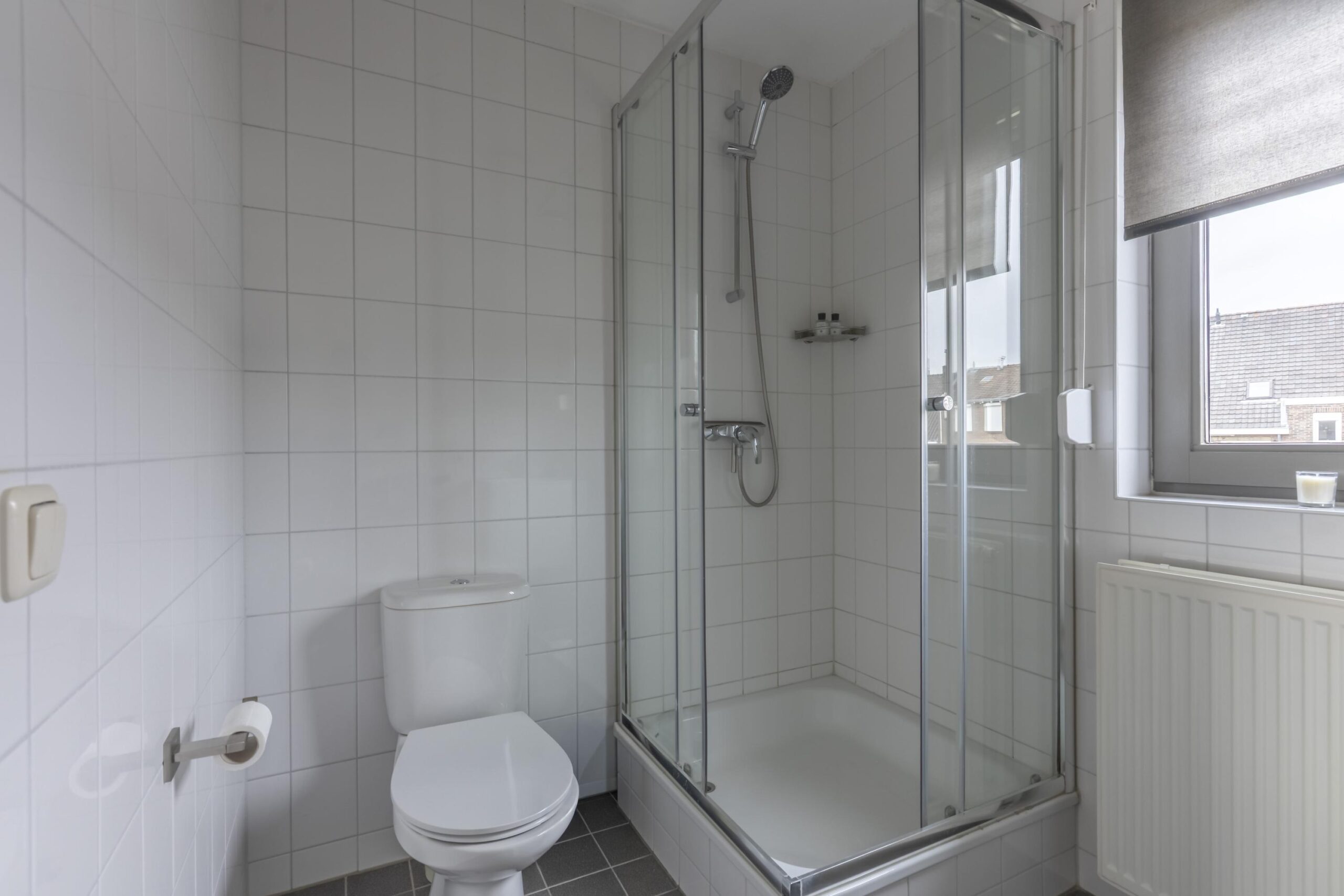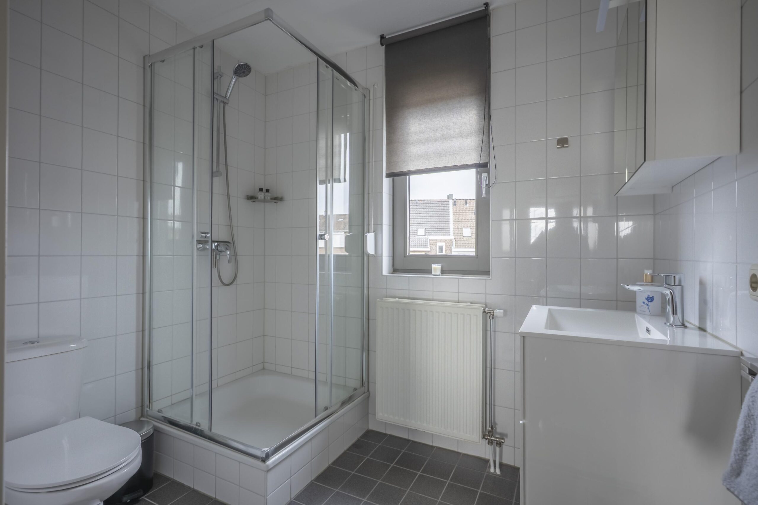 De volledig betegelde en verzorgde badkamer beschikt over een douche met douchedeuren, een tweede toilet, wastafel met modern wit hoogglans badmeubel, radiator en een raam voor ventilatie en daglicht. Daarnaast bevindt zich op deze verdieping een separate cv-ruimte met de combiketel (Remeha HR, CW4, bouwjaar 2021, eigendom) en de mechanische ventilatie.