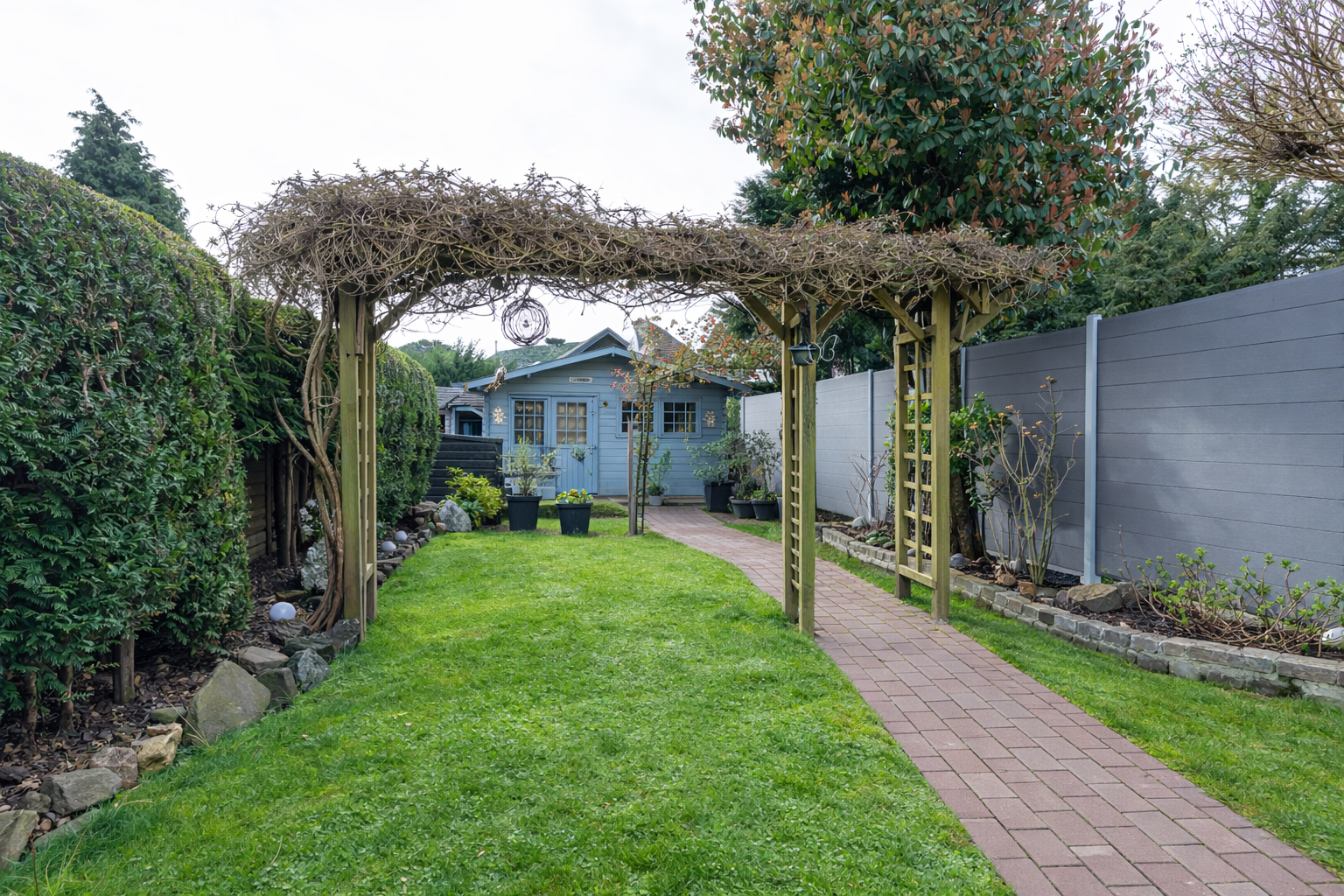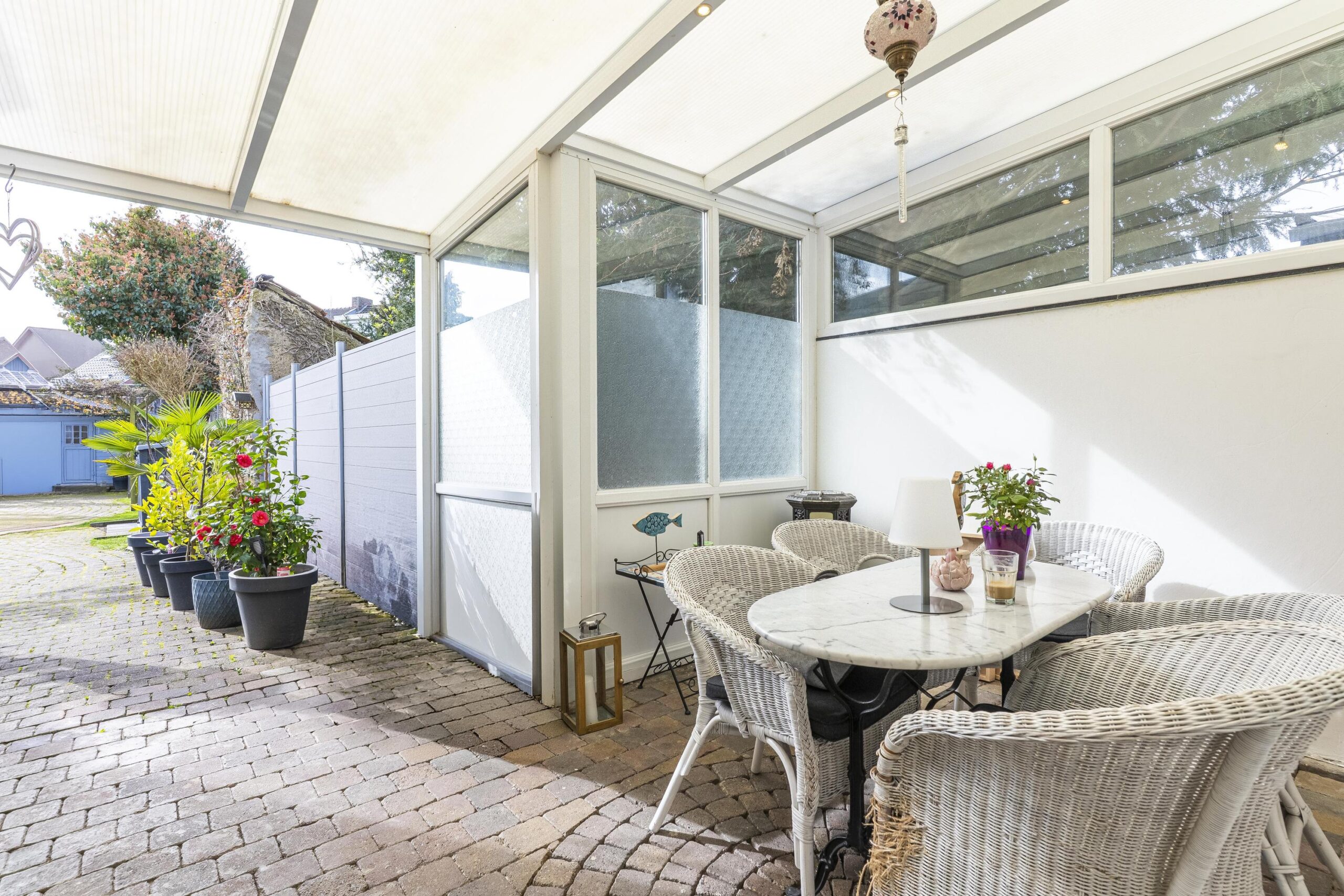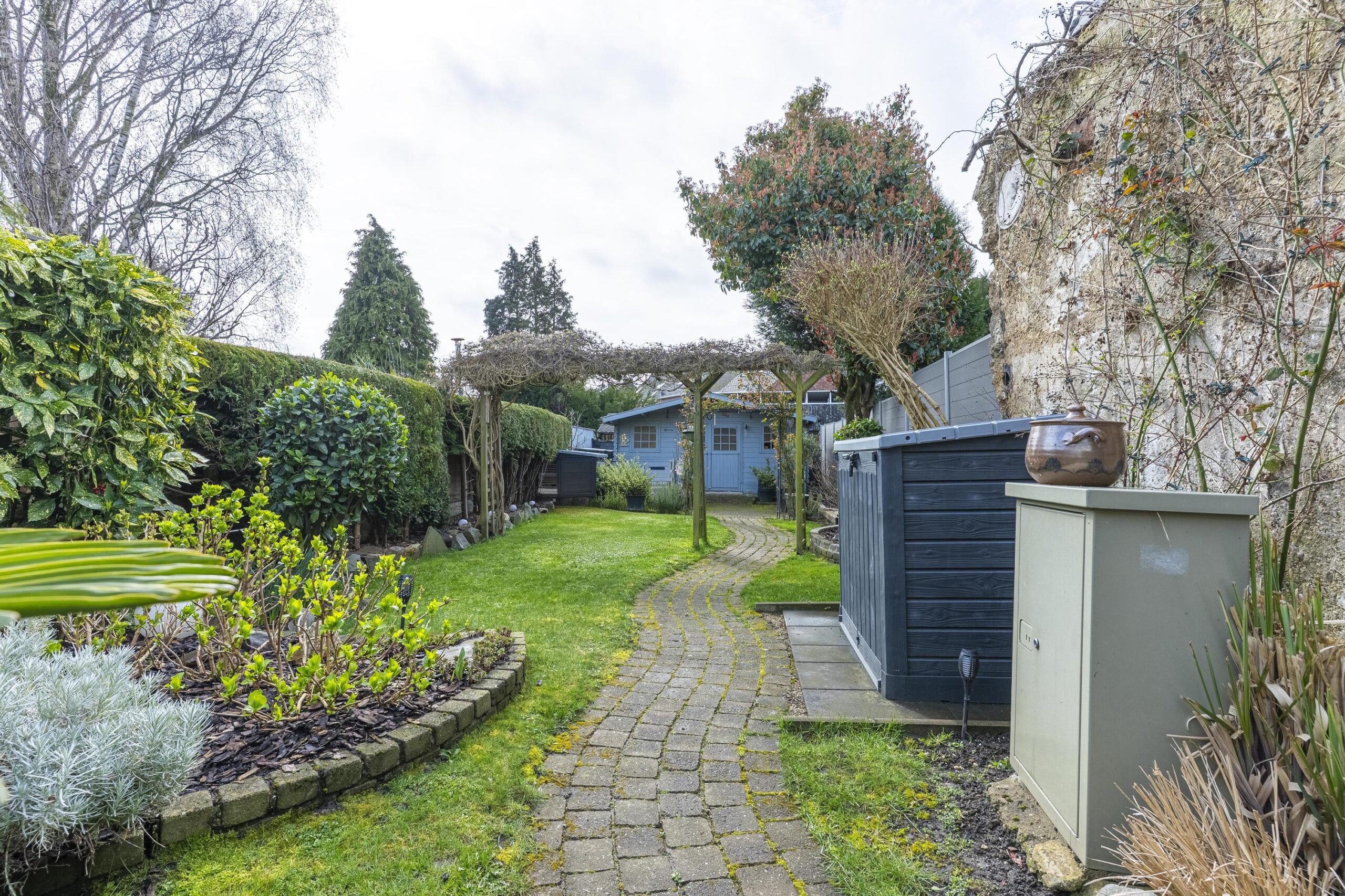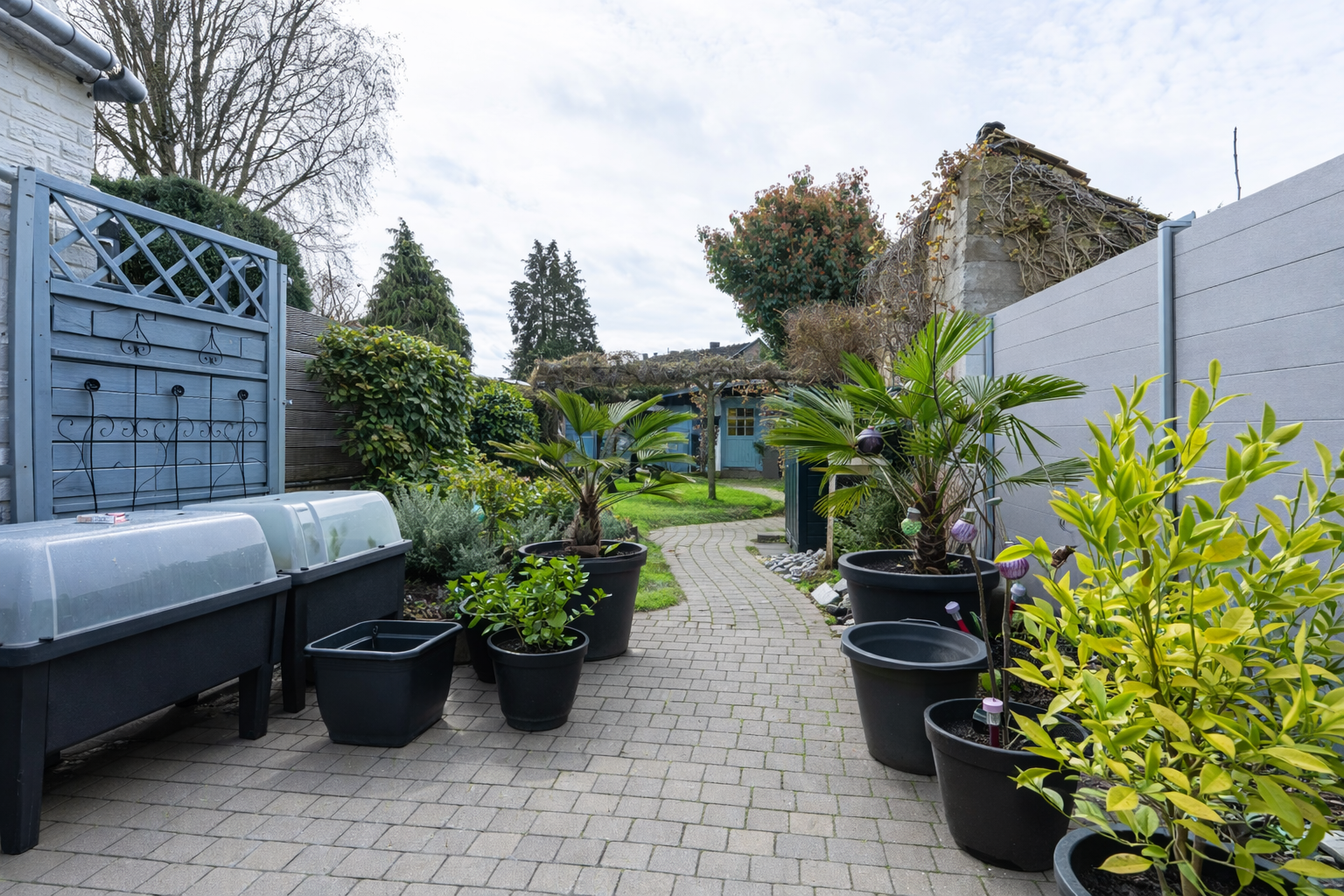 De tuin met overdekt terras, stenen berging en tuinhuis is heerlijk zonnig en gelegen op het zuiden.