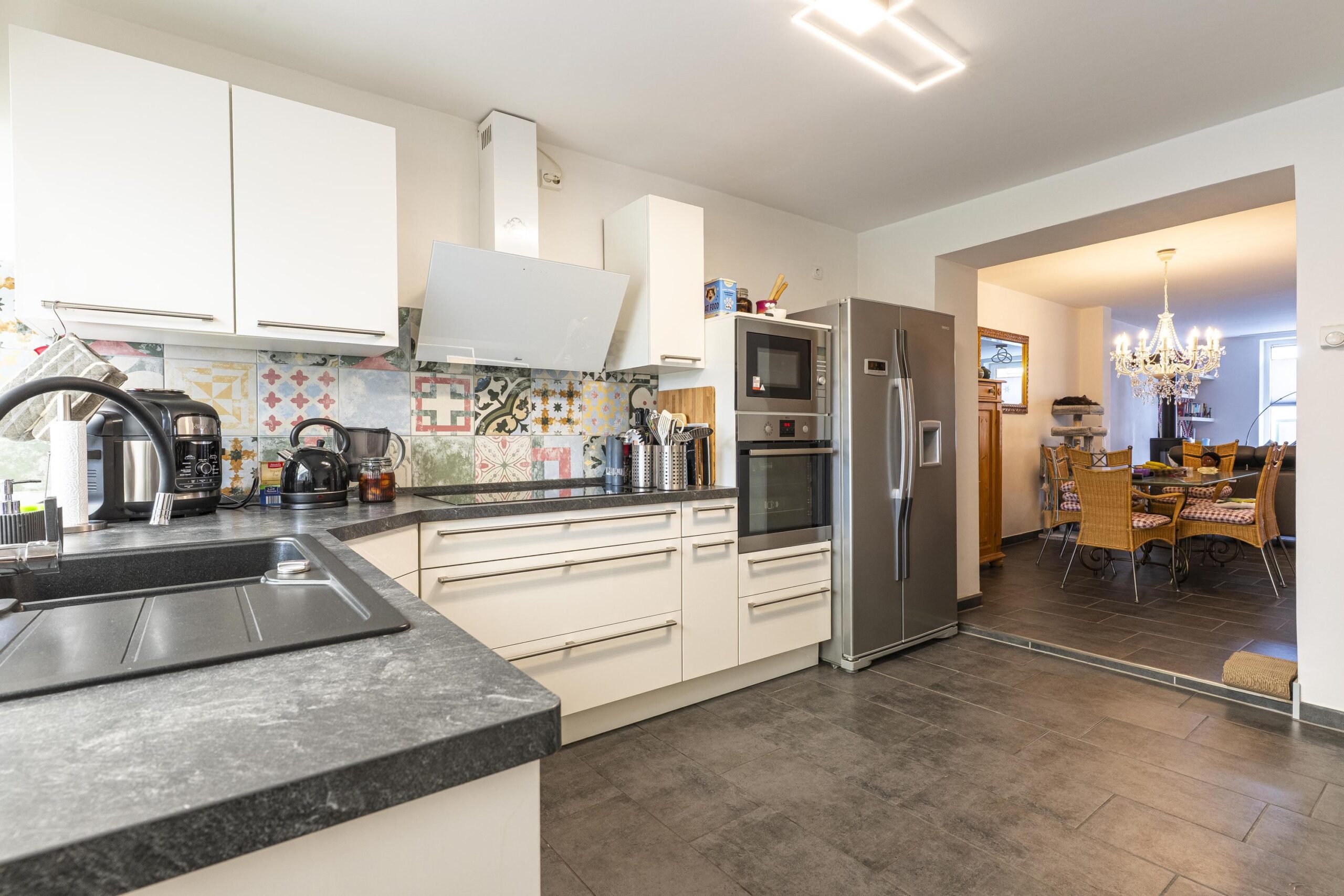 De open keuken is groot ca. 12 m² en is voorzien van een L-vormige keukenopstelling met de navolgende apparatuur: