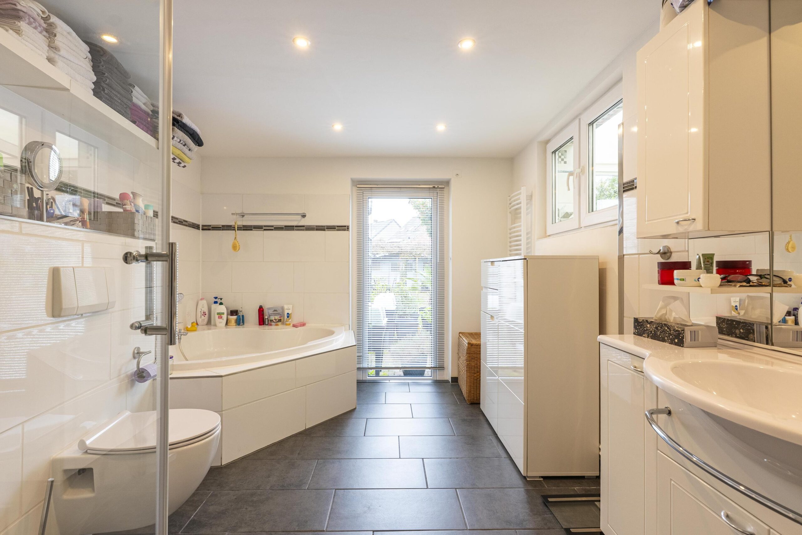 De badkamer is groot ca. 11 m² en is voorzien van een hoekbad, douche, zwevend toilet en vaste wastafel met ombouw.