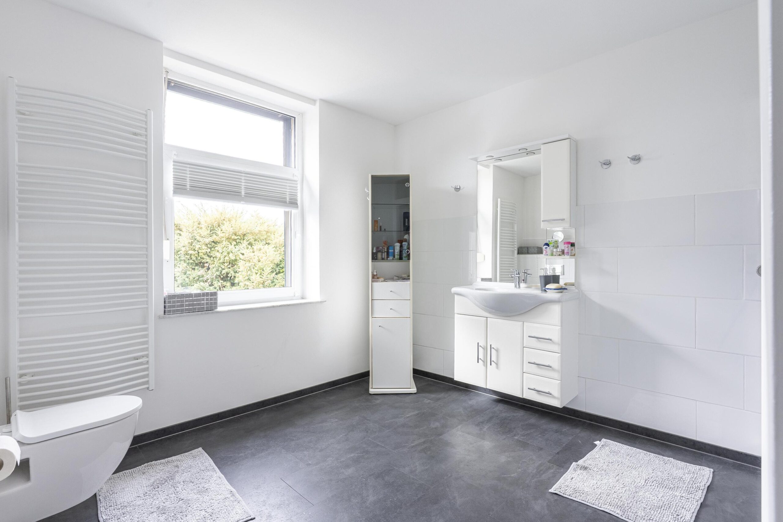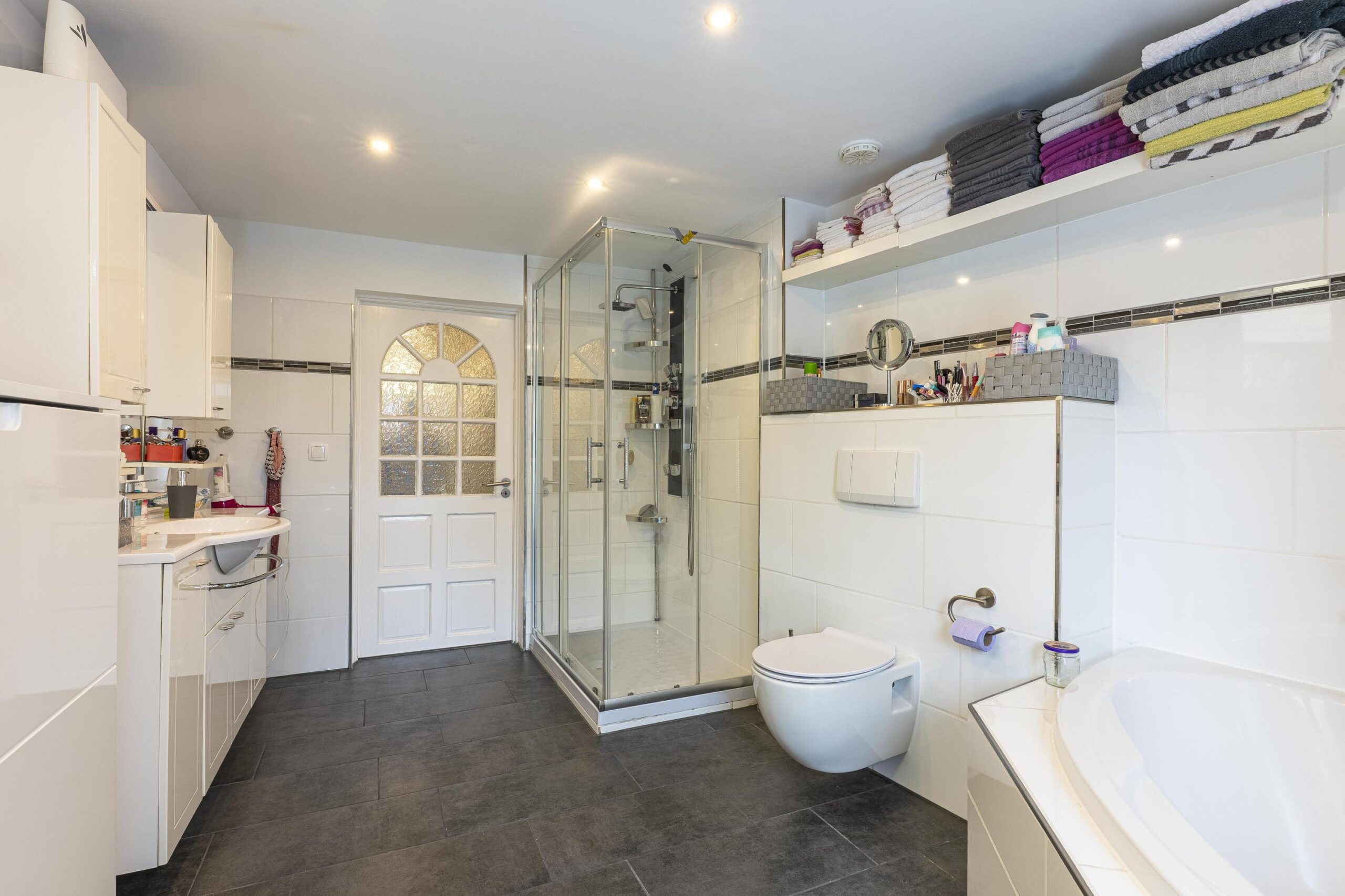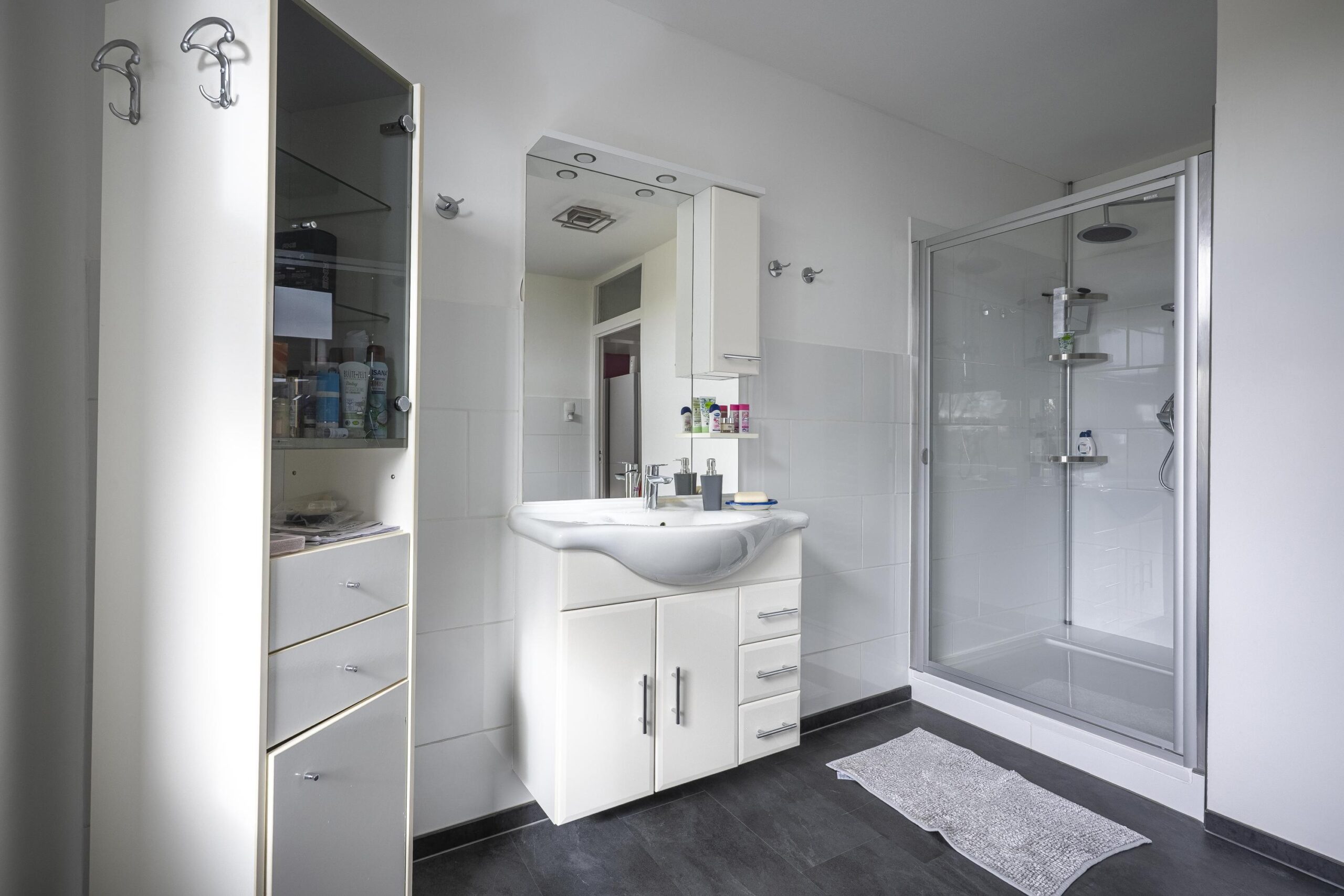 De gedeeltelijk betegelde badkamer is groot ca. 10 m² en is voorzien van een ruime douche, vaste wastafel en een zwevend toilet.