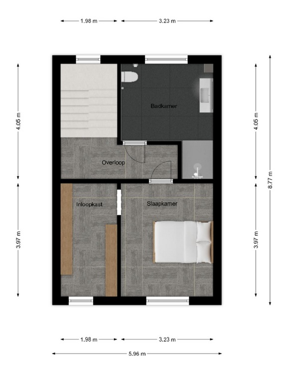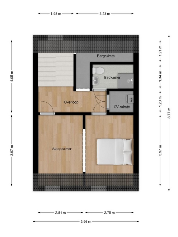 Middels de overloop is de slaapkamer alsmede de badkamer te bereiken.