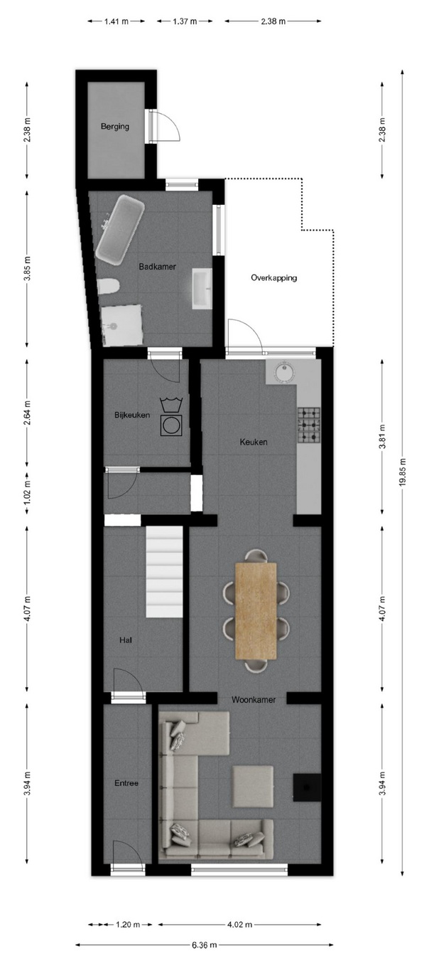 Middels de hal/entree met meterkast en trapopgang heeft u toegang tot de bijkeuken alsmede tot de woonkamer.