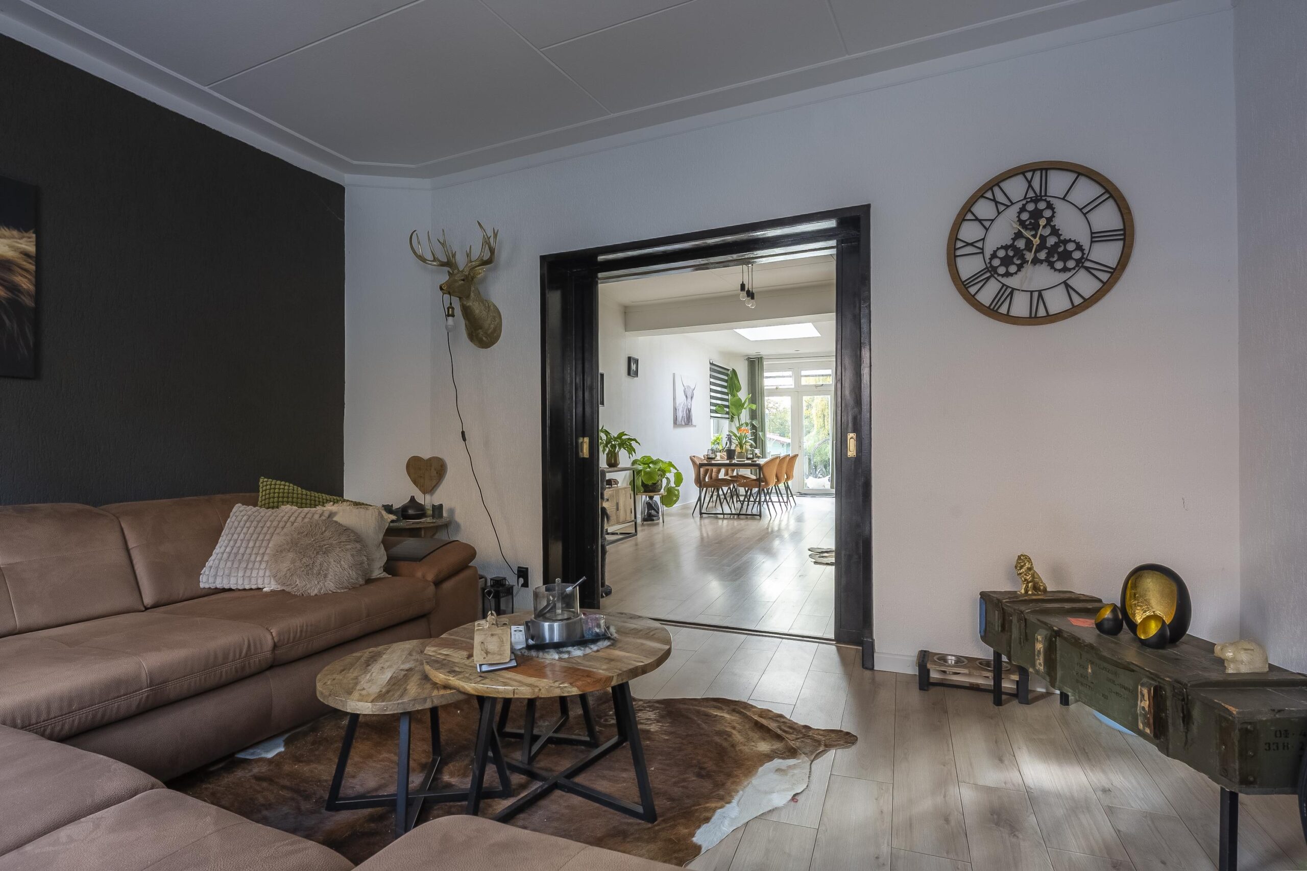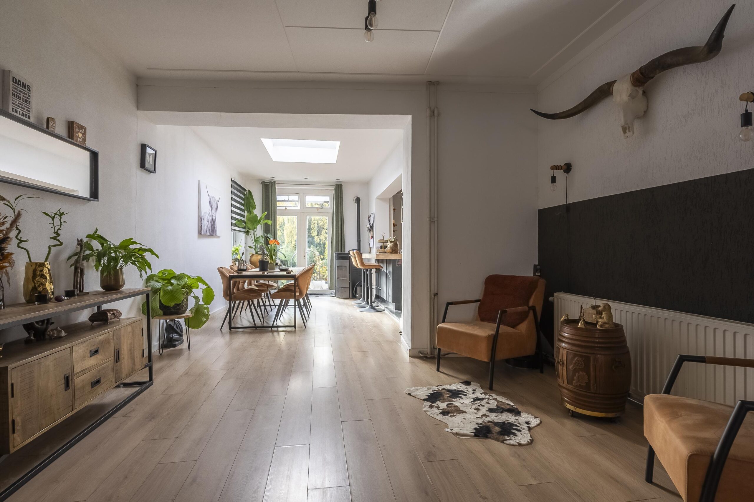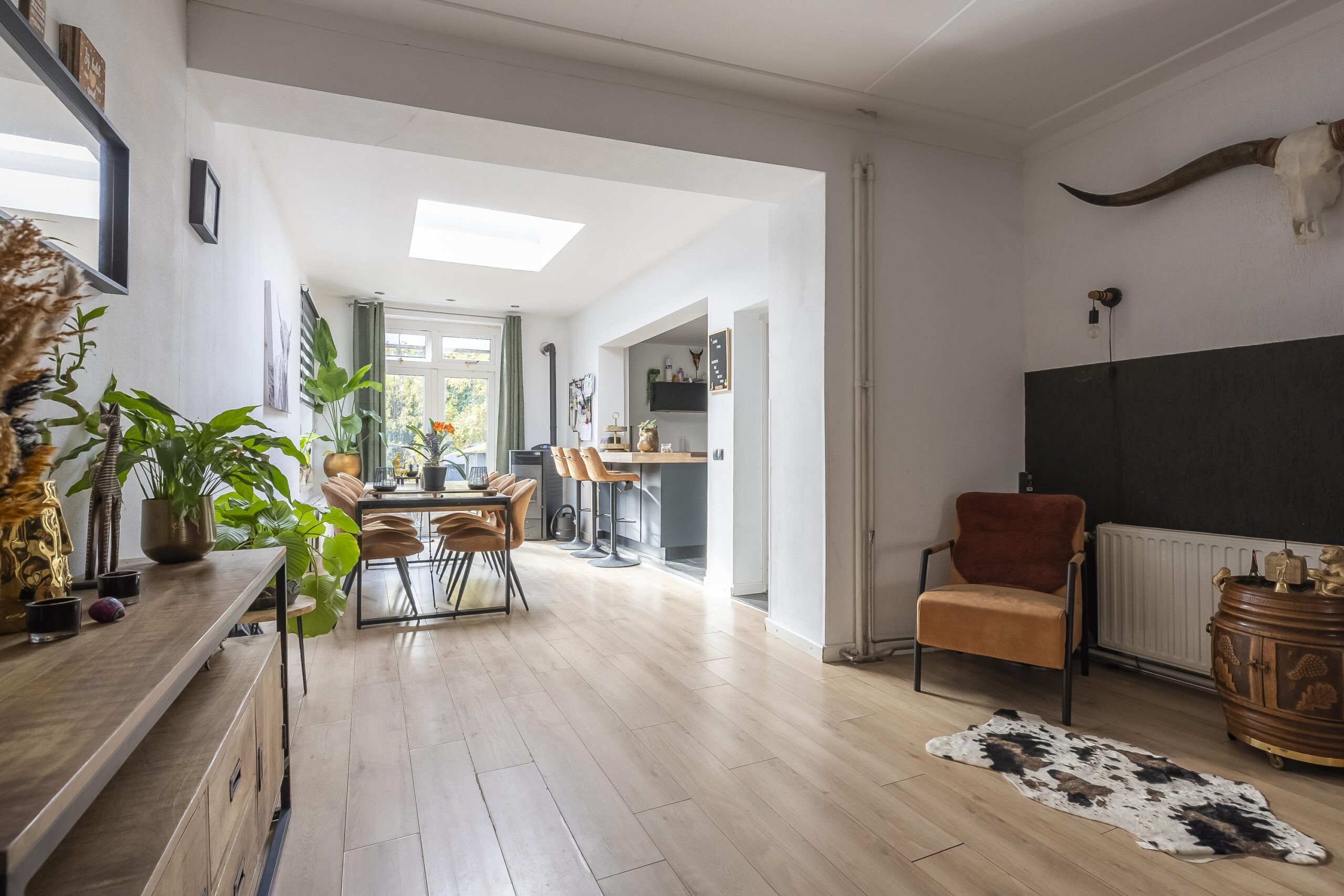 De royale woonkamer met open keuken groot ca. 63 m² en voorzien van authentieke ensuite deuren en openslaande deuren naar de achtertuin.