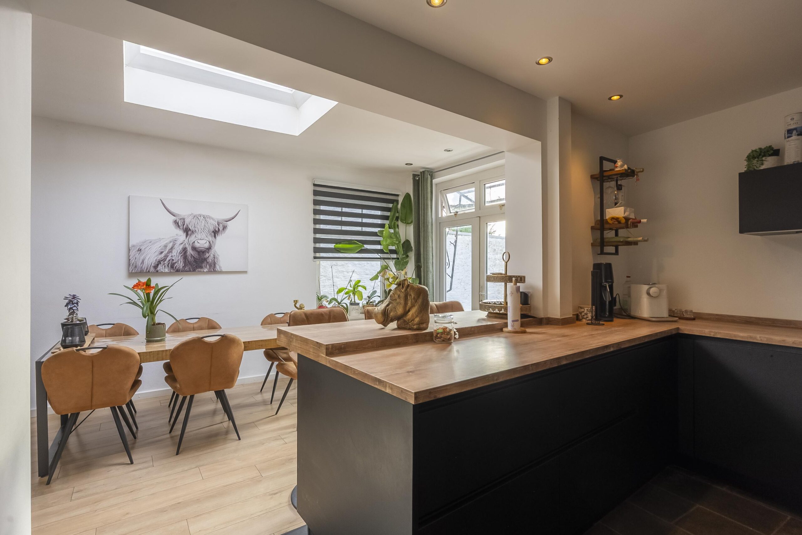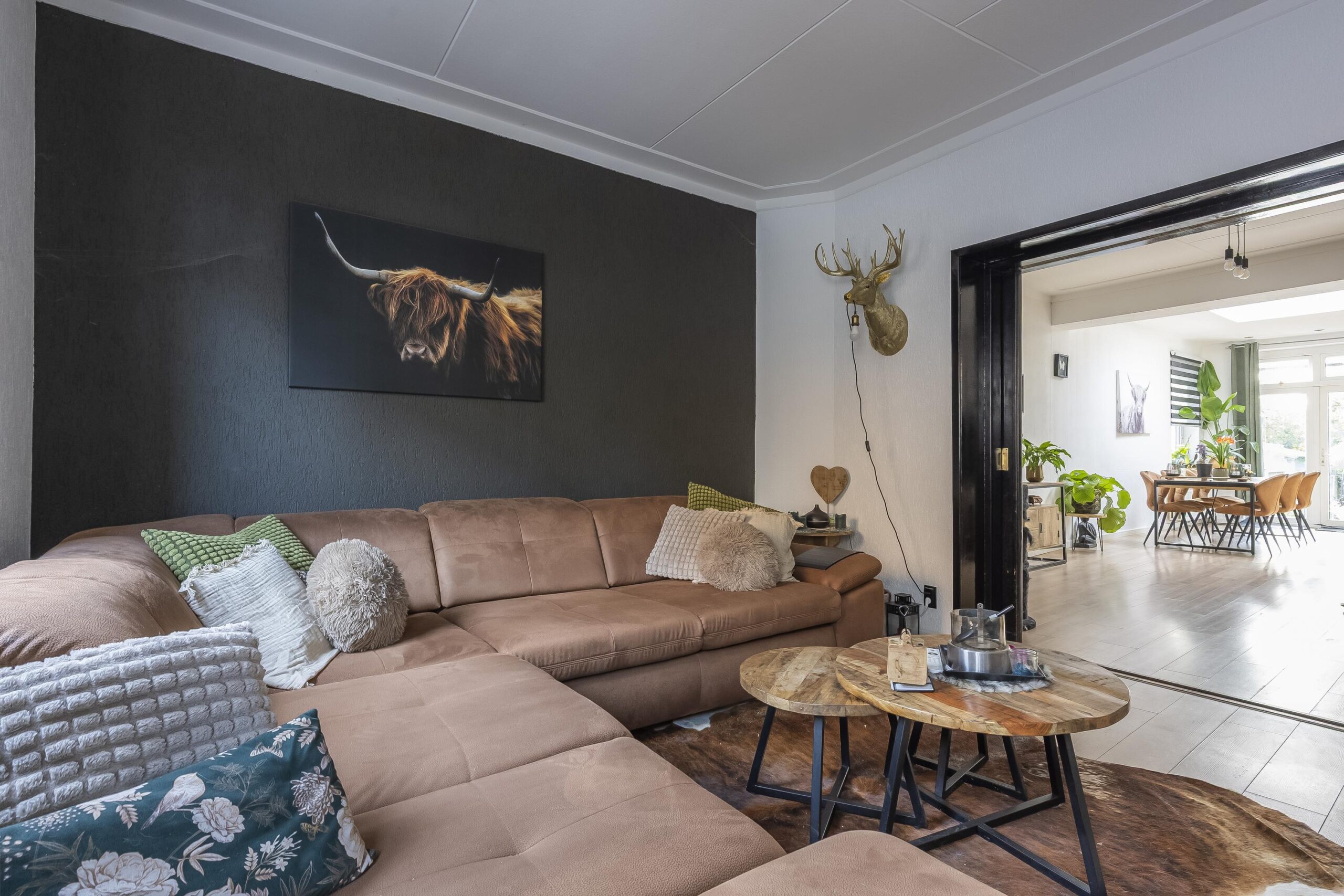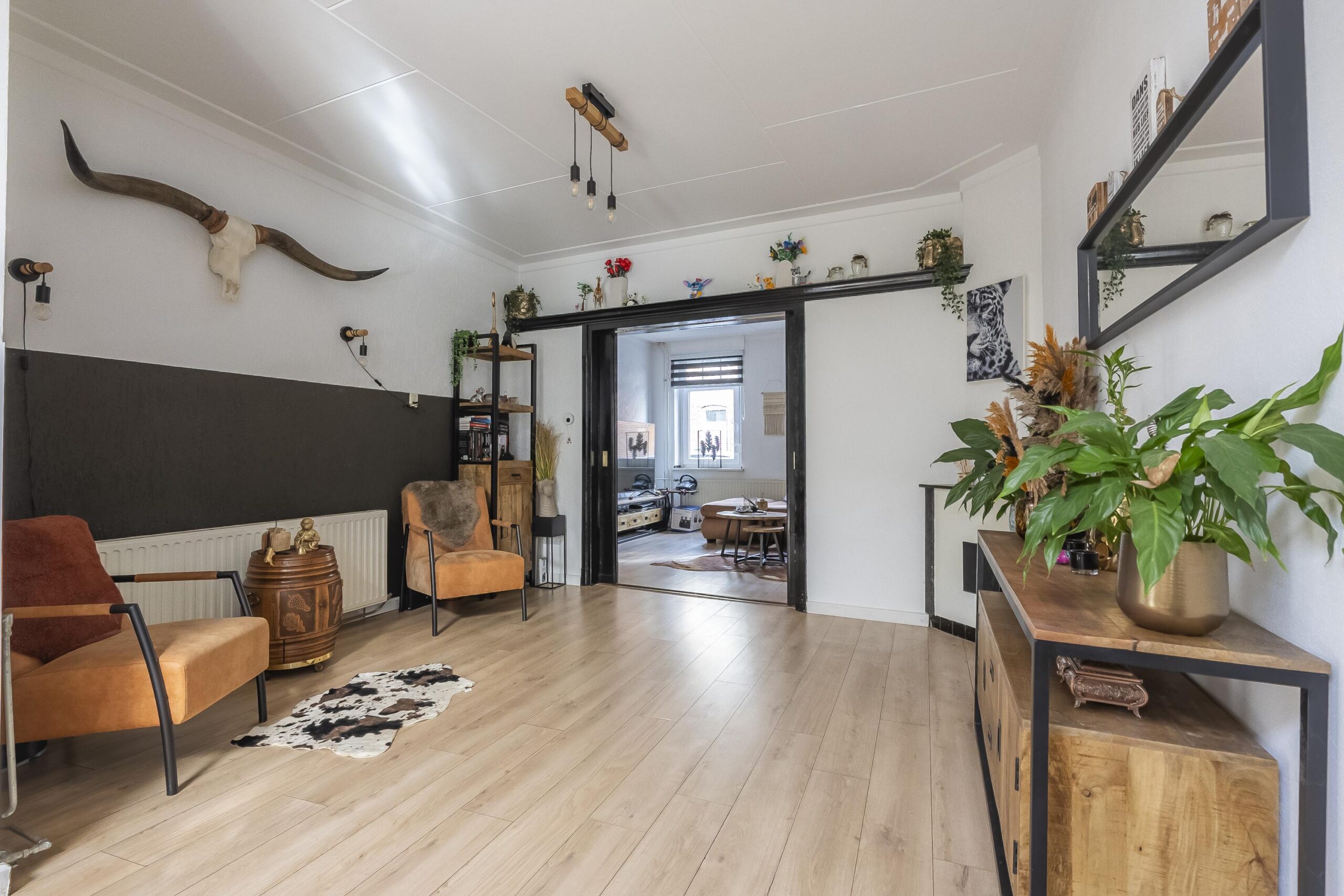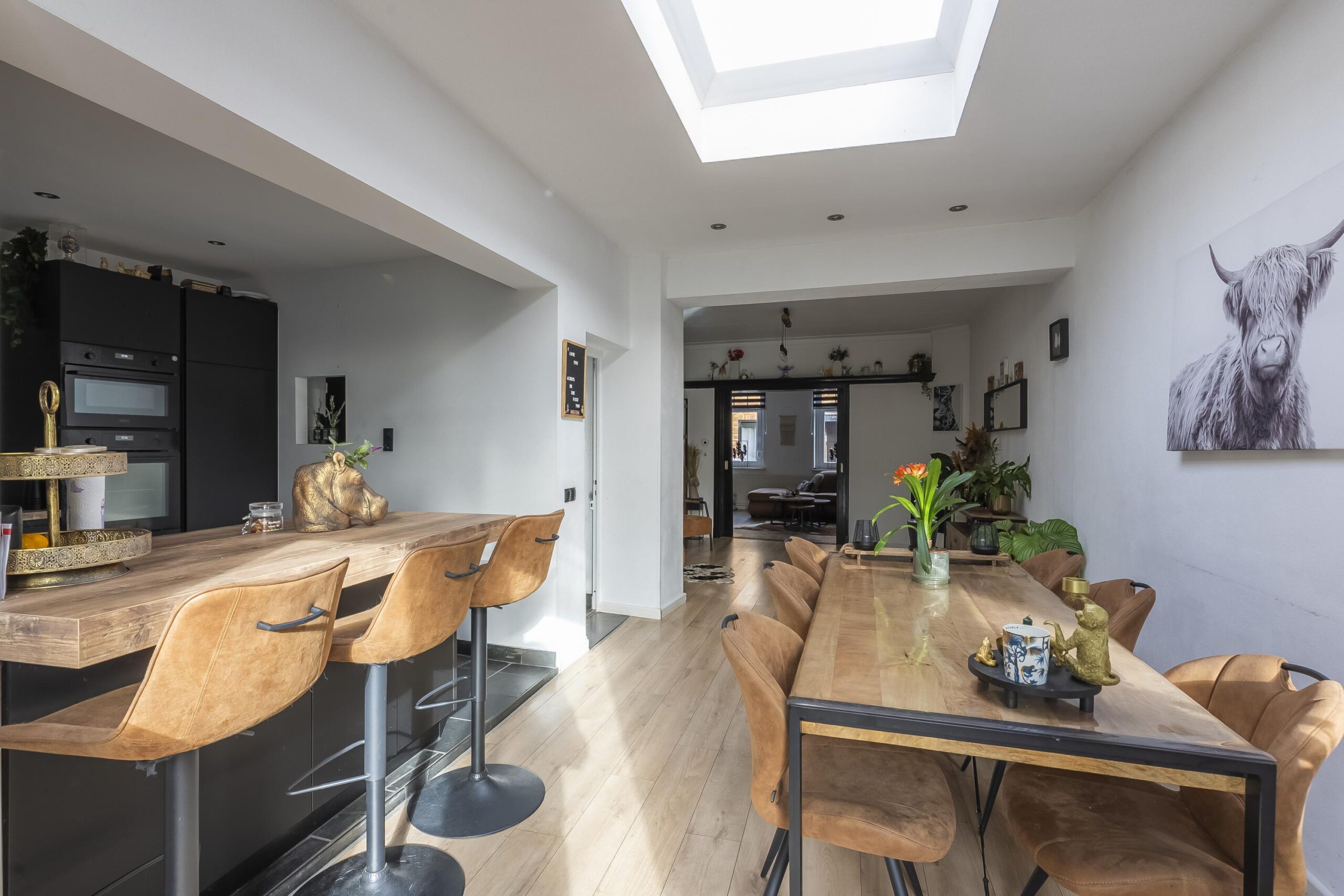 De royale woonkamer met open keuken groot ca. 63 m² en voorzien van authentieke ensuite deuren en openslaande deuren naar de achtertuin.