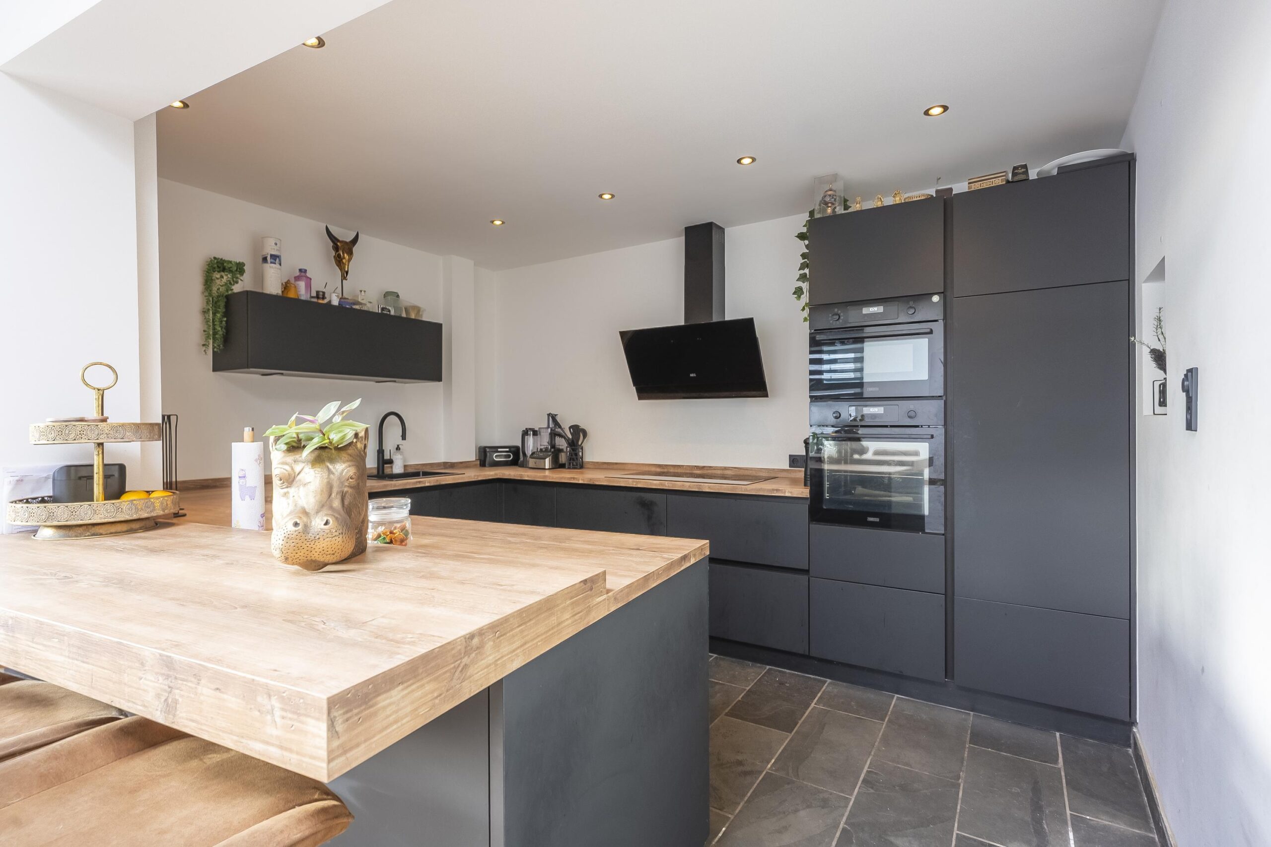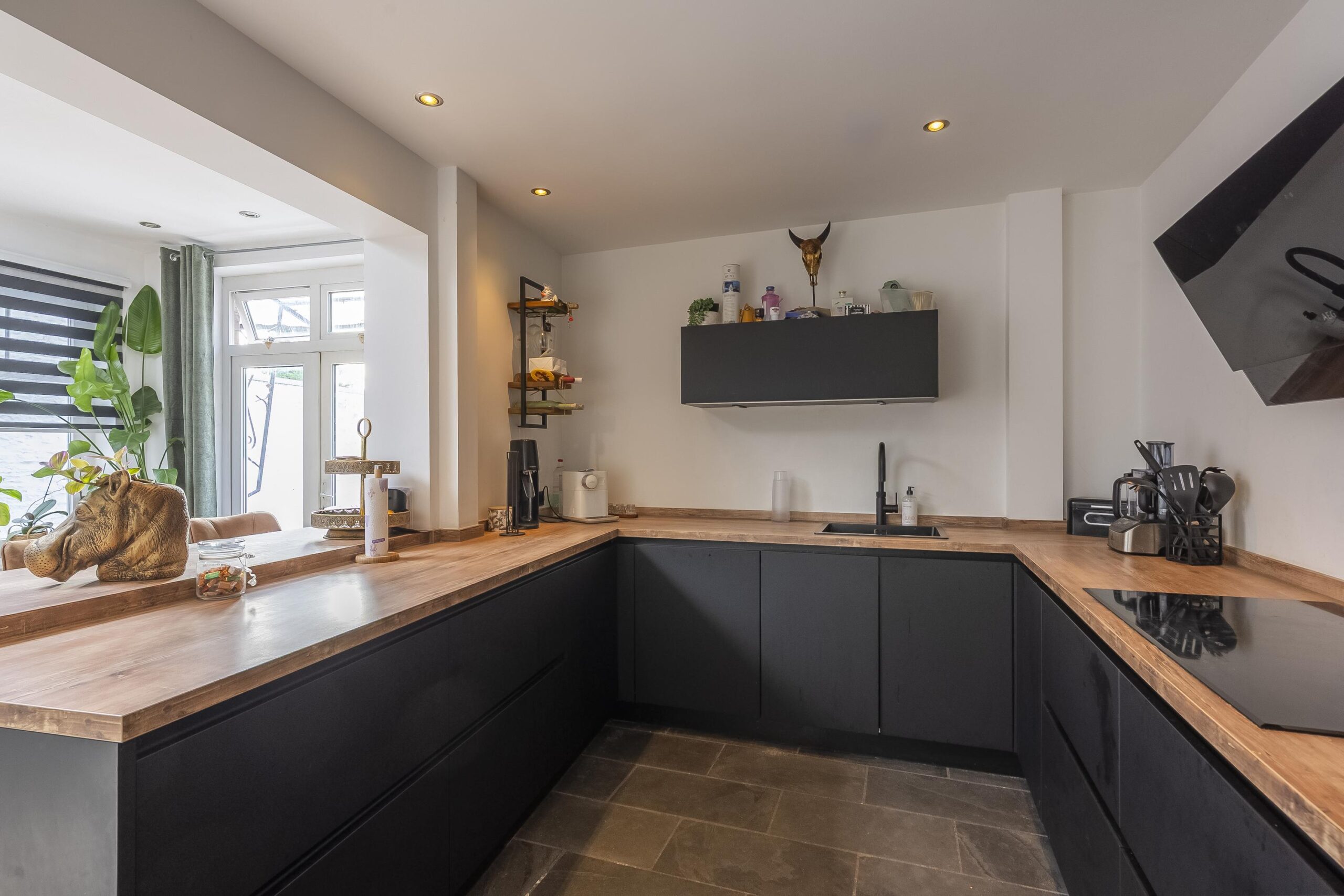 De moderne U-vormige keukenopstelling met ontbijtbarretje is voorzien van de navolgende apparatuur: inductiekookplaat, afzuigkap, vaatwasser, oven, combimagnetron en koelkast.