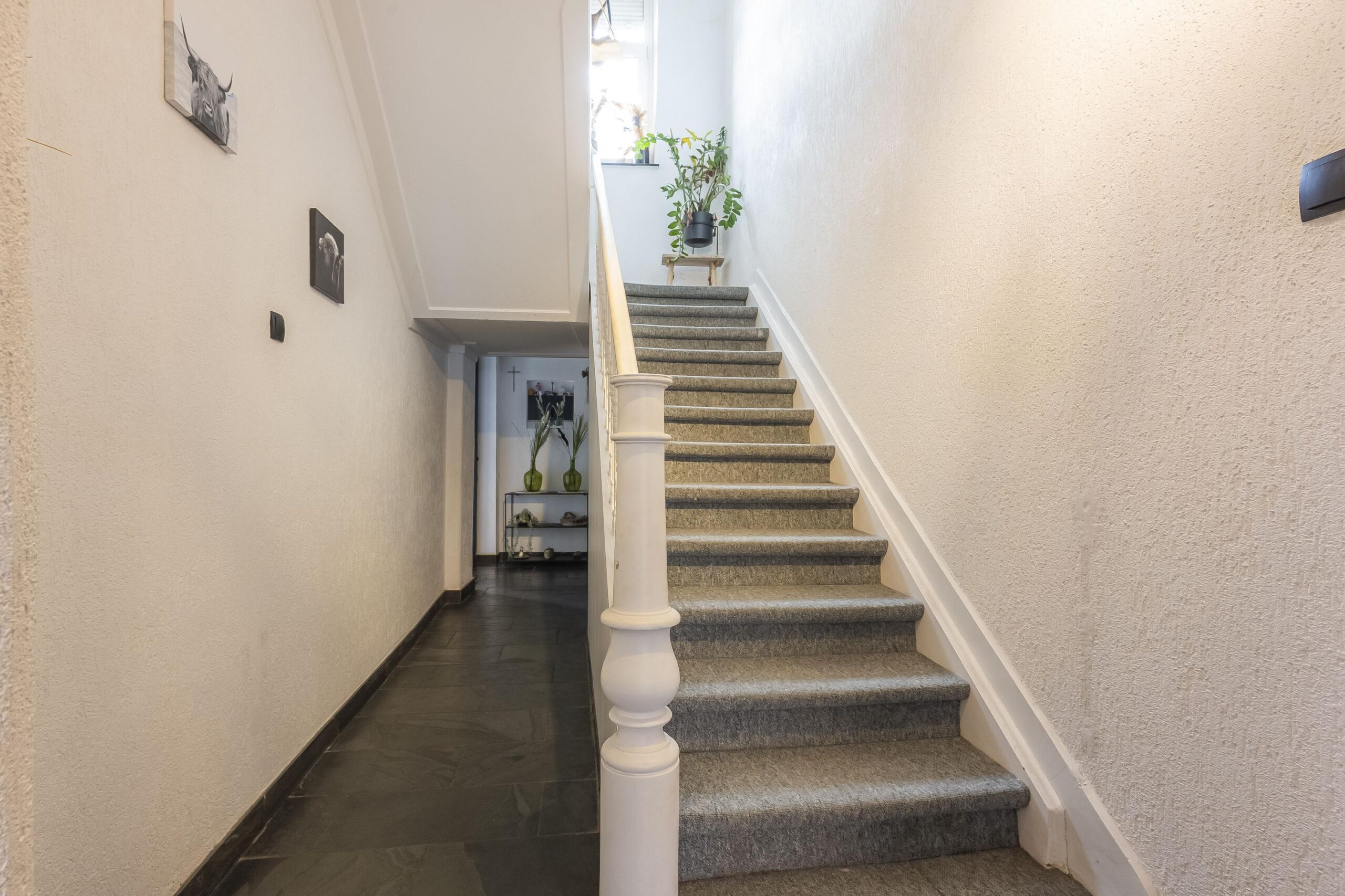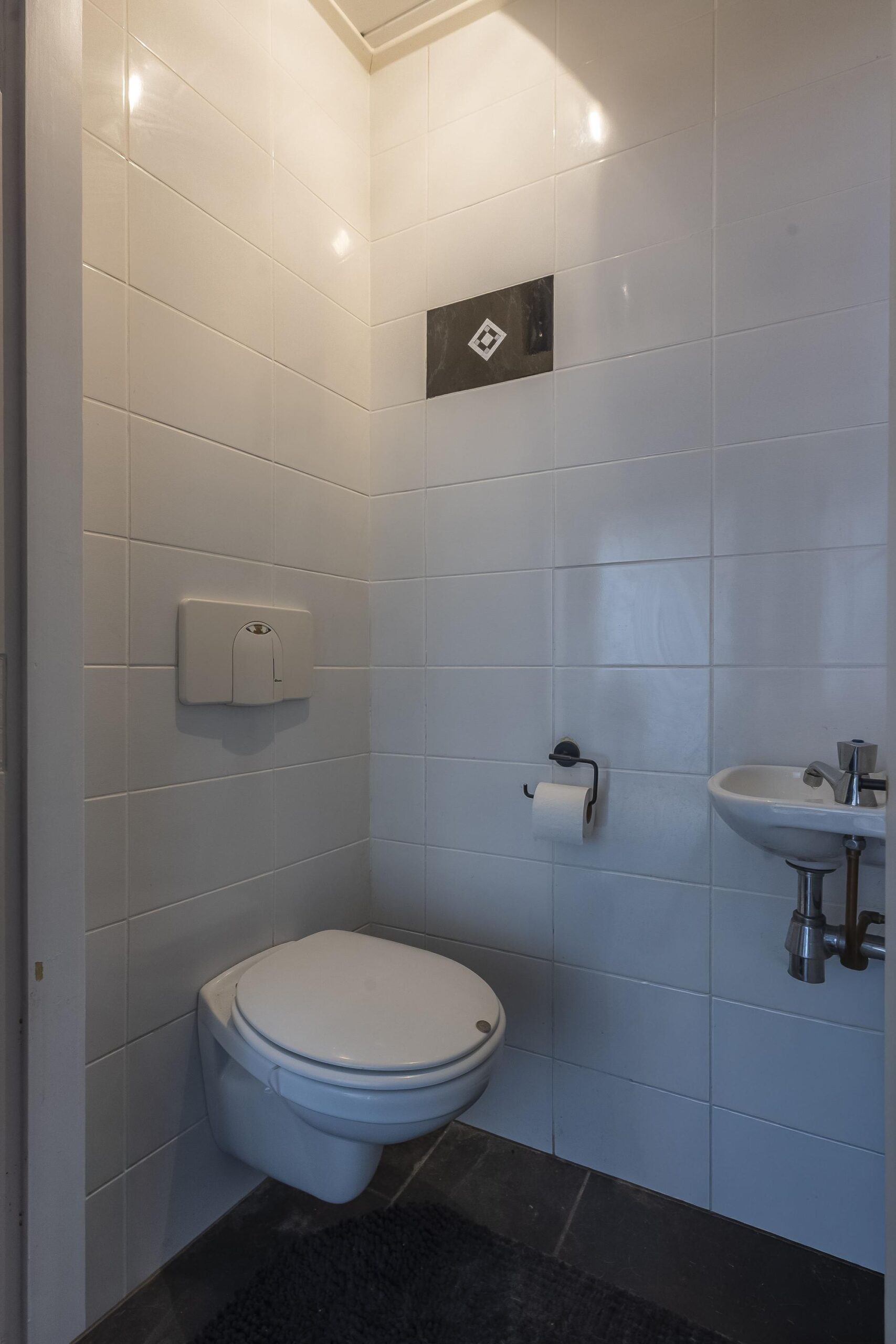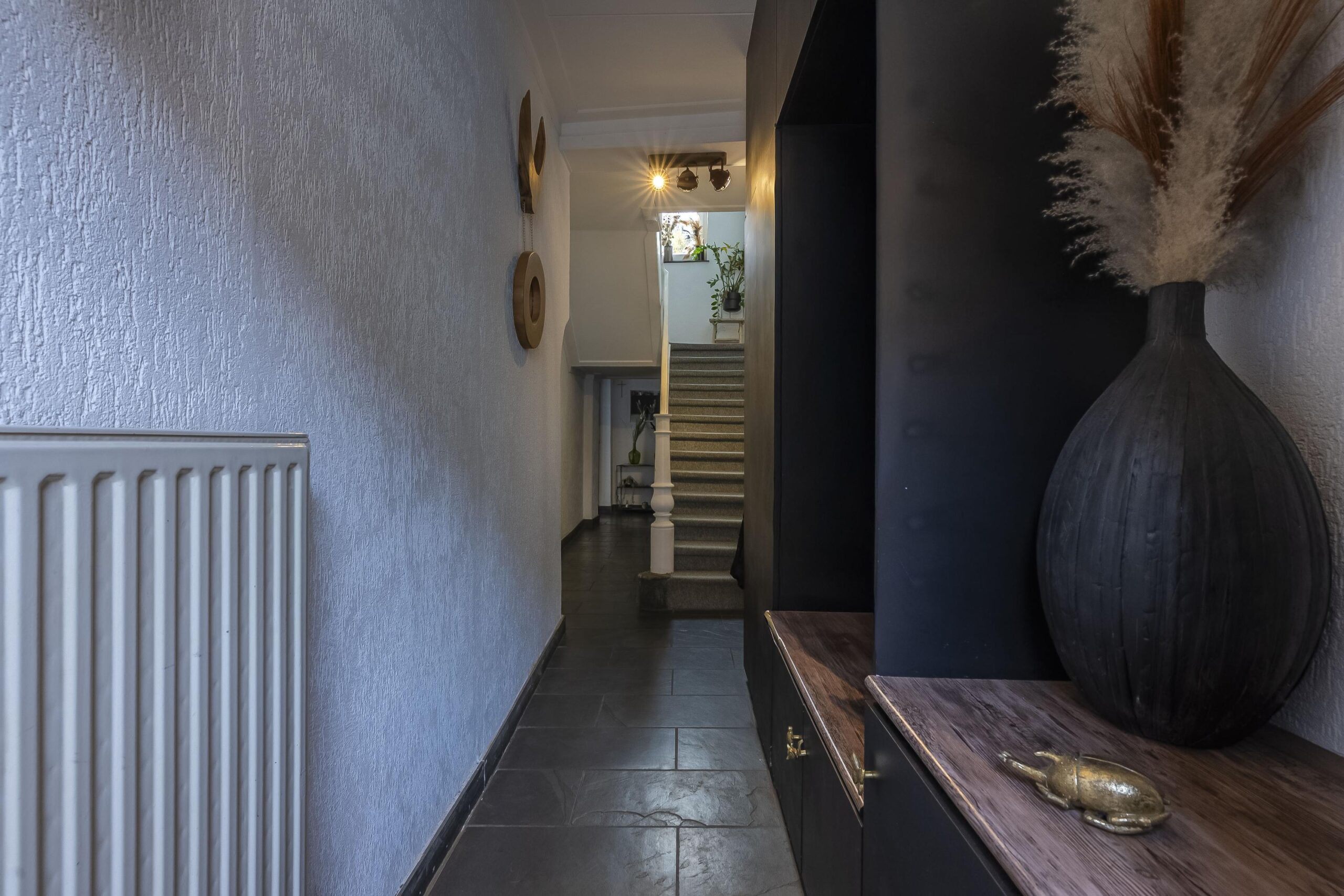 Entree. De hal met meterkast, trapopgang en gastentoilet met zwevend toilet en fonteintje biedt toegang tot de woonkamer.