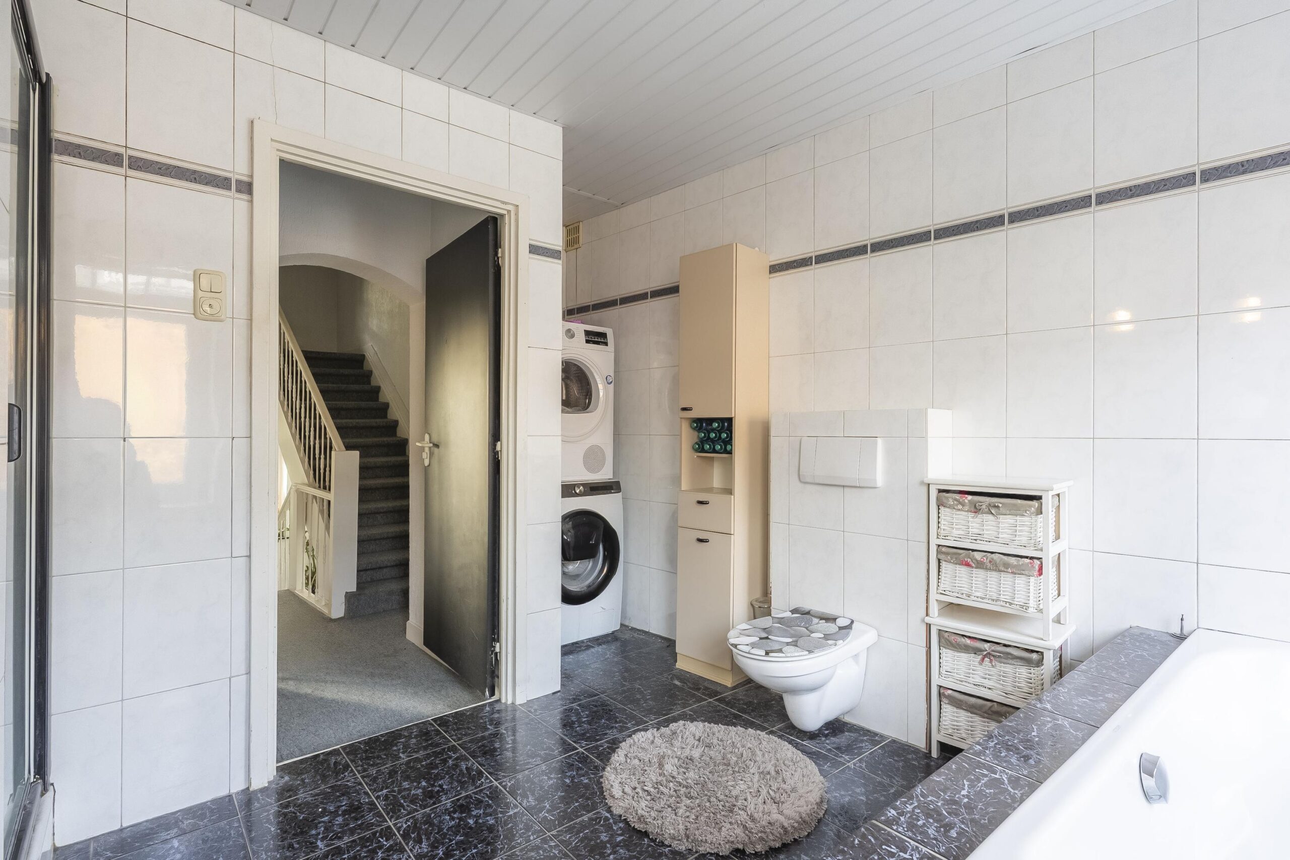 De ruime badkamer is groot ca. 11 m² en voorzien van een ligbad, douche, zwevend toilet, dubbele wastafel en de witgoedaansluitingen.