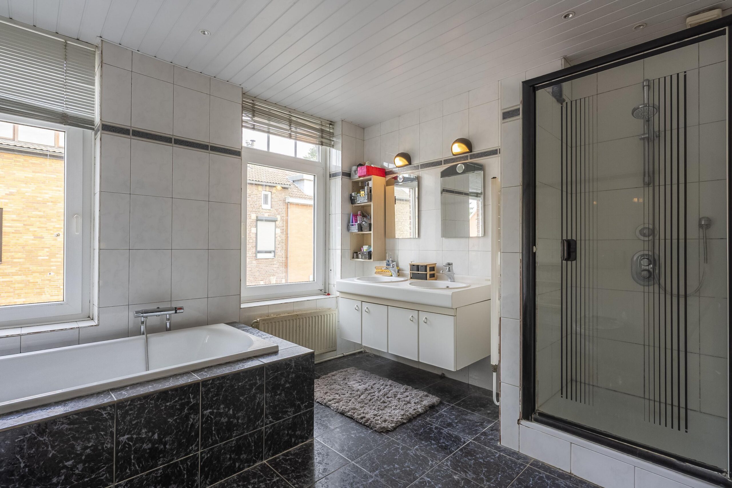 - Badkamervoorzieningen Ligbad, toilet, douche, dubbele wastafel, wasmachineaansluiting