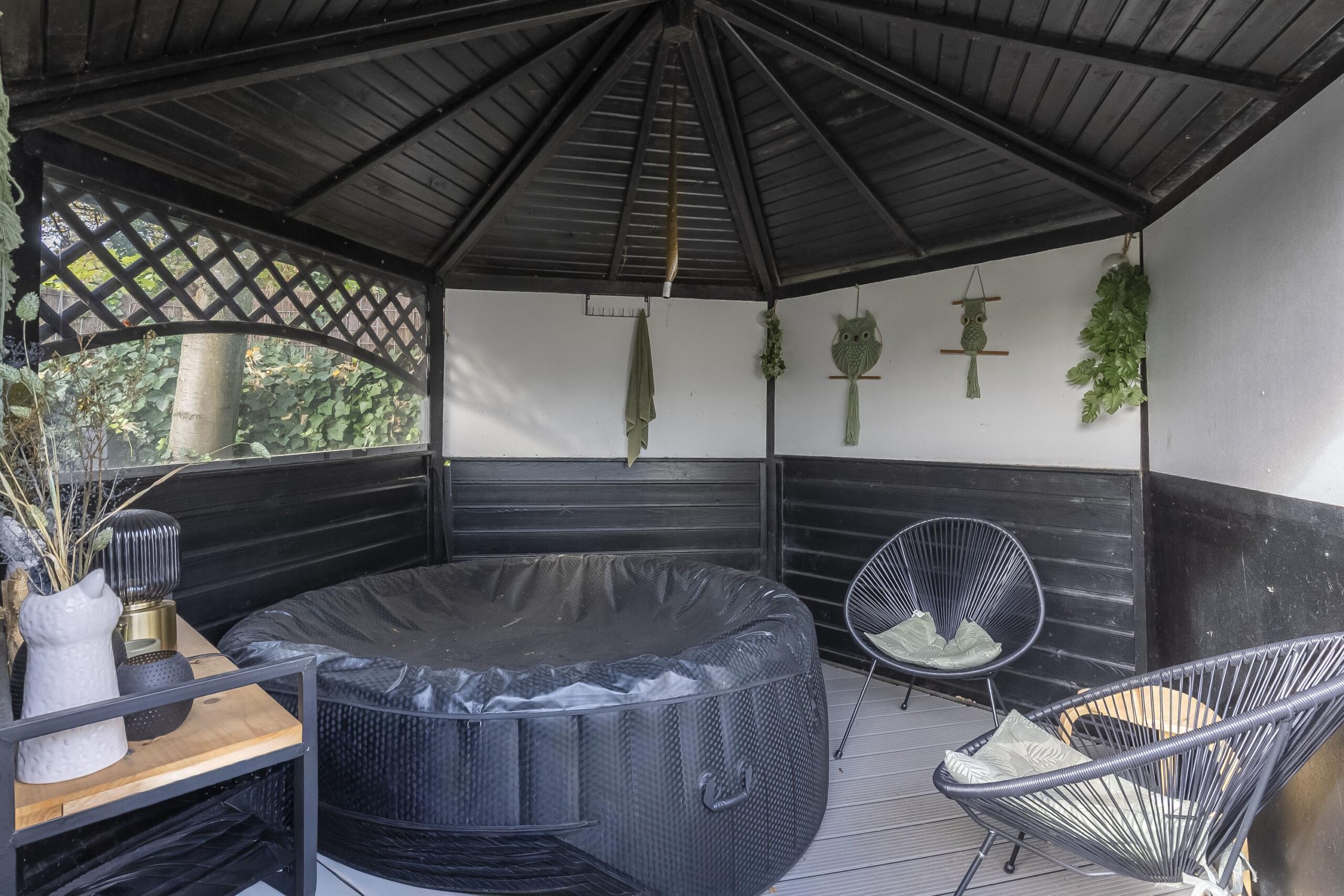 De gezellige tuin is voorzien van een ruim gazon, een stenen berging (op dit moment in gebruik als thuisgym) en een gezellige overkapping met jacuzzi.