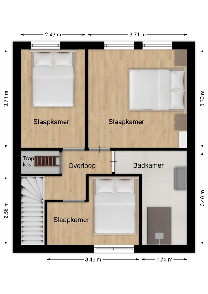 De slaapkamer aan de voorzijde (ca. 7 m²) is voorzien van rolluiken. De twee slaapkamers aan de achterzijde meten respectievelijk ca. 9 m² en ca. 14 m².