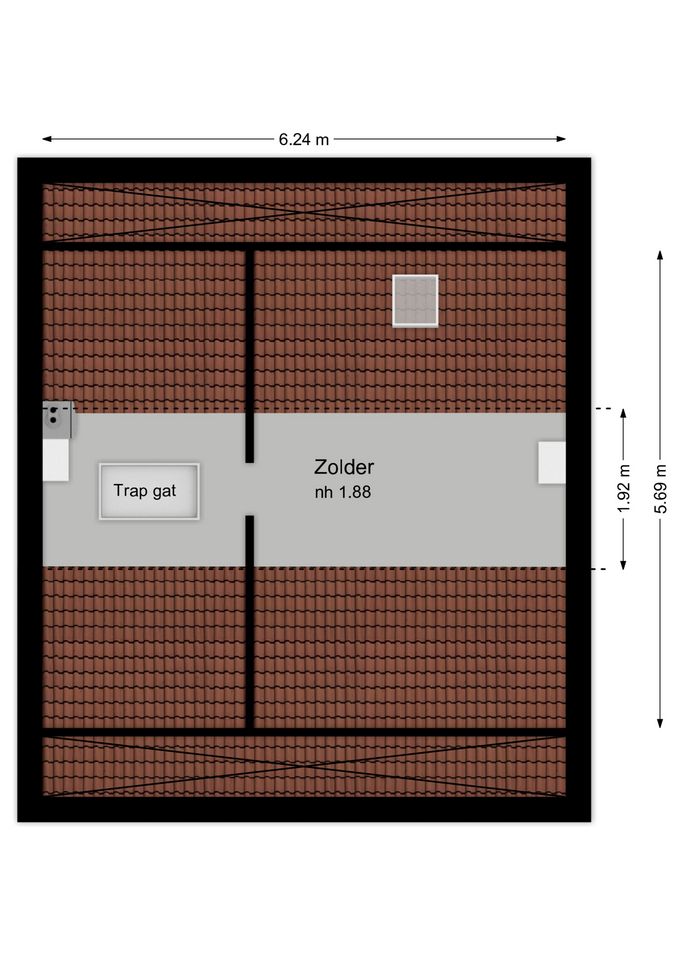 Via een trap in de bergingskast op de overloop is de zolderverdieping (ca. 11 m²) bereikbaar. De zolder heeft een nokhoogte van circa 1,88 meter en hier bevindt zich tevens de cv-installatie (HR-107 combiketel, 2016, huur).