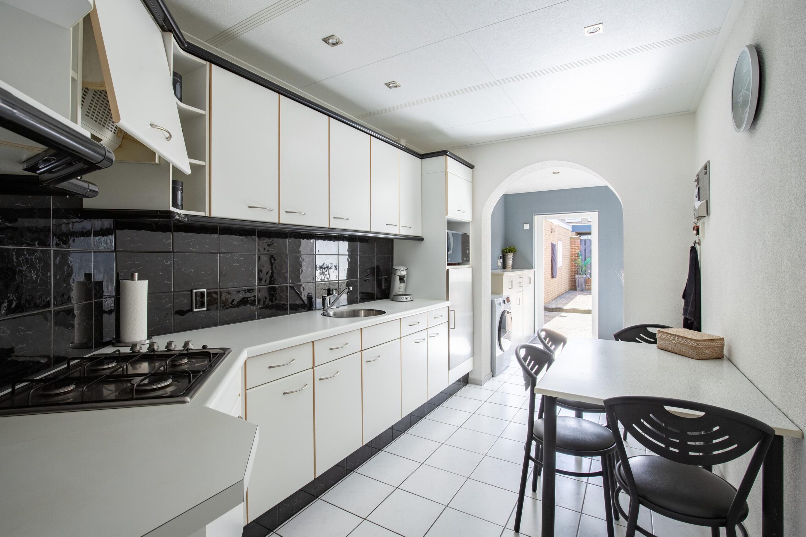 De gesloten keuken (ca. 9 m²) is zowel vanuit de hal als de woonkamer bereikbaar en opgesteld in een praktische hoekopstelling. De keuken is voorzien van diverse inbouwapparatuur, waaronder een 4-pits gasfornuis, afzuigkap, combi-oven en koelkast.