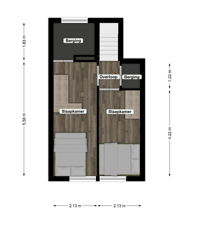 Vanuit de overloop met airco te bereiken slaapkamers (respectievelijk groot ca. 12m2 en 8m2) en bergruimte. De slaapkamer van 12m2 biedt tevens toegang tot een tweede bergruimte.