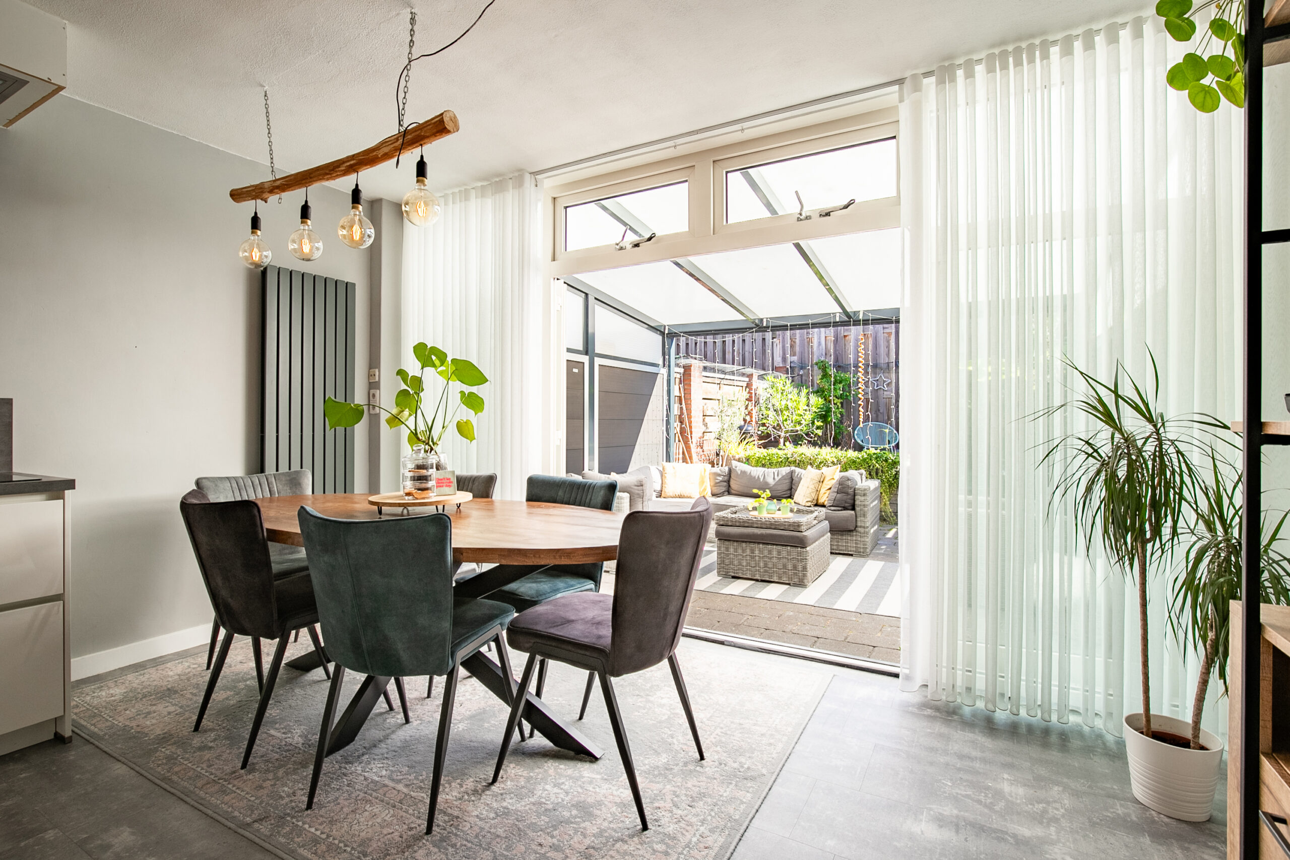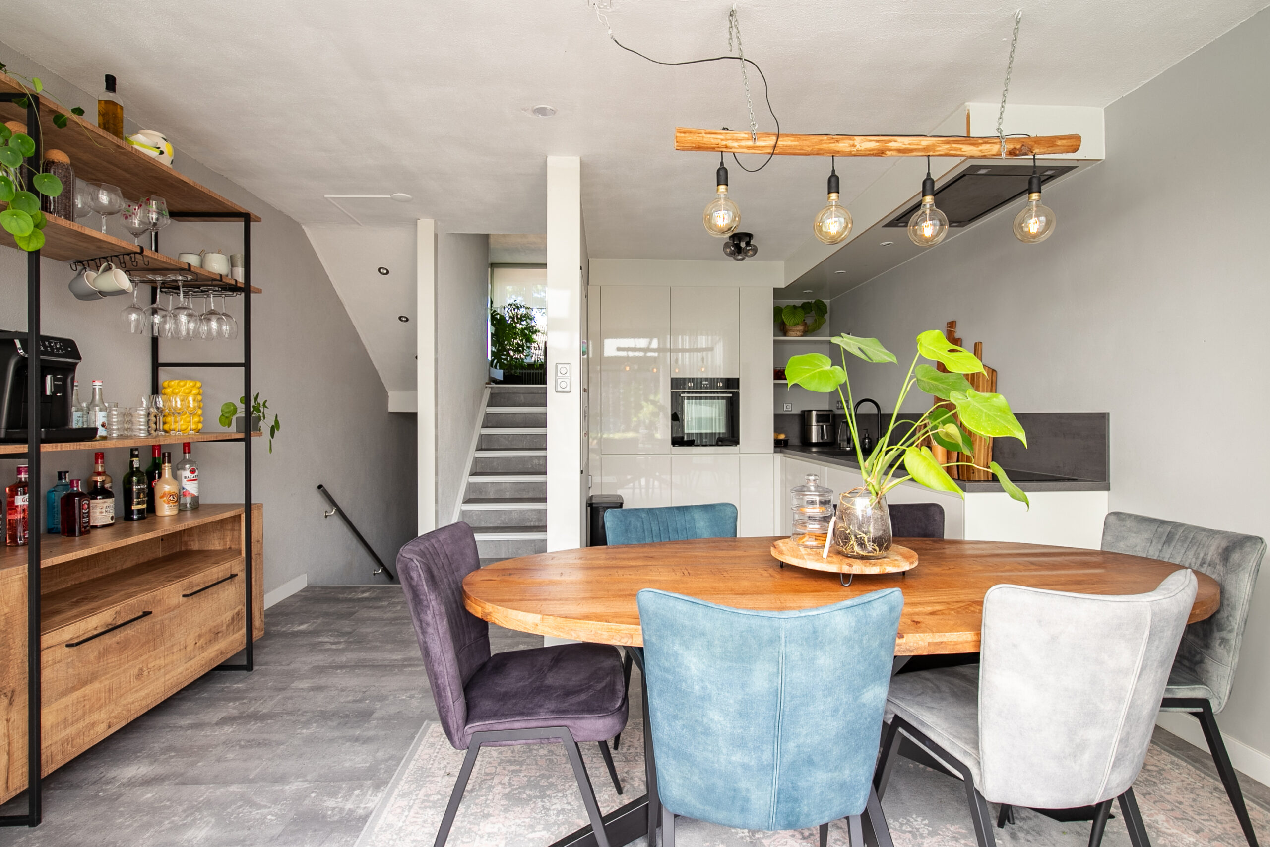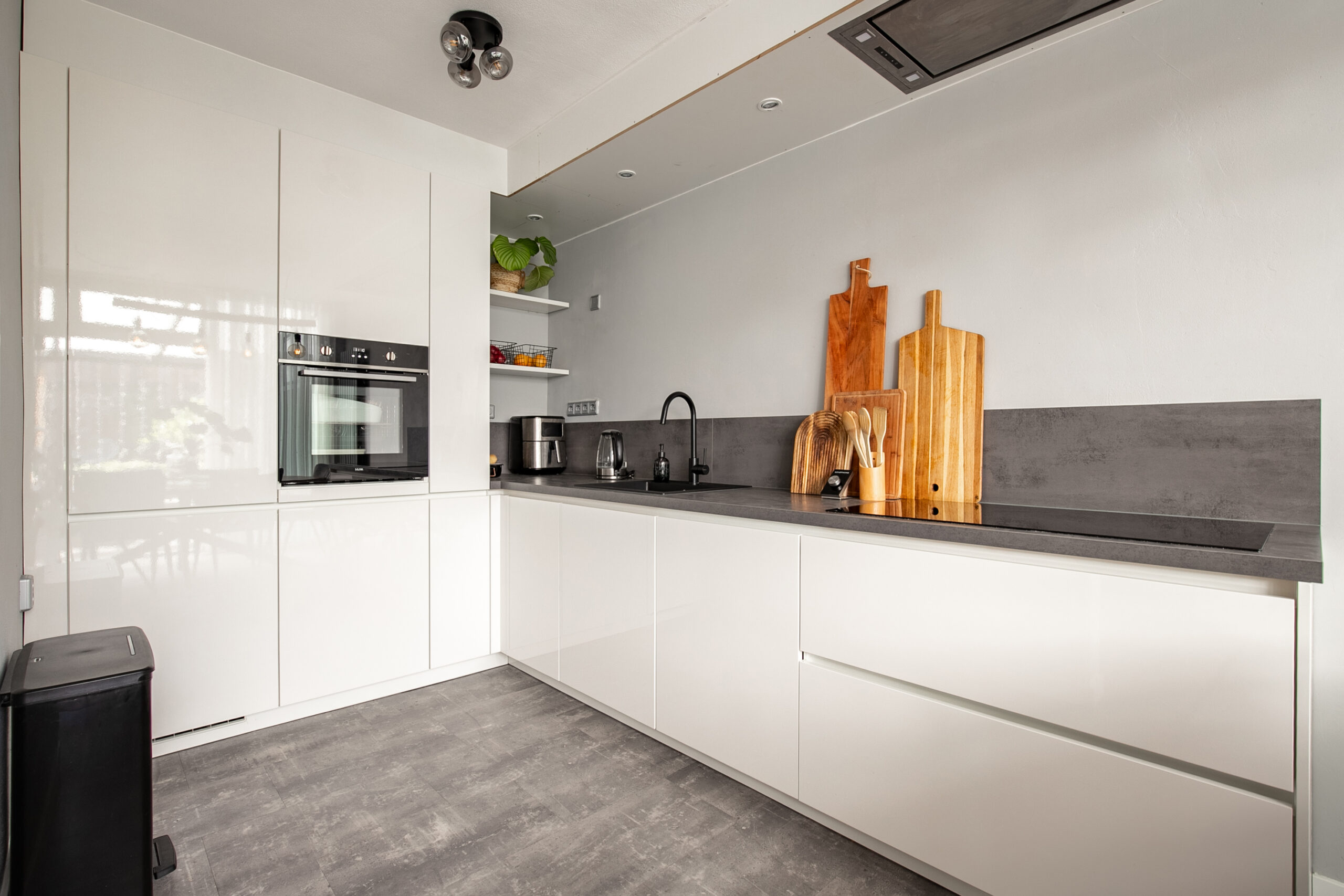 Door middel van een kleine trapopgang bereikt u de open keuken met eetkamer aan de tuinzijde van de woning. De keuken in L-opstelling is in 2023 geplaatst en voorzien van een 5-pitsinductie kookplaat, afzuigkap, vaatwasser, heteluchtoven en een koelkast. Deze ruimte geniet een goede mate van daglichttoetreding vanwege de raampartijen en openslaande deuren richting de achtertuin. De achtertuin is onderhoudsvriendelijk aangelegd, geniet een goede mate van privacy en is in 2017 voorzien van een overkapping met verlichting om een comfortabel buitenverblijf te realiseren.