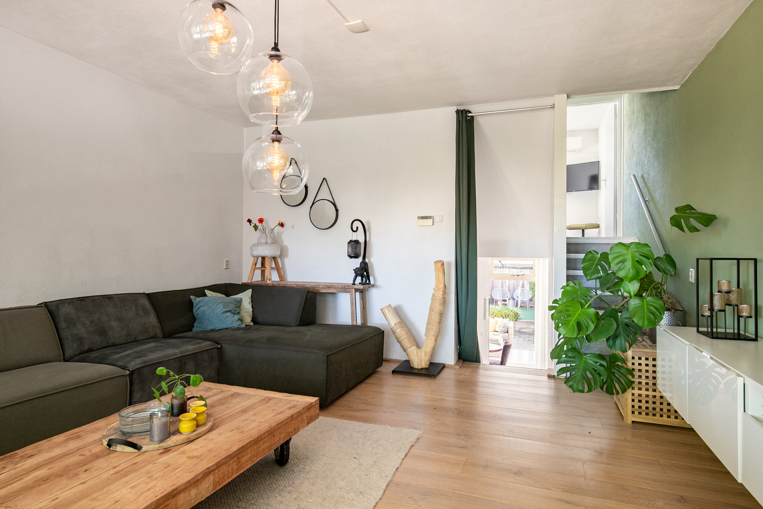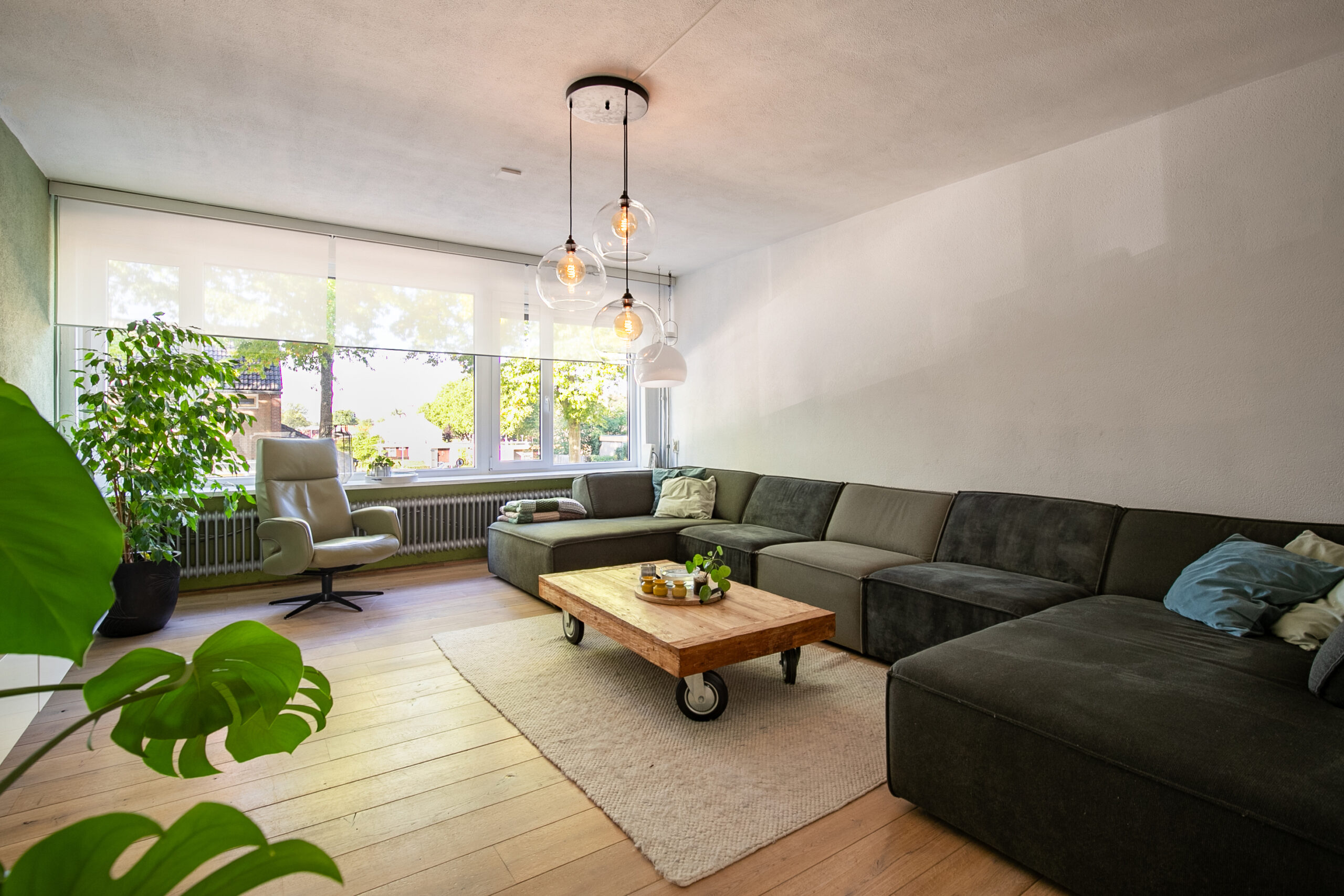 De woonkamer welke ca. 25m2 groot is en voorzien van een houtvloer. Vanuit de woonkamer kijkt u uit over de wijk.