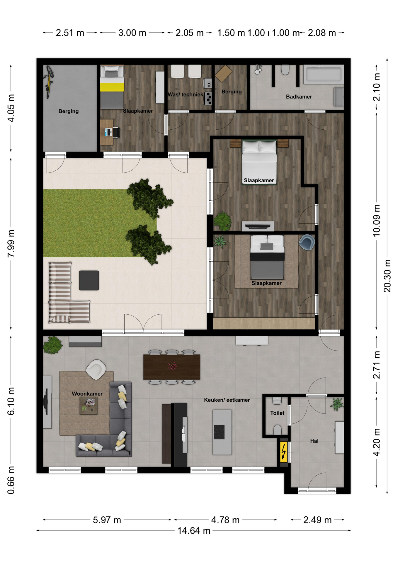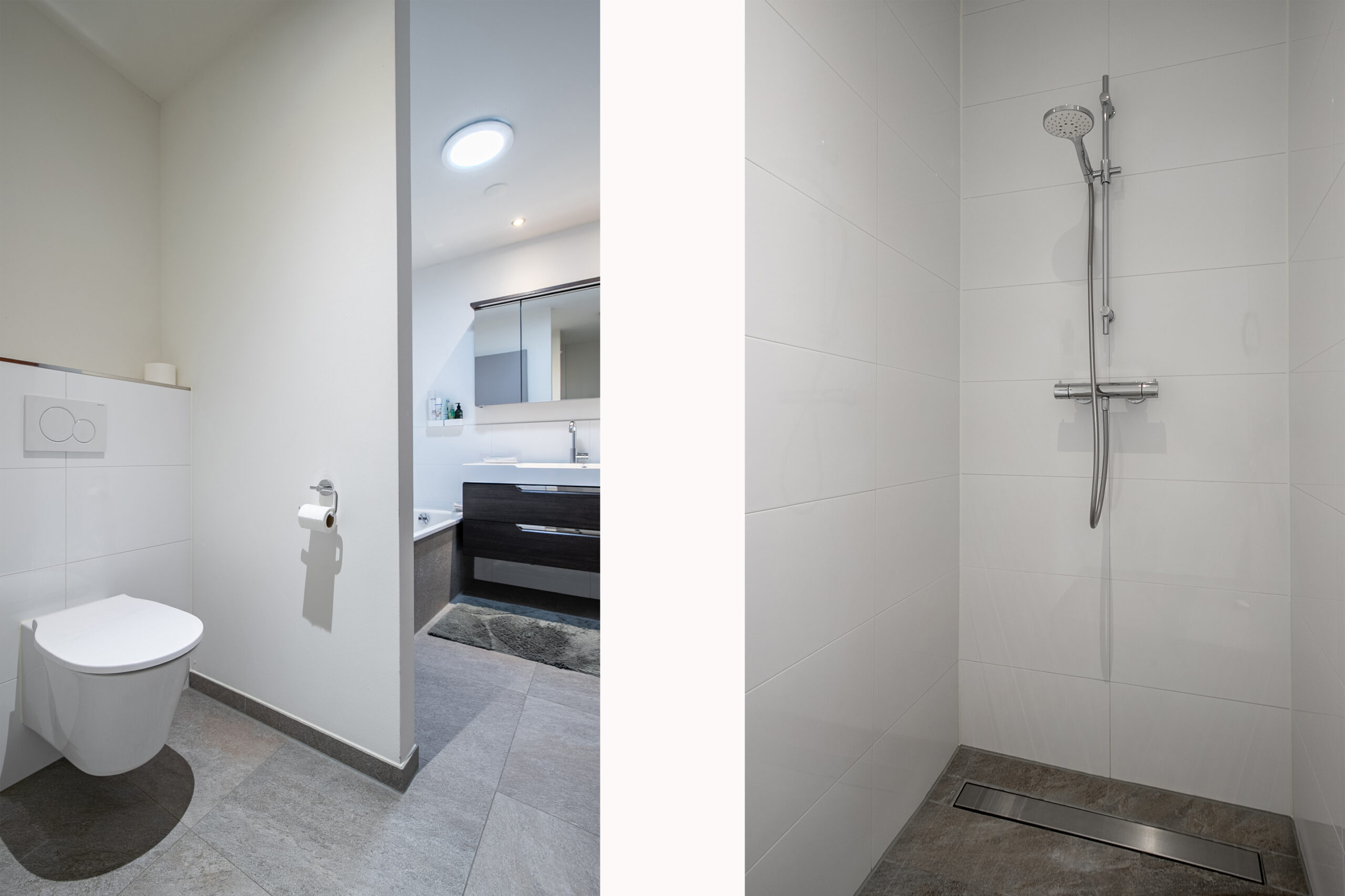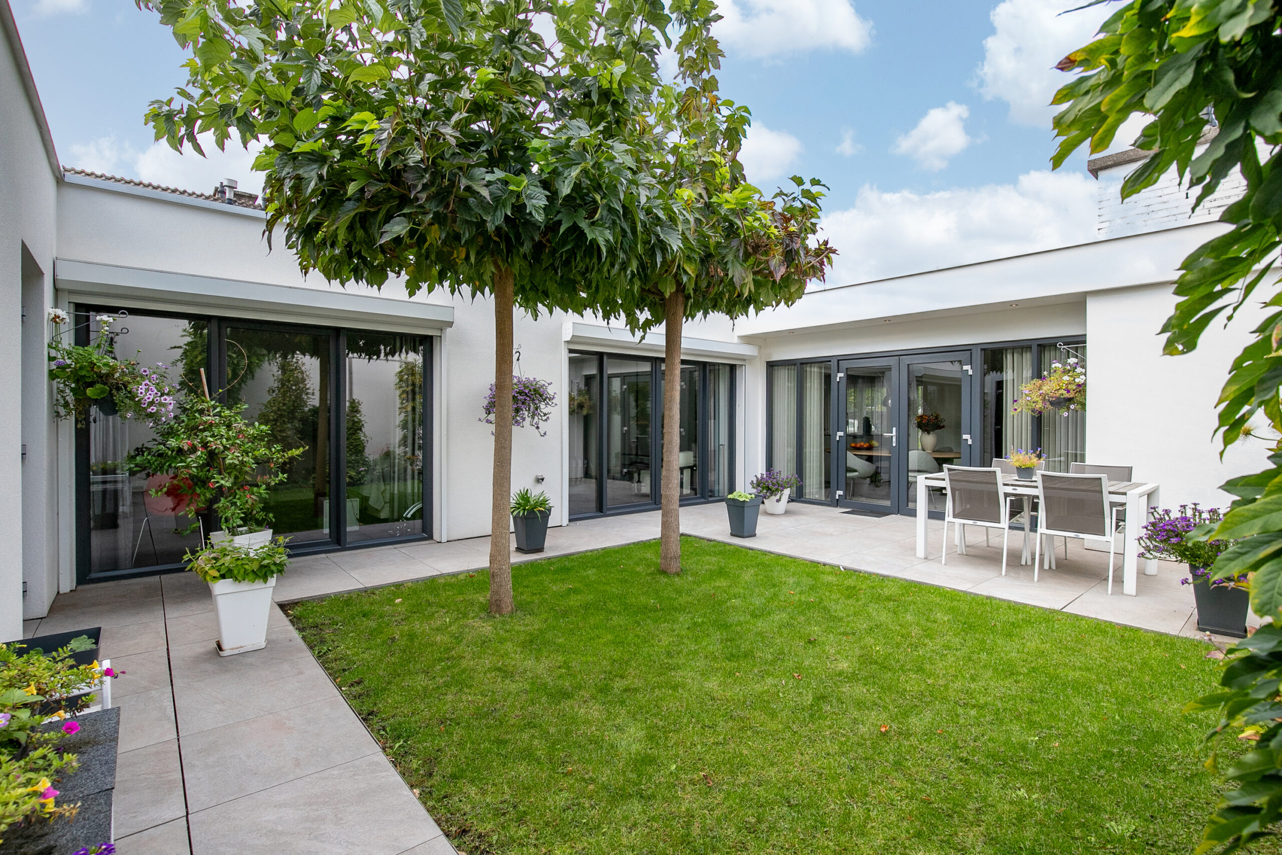 Vanuit de woonkamer is de slaapvleugel bereikbaar, met drie slaapkamers, badkamer en berging. Alle slaapkamers hebben toegang tot de patio. Ook vanuit de gang is een deur die toegang heeft tot de patio. Ruime en luxe afgewerkte badkamer voorzien van inloopdouche, ligbad, zwevend toilet en wastafel met badkamermeubel. Technische ruimte met aansluitpunten voor witgoed, opstelplaats voor hybride warmtepomp en omvormer voor de 18 zonnepanelen. Ruime inpandige berging en externe berging toegankelijk vanuit de patio. De patio is ingericht met een royaal terras voorzien van keramische tegels en is toegankelijk vanuit de woonkamer, slaapkamers en gang.