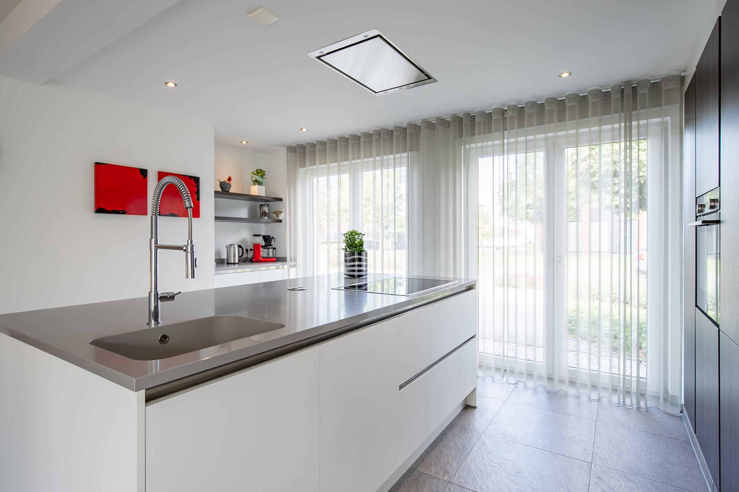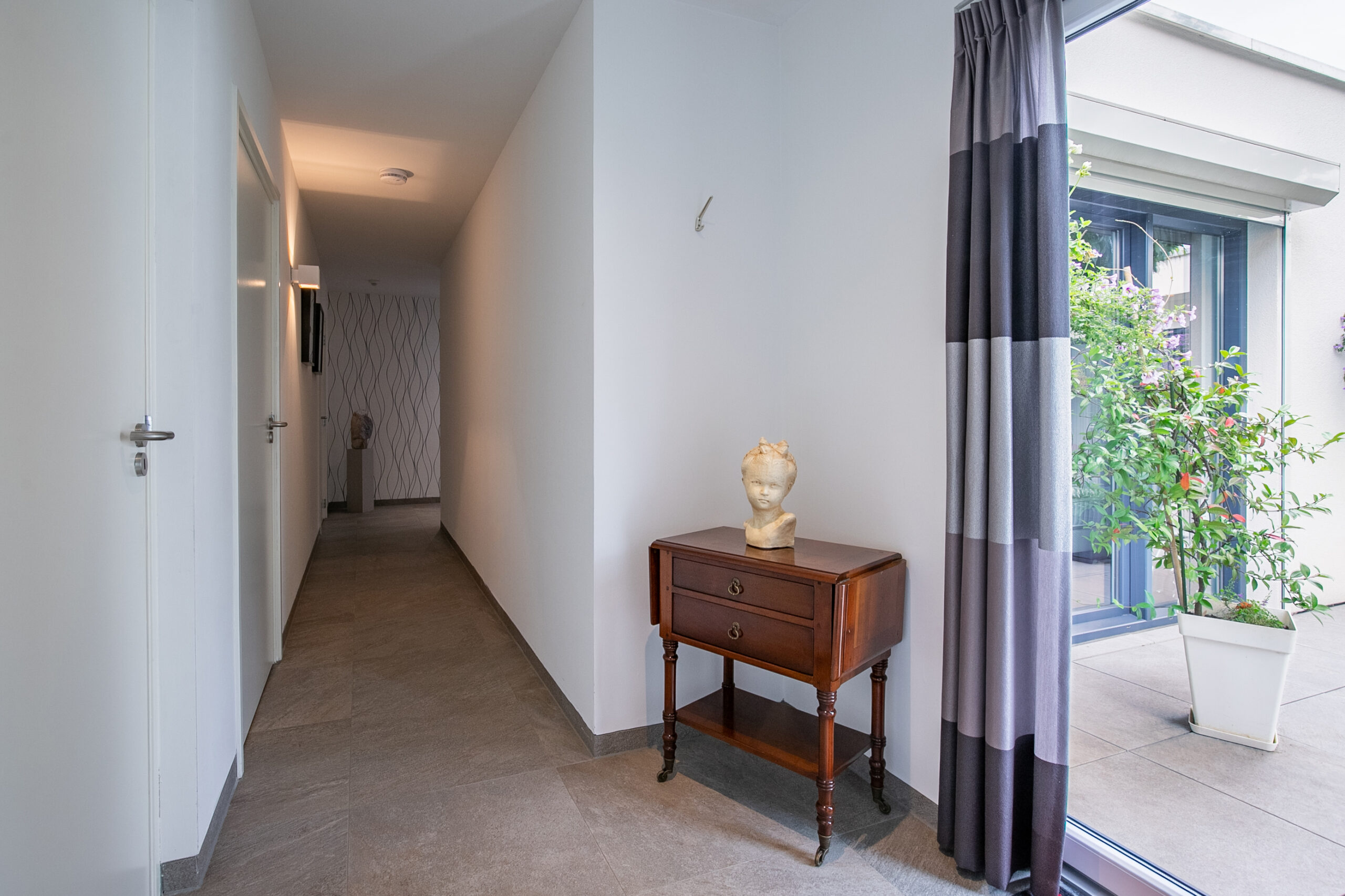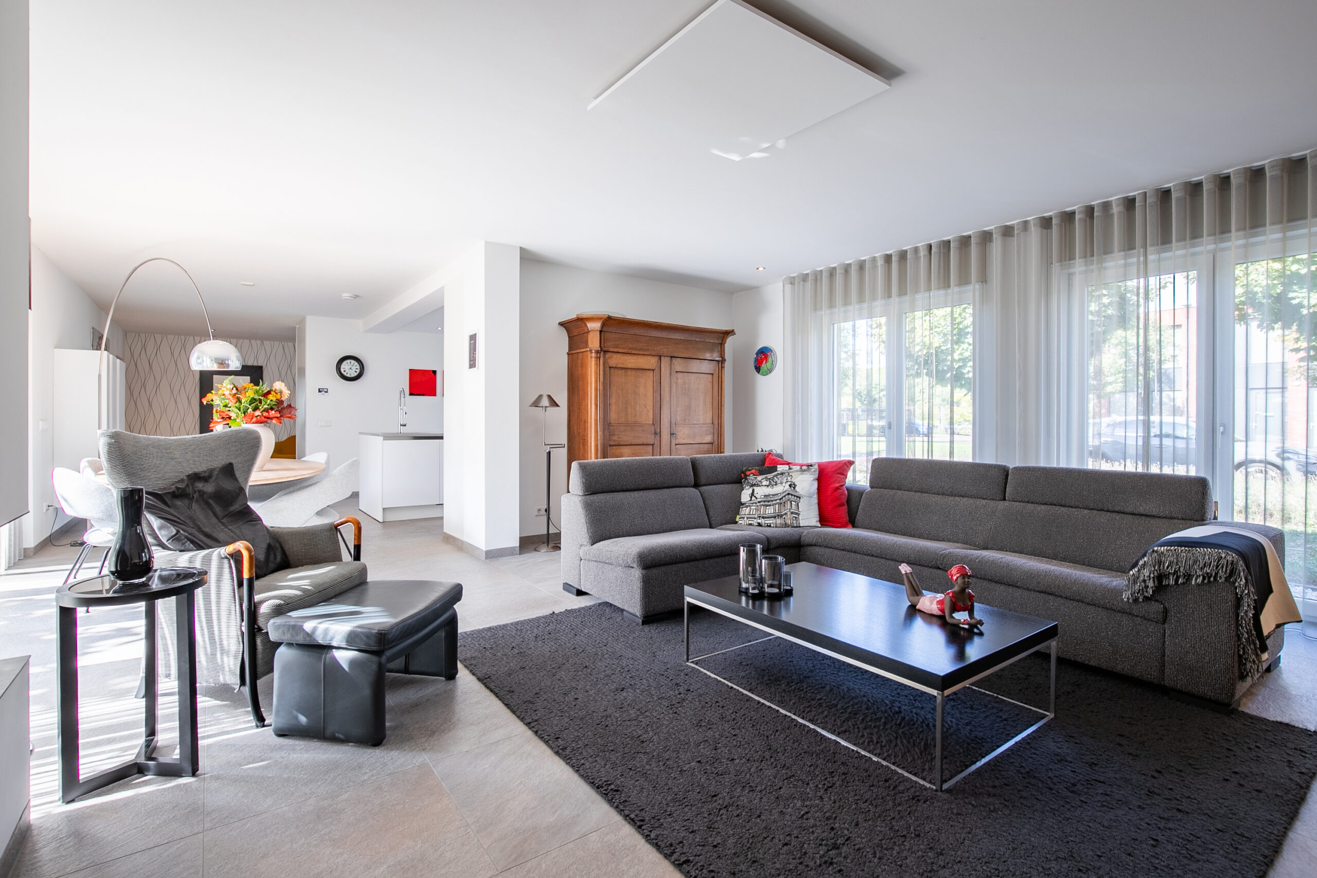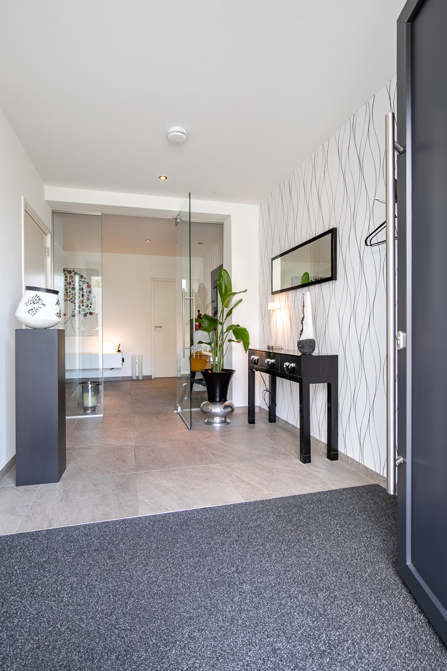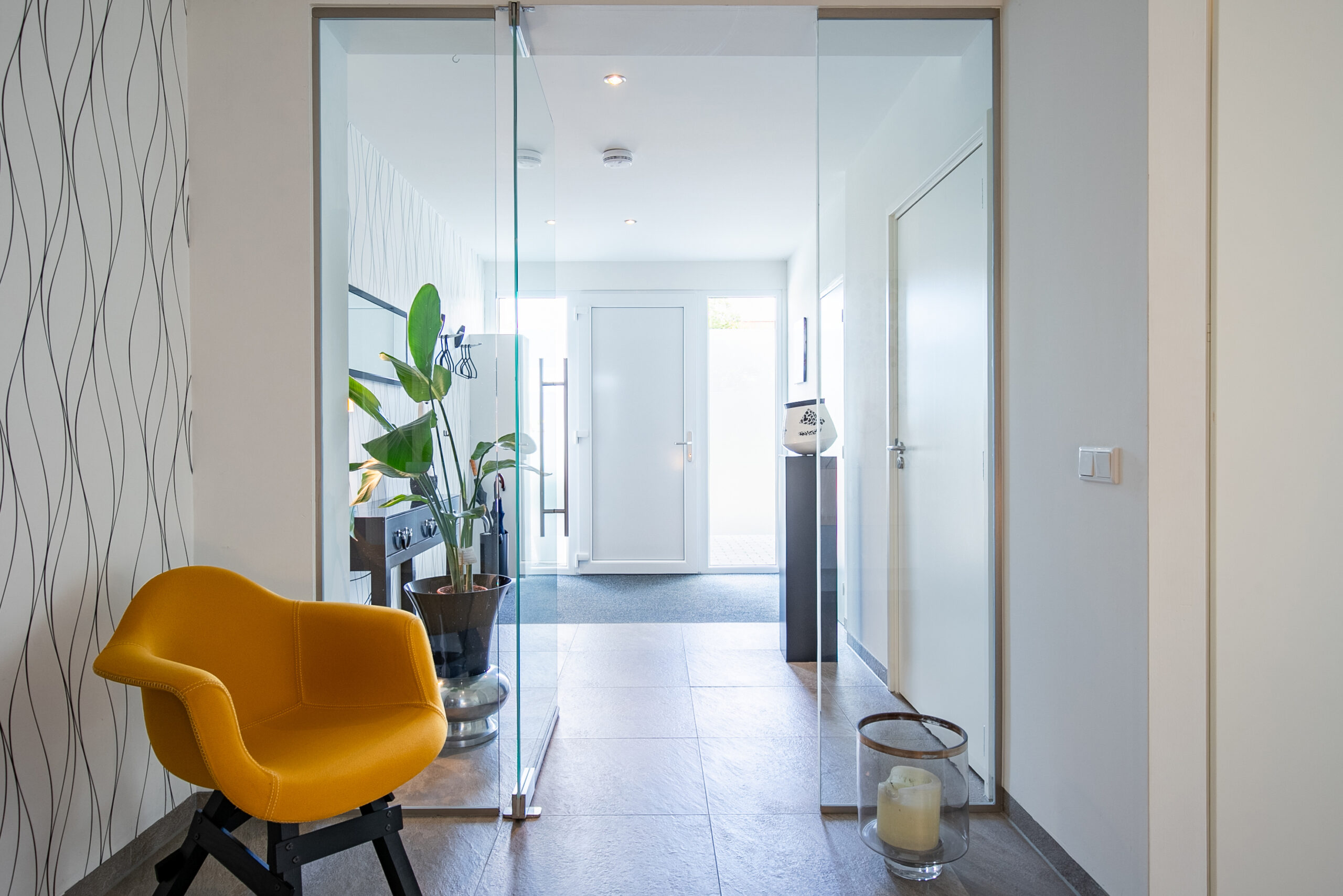 Voortuin met beklinkerde oprit en plek voor het stallen van meerdere voertuigen. Overdekte entree naar de royale ontvangsthal met moderne meterkast. De hal biedt toegang tot een moderne toiletruimte voorzien van zwevend toilet en fontein. Via glazen wand met taatsdeur toegang tot het woongedeelte. Woonkamer met open keuken is voorzien van veel lichtinval door de grote openslaande puien. De keramische vloerafwerking is voorzien van vloerverwarming. De fraaie en moderne keukeninstallatie is uitgevoerd in eiland- en wandopstelling. Het kookeiland is voorzien van een composiet werkblad en de keuken is voorzien van de navolgende inbouwapparatuur: inductiekookplaat, heteluchtoven, koelkast, vrieskast, inbouwboiler en afzuigkap. Het salon gedeelte met de strak gestucte schouwpartij met ingebouwde gashaard, openslaande deuren naar de gezellige patio met optimale privacy.