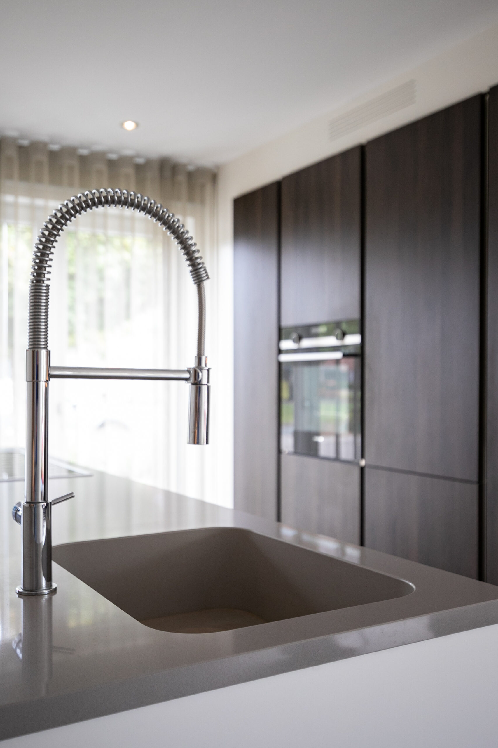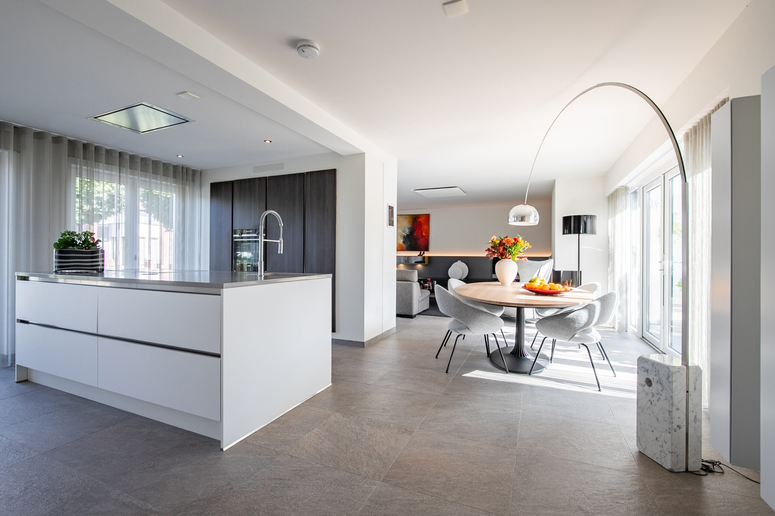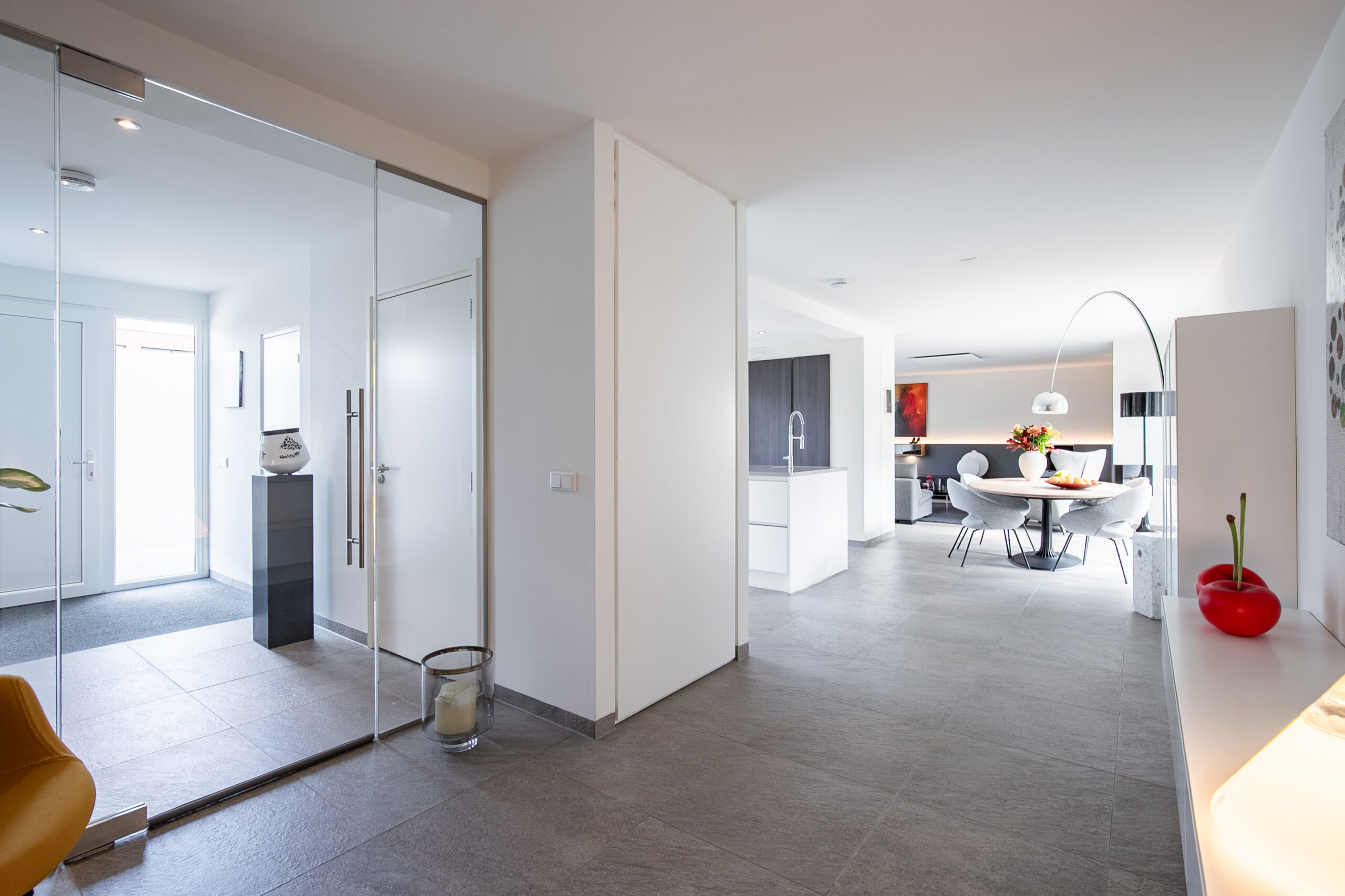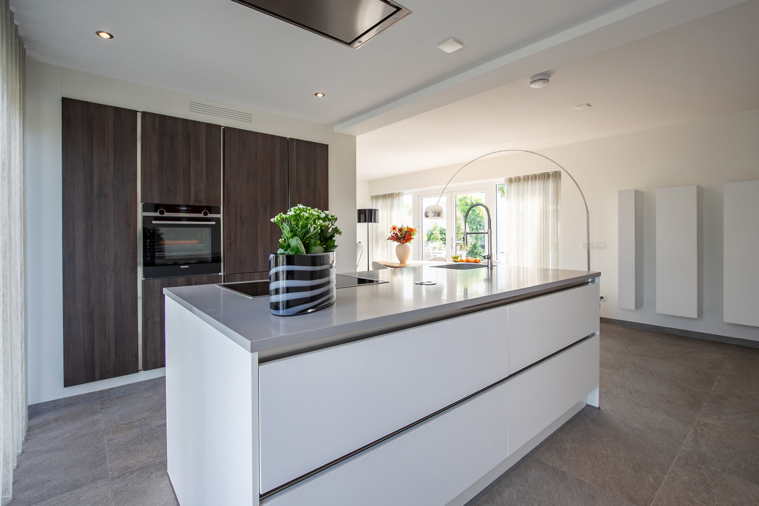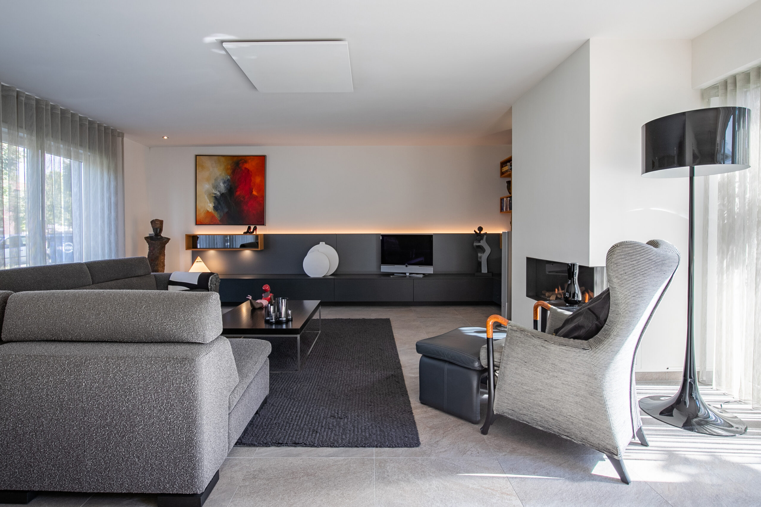 Voortuin met beklinkerde oprit en plek voor het stallen van meerdere voertuigen. Overdekte entree naar de royale ontvangsthal met moderne meterkast. De hal biedt toegang tot een moderne toiletruimte voorzien van zwevend toilet en fontein. Via glazen wand met taatsdeur toegang tot het woongedeelte. Woonkamer met open keuken is voorzien van veel lichtinval door de grote openslaande puien. De keramische vloerafwerking is voorzien van vloerverwarming. De fraaie en moderne keukeninstallatie is uitgevoerd in eiland- en wandopstelling. Het kookeiland is voorzien van een composiet werkblad en de keuken is voorzien van de navolgende inbouwapparatuur: inductiekookplaat, heteluchtoven, koelkast, vrieskast, inbouwboiler en afzuigkap. Het salon gedeelte met de strak gestucte schouwpartij met ingebouwde gashaard, openslaande deuren naar de gezellige patio met optimale privacy.