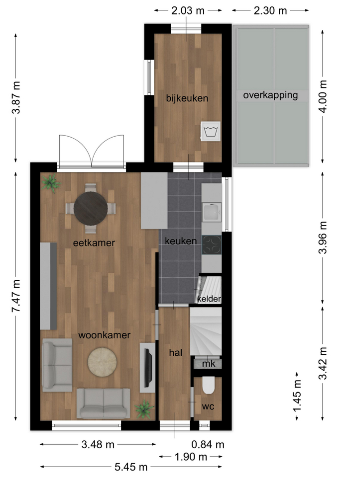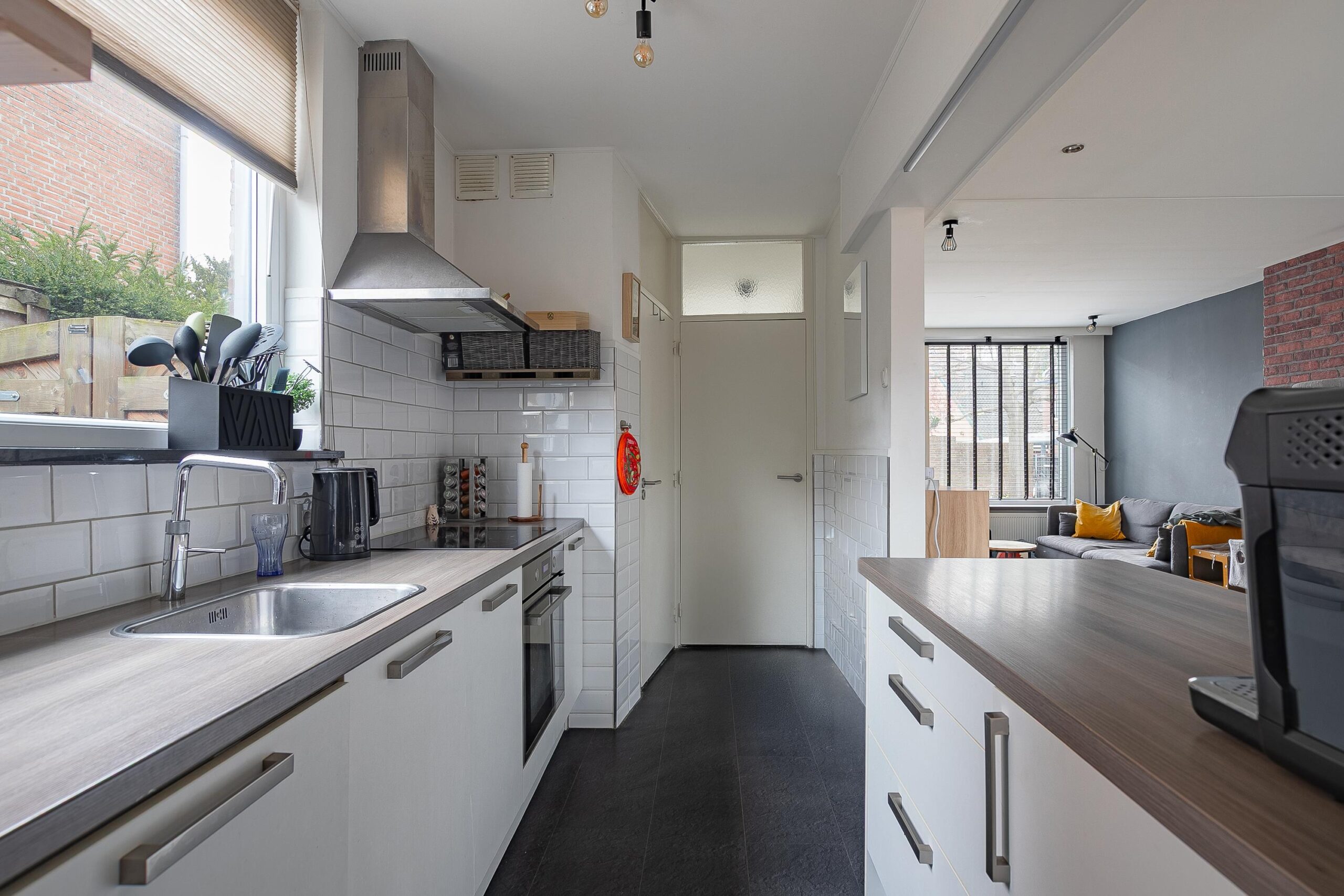 Entree/hal met meterkast (11 groepen, 3 aardlekschakelaars) en toiletruimte met hangcloset. De doorzonwoonkamer (ca. 25 m²) is belegd met een laminaatvloer en heeft de aansluiting voor een hout- en of gaskachel. De halfopen keuken (ca. 8 m²) is voorzien van een tegelvloer en de navolgende inbouwapparatuur: 4 pits inductie kookplaat, RVS afzuigkap, oven, koelkast, vaatwasser en spoelbak. Verder is er een eiland met bergkasten. De bijkeuken (ca. 8 m²) is voorzien van de witgoedaansluitingen en biedt via een loopdeur toegang tot de tuin. De vliering op de bijkeuken biedt extra bergruimte.