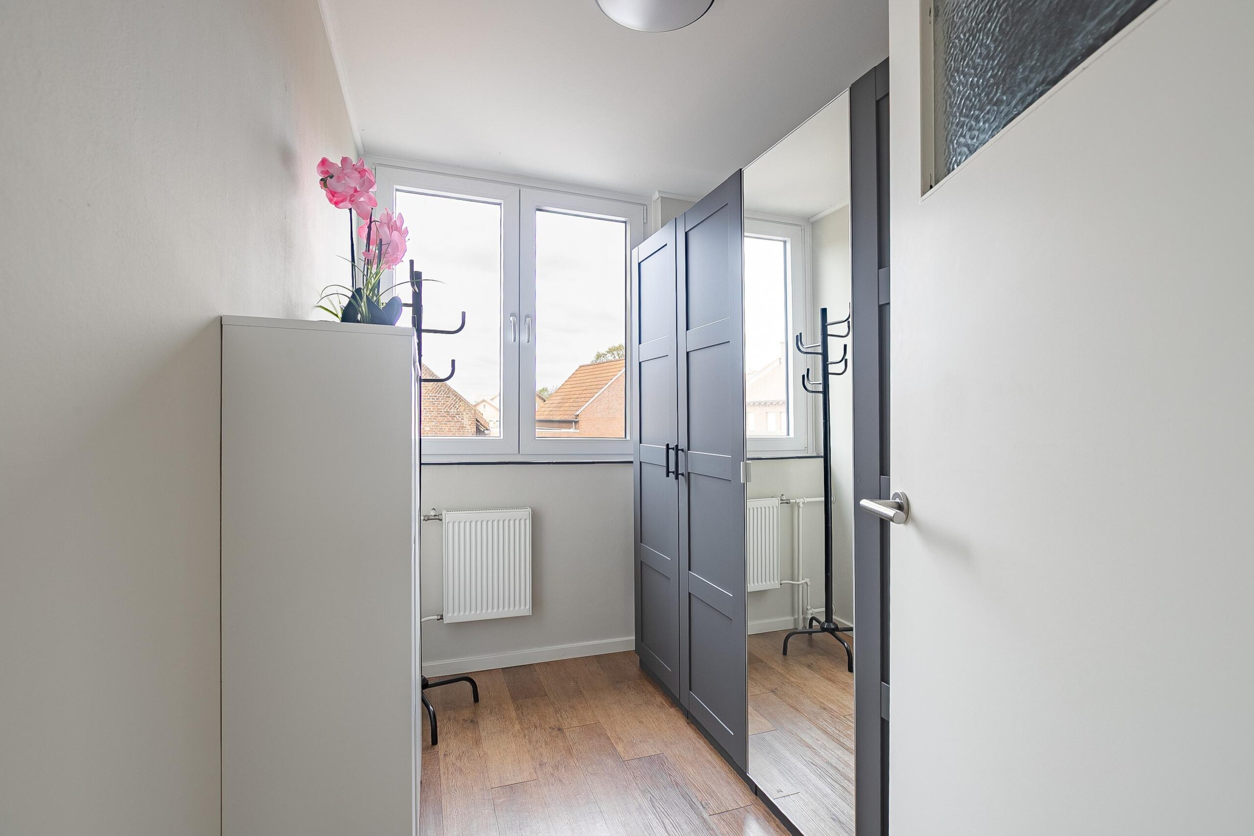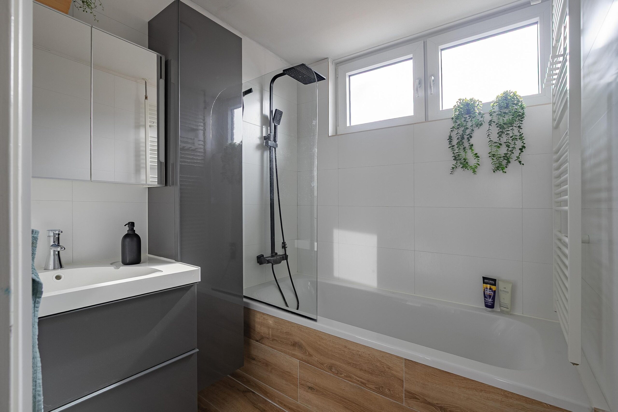 De overloop geeft toegang tot drie slaapkamers (ca. 14 m², 11.4 m² en 5.2 m²) waarvan twee met dubbele muurkasten en de recent (2023) vernieuwde en geheel betegelde badkamer (ca. 3.6 m²) met ligbad en wastafel met wastafelmeubel.