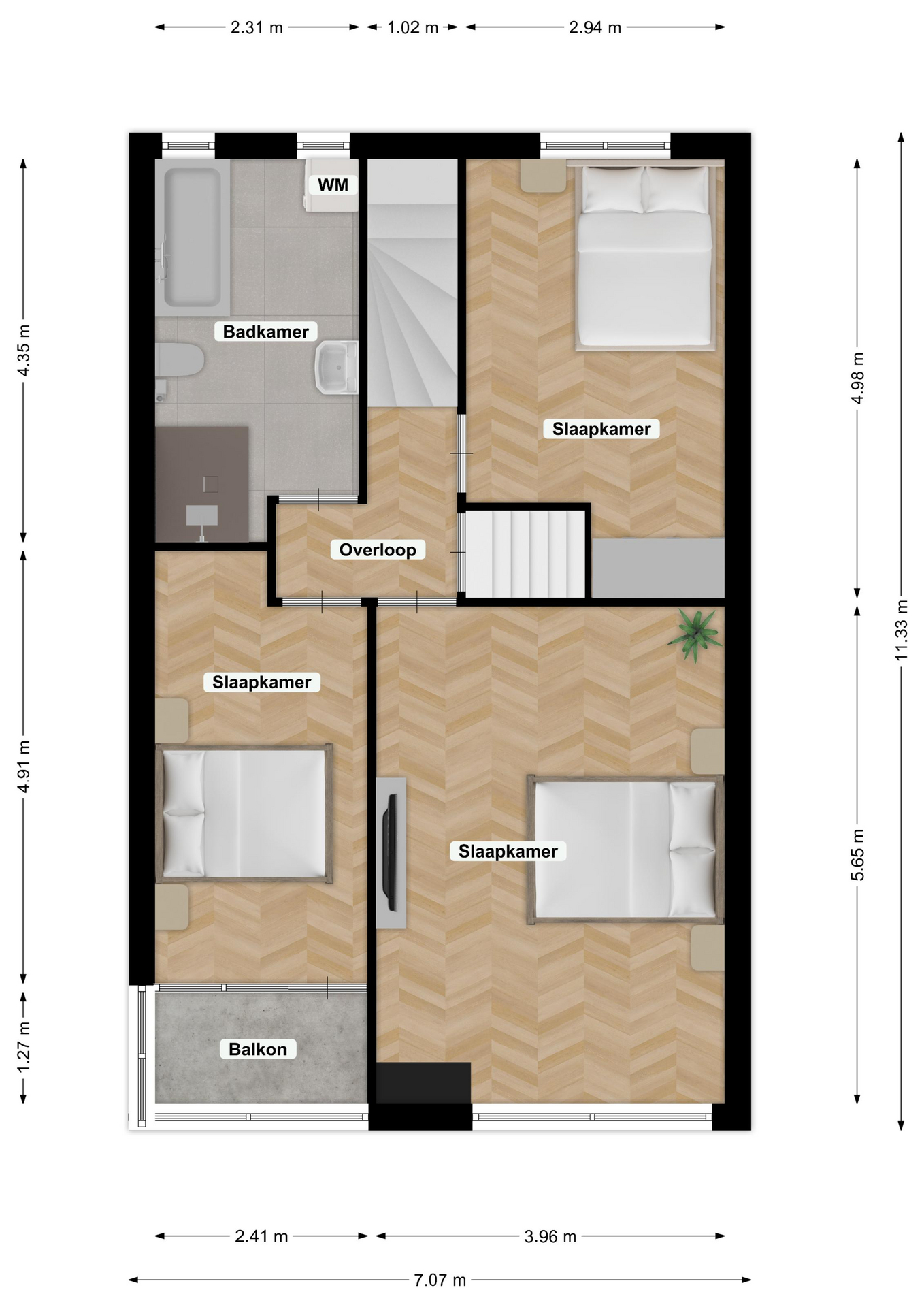 3) 4.91 m x 2.41 m, met toegang tot balkon.