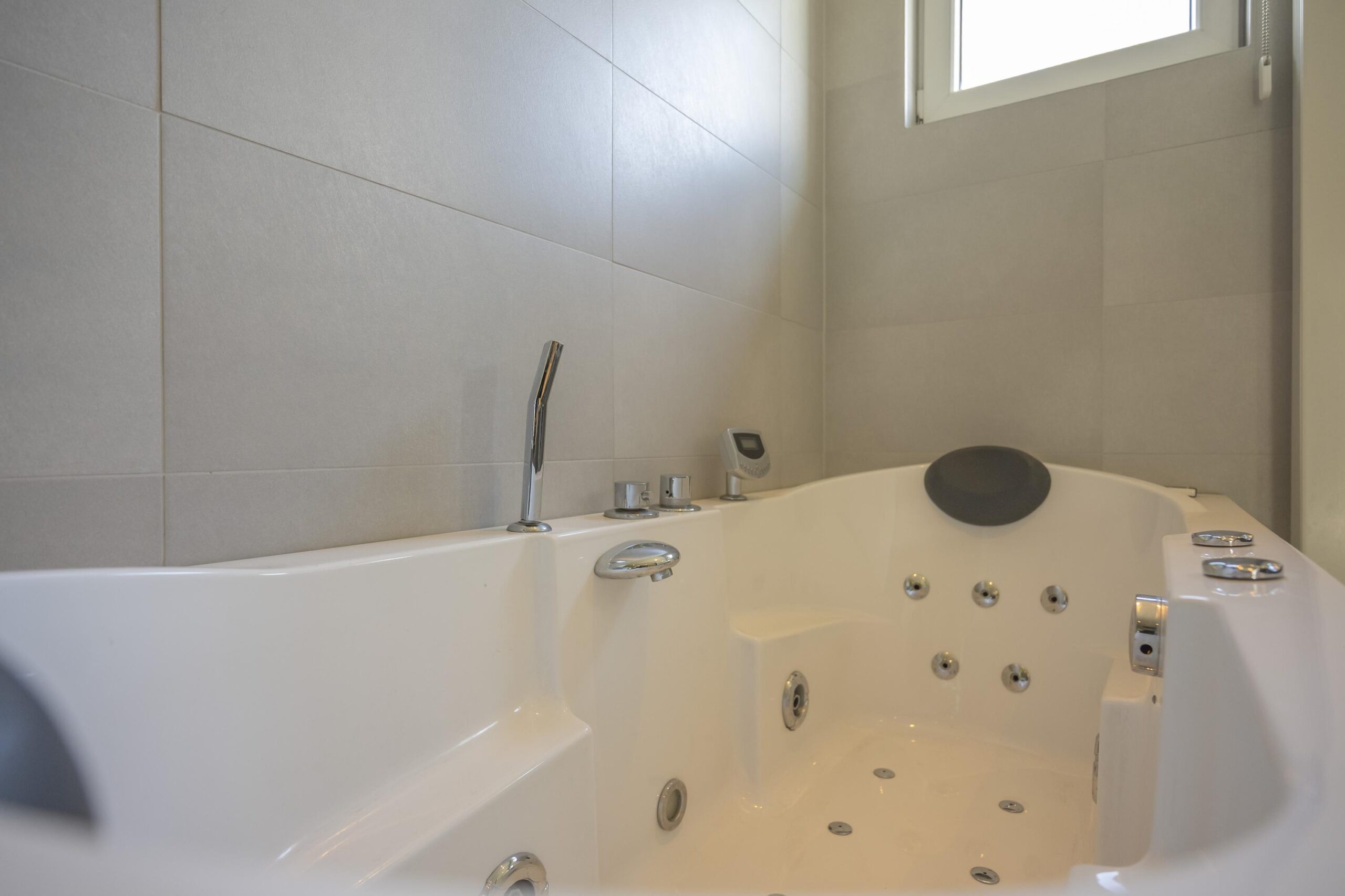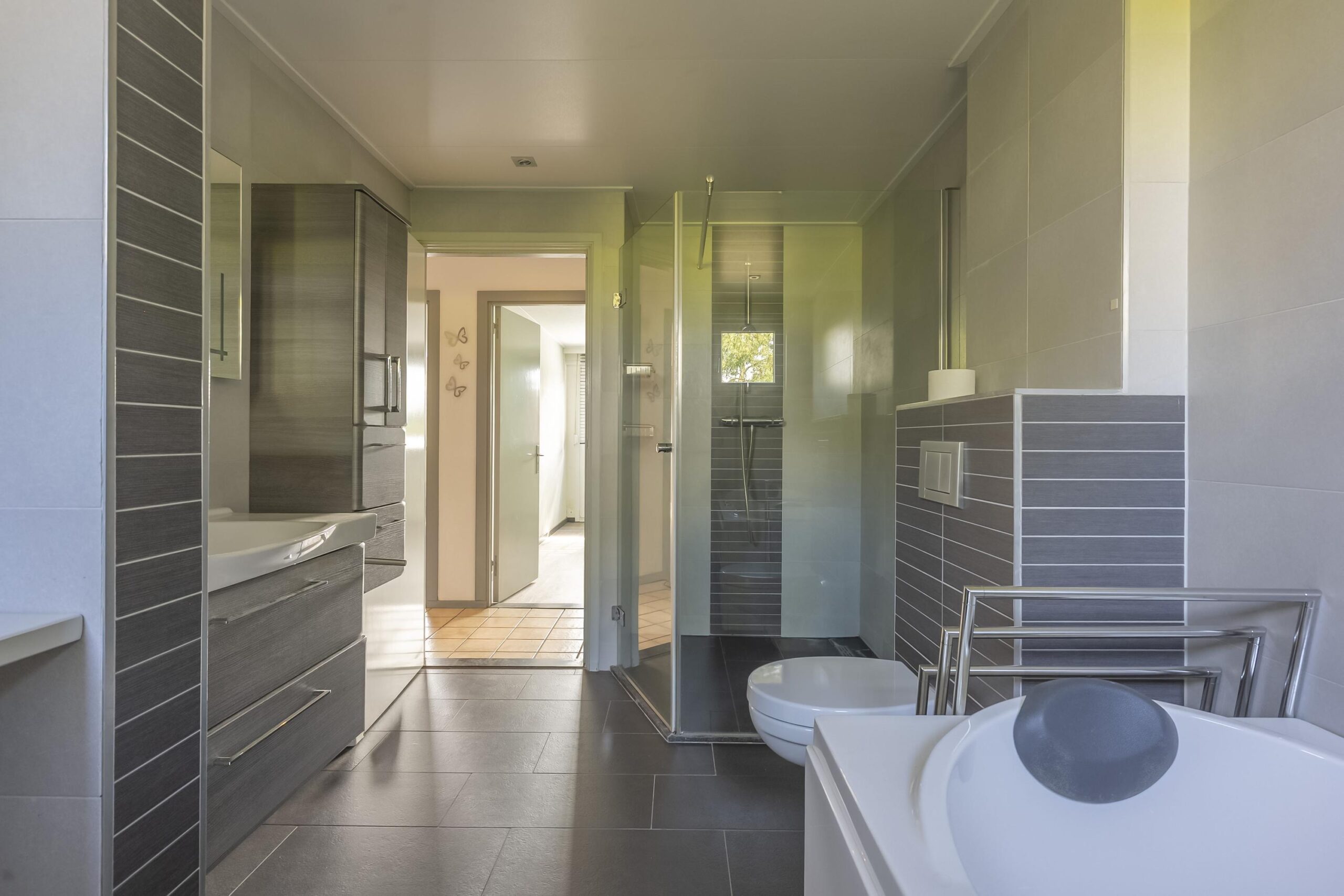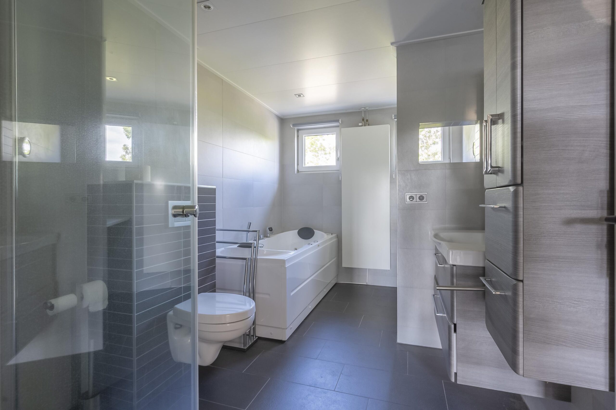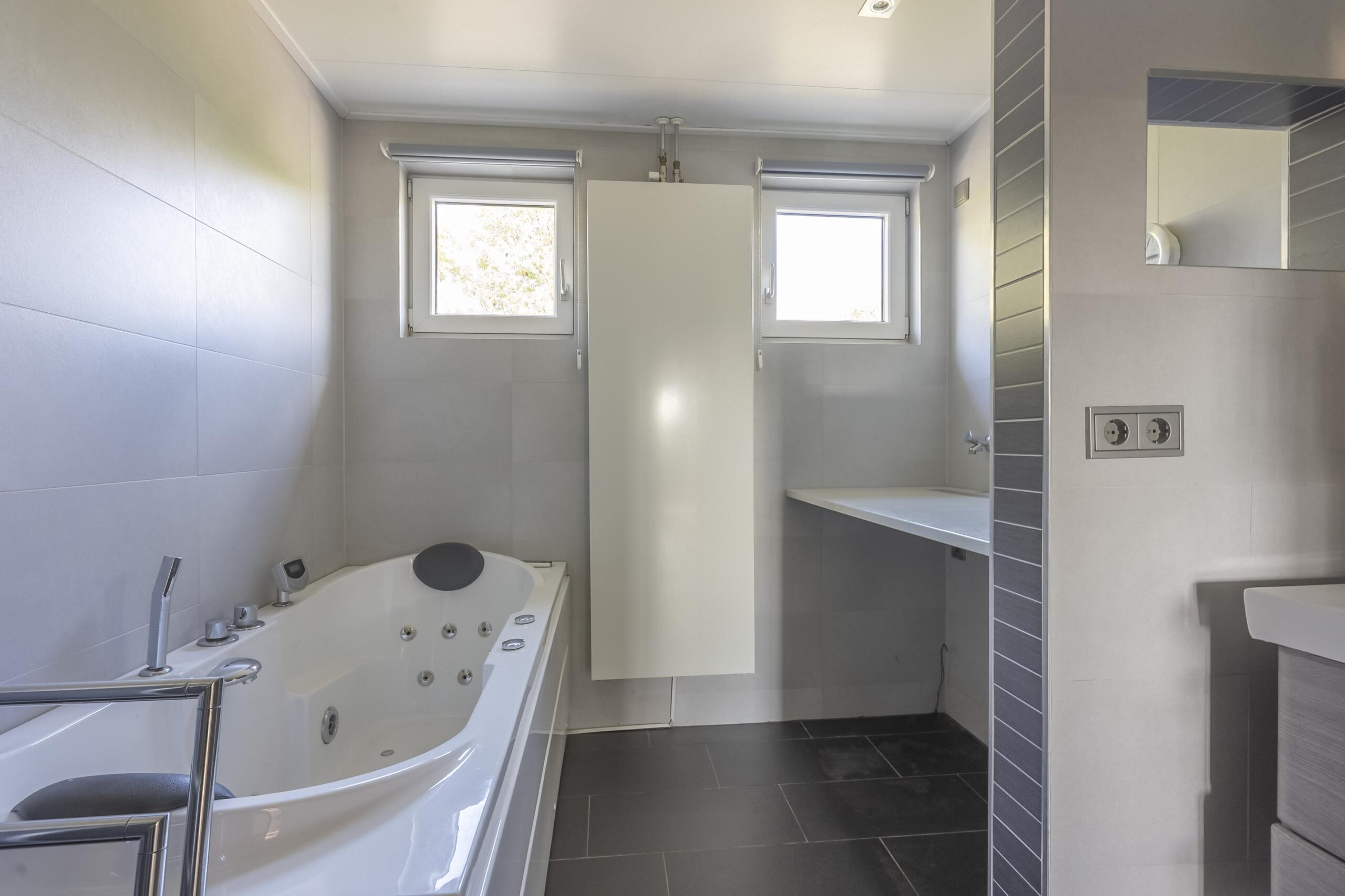 Verder beschikt de eerste verdieping over een royale, moderne, geheel betegelde badkamer (ca. 10 m²), voorzien van ruime inloop douche met hardglazen douchewand -en deur, tweede vrijhangend closet, bad met whirlpool installatie, wastafel met ombouwmeubel en alwaar de aansluitingen voor witgoed zich bevinden.