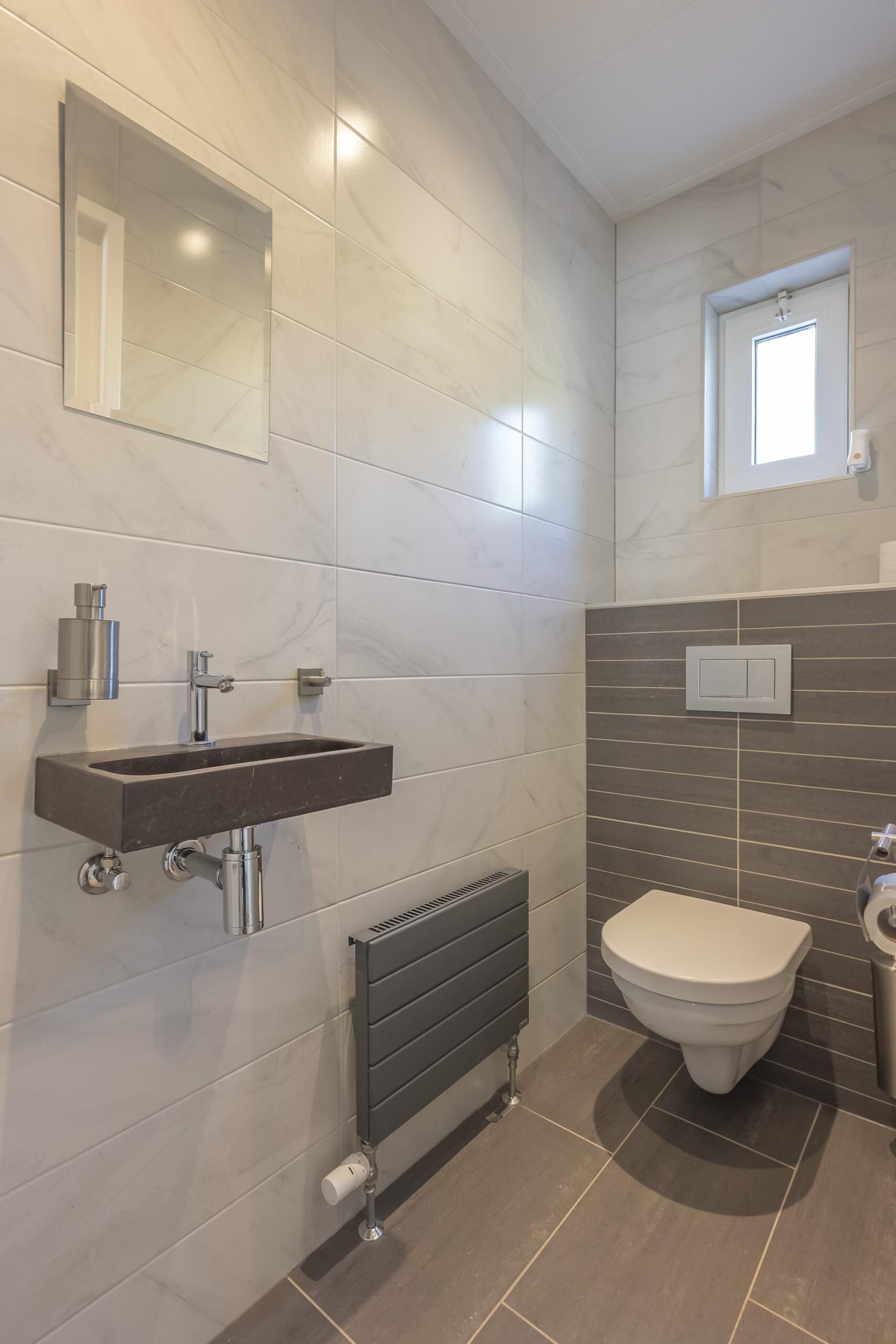 - Badkamervoorzieningen Ligbad, toilet, douche, wastafel, wastafelmeubel, wasmachineaansluiting