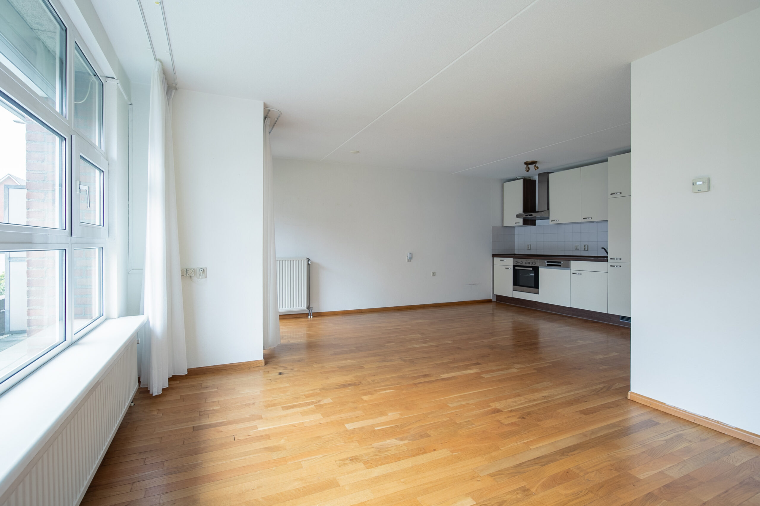 Via de galerij bereikt u de entree van het appartement. De verdeelhal beschikt over een moderne groepenkast, garderoberuimte en toegang tot de diverse vertrekken. Aan de voorzijde bevindt zich de lichte woonkamer (circa 30 m²), welke dankzij de grote raampartijen een prettige lichtinval geniet. De woonkamer staat in directe verbinding met de open keuken. De keuken is functioneel ingericht en voorzien van de navolgende apparatuur: koelkast met vriesvak, keramische kookplaat, afzuigkap, oven en vaatwasser. Vanuit de hal bereikt u twee nette slaapkamers van goed formaat. Beide slaapkamers zijn voorzien van een novylonvloer en respectievelijk groot: