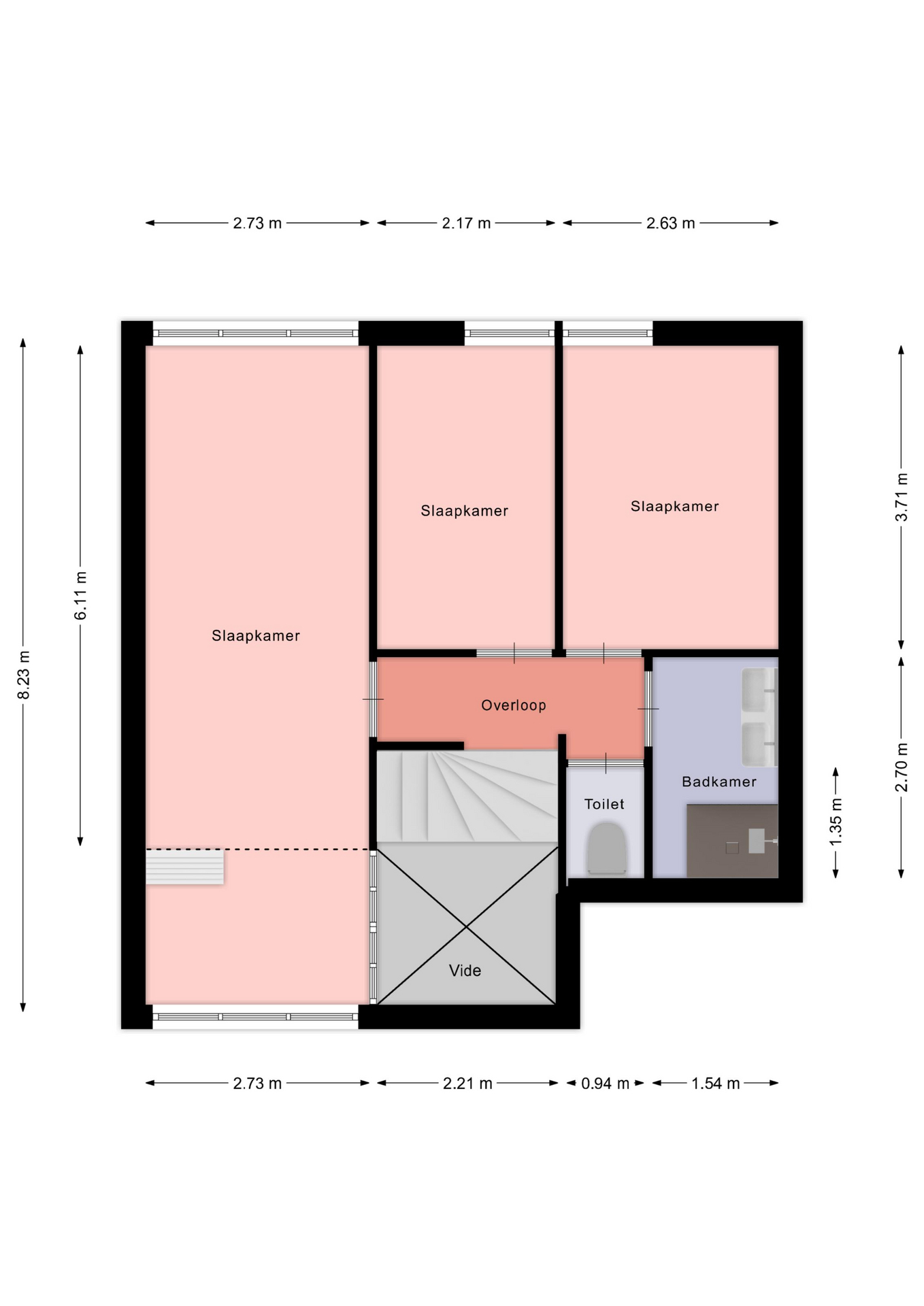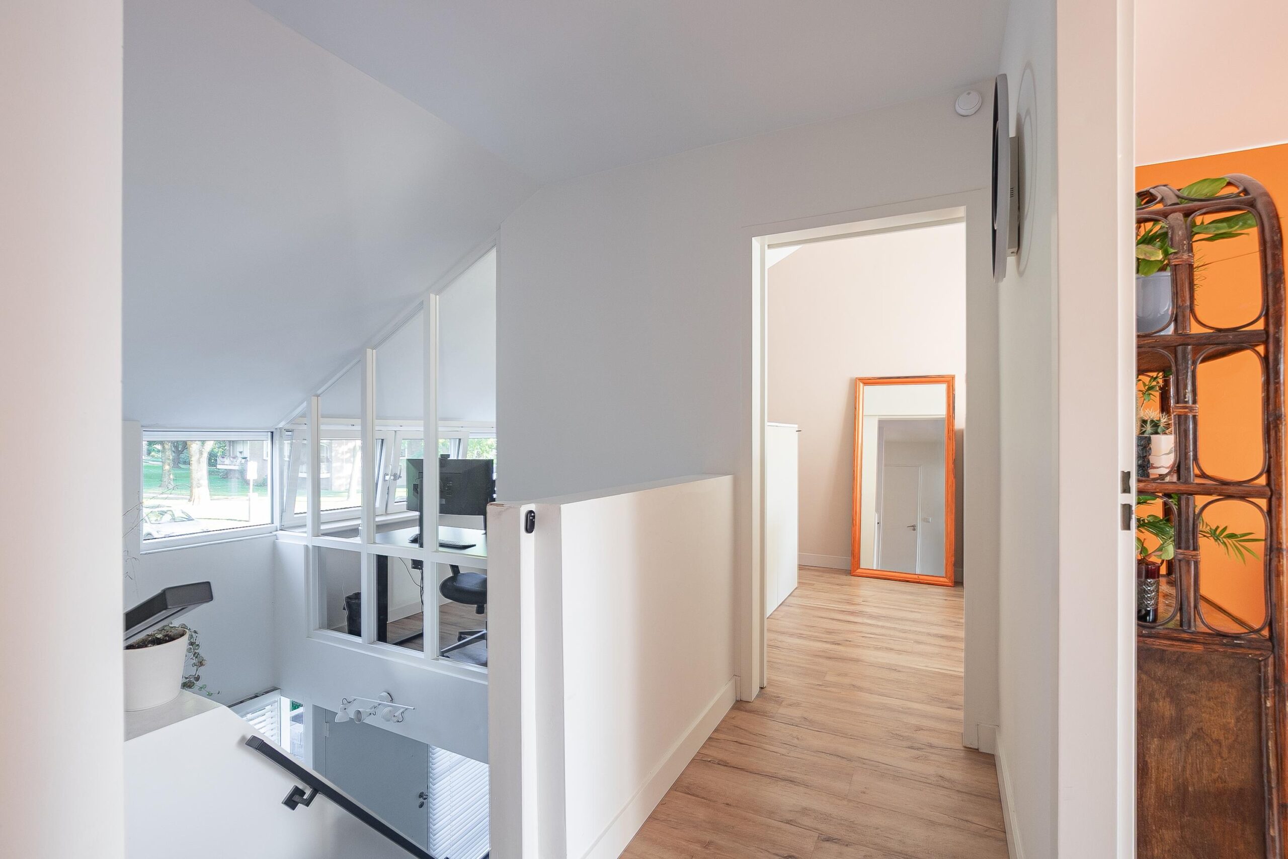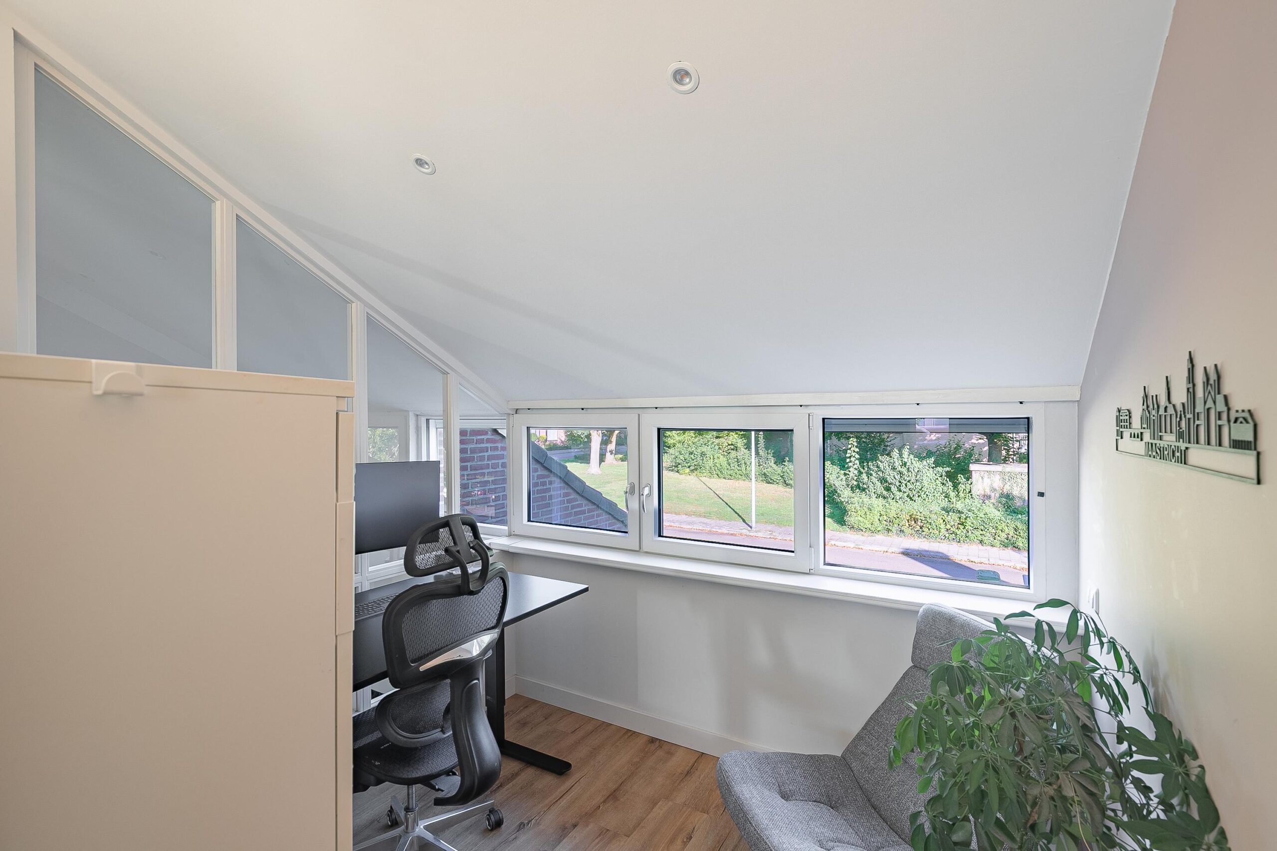 Overloop met sfeervolle vide en toegang tot drie slaapkamers, badkamer en separaat toilet. De grote slaapkamer (ca. 22m²) beschikt over een airco en een klein niveauverschil, waardoor de kamer optimaal in te delen is. De twee overige slaapkamers (ca. 8 en 10m²) zijn voorzien van een dakkapel en airco’s. De moderne badkamer (2023) is ca. 4m² groot en voorzien van een dubbel wastafelmeubel en een fijne inloopdouche.