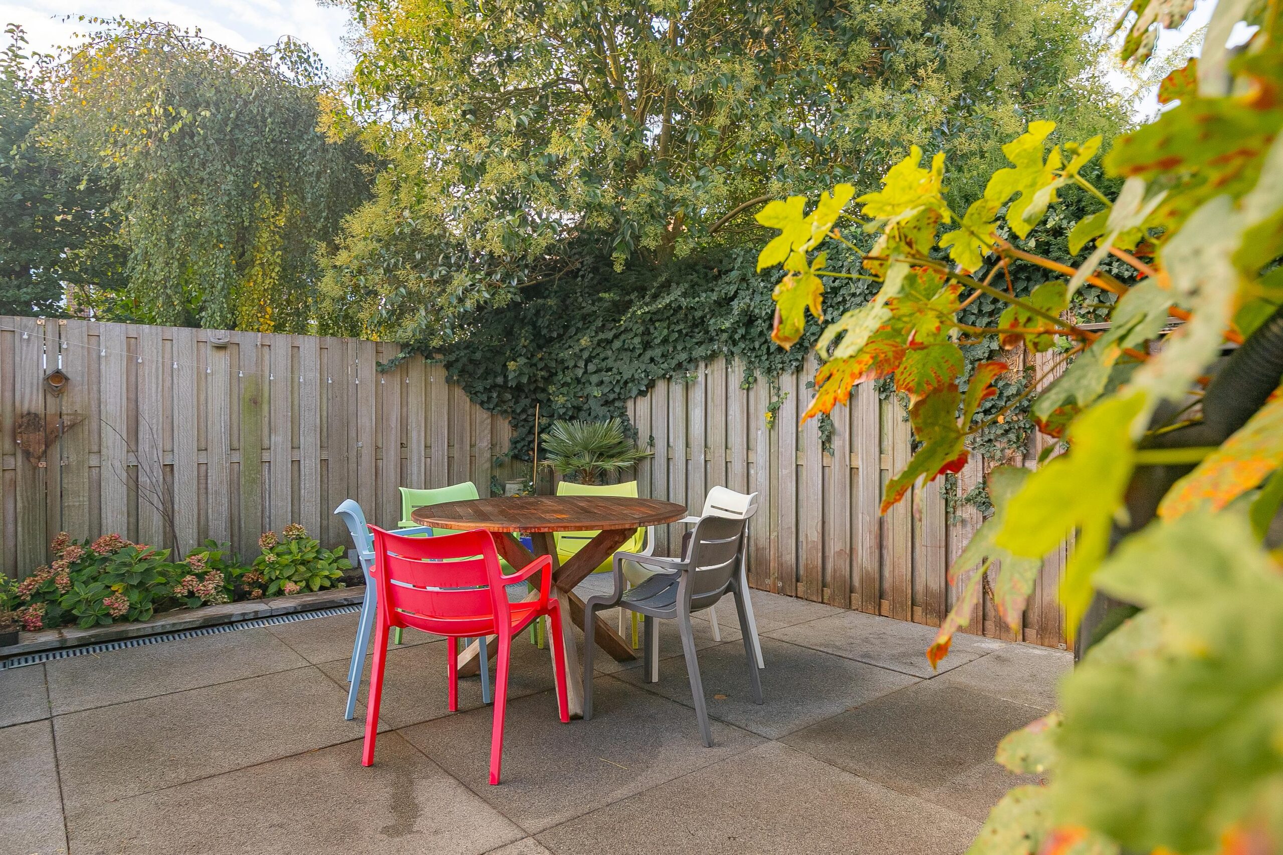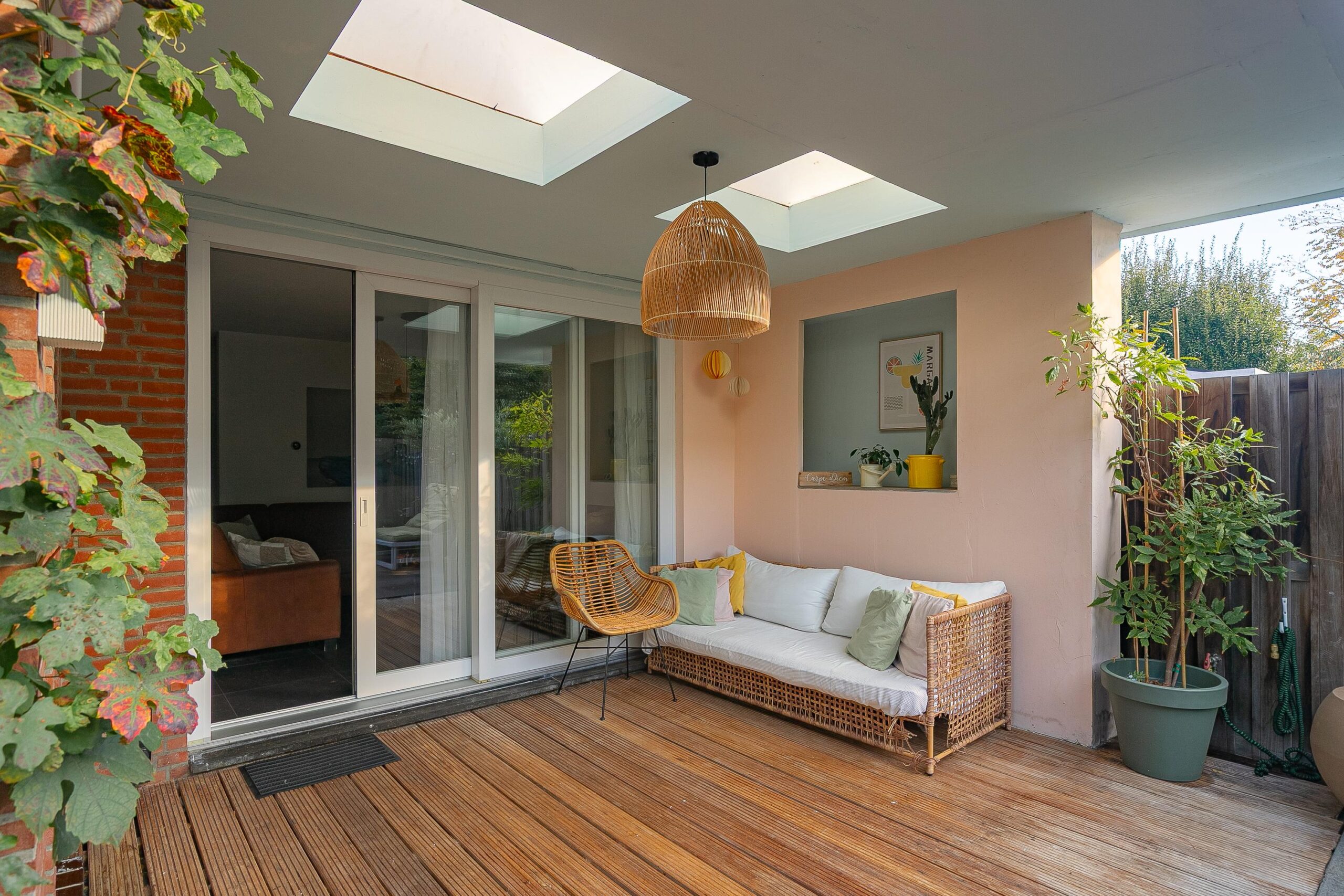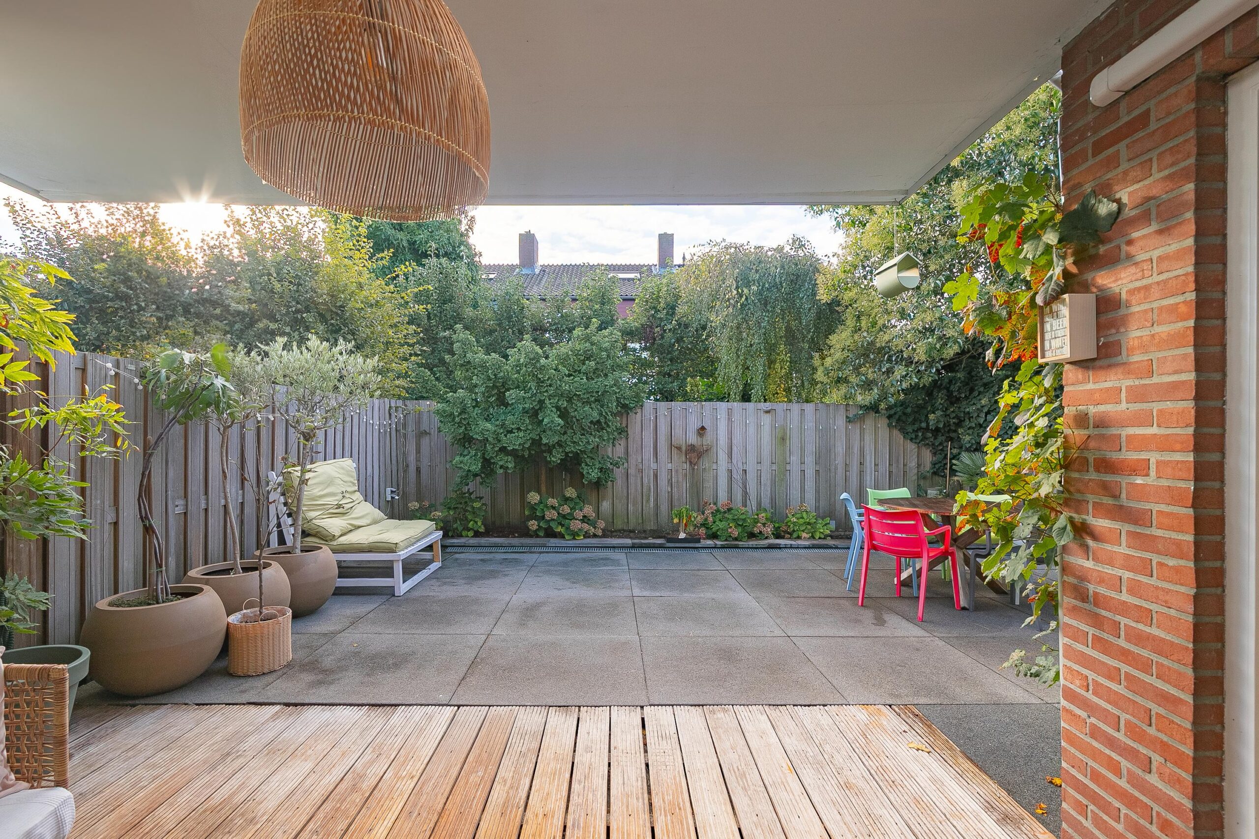 Goed onderhouden achtertuin (ca. 71m²) gesitueerd op het zuidoosten. De tuin is voorzien van een vlonderterras met overkapping inclusief lichtkoepel, deels betegeld en plantenborders. Er is een achteringang te creëren.