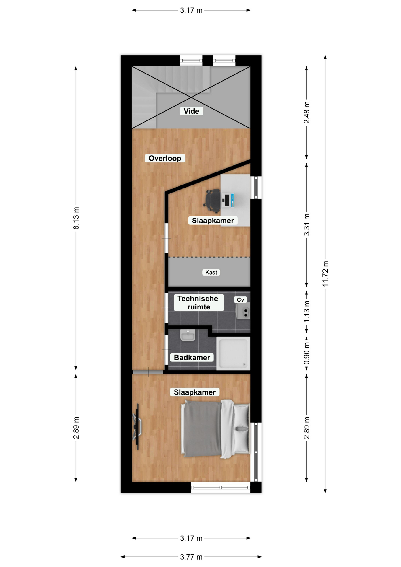 Vanaf de overloop zijn twee slaapkamers bereikbaar, respectievelijk groot: