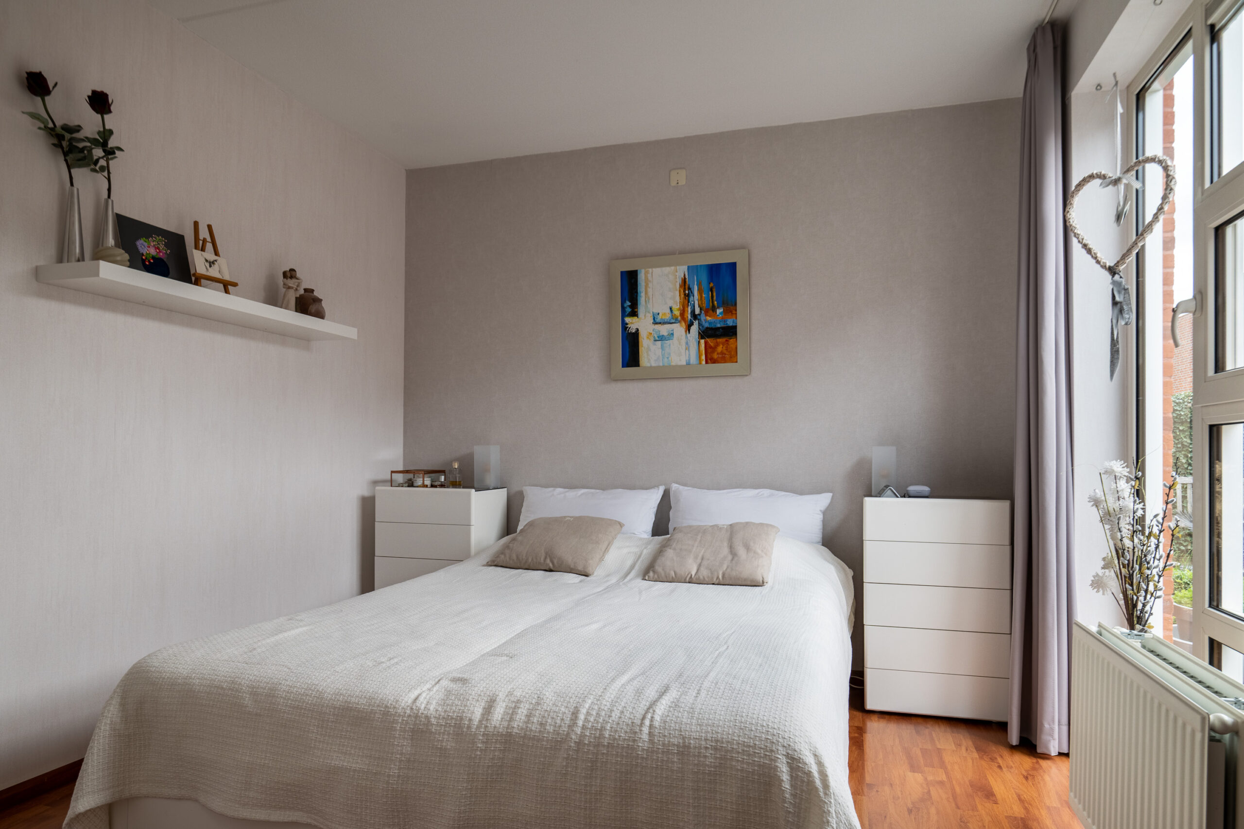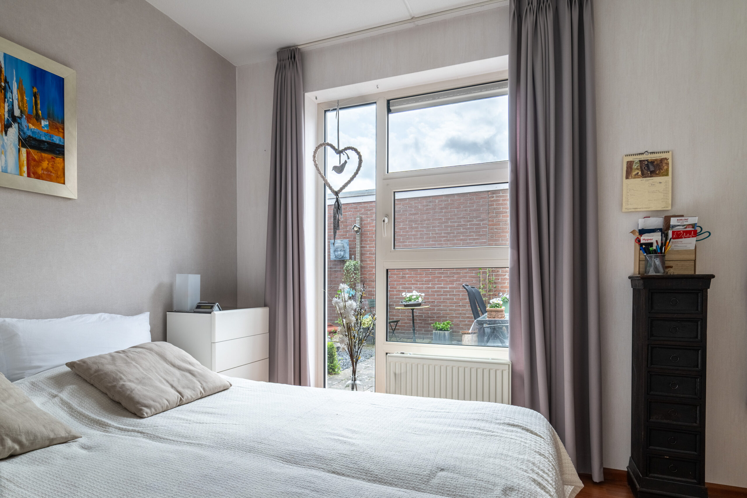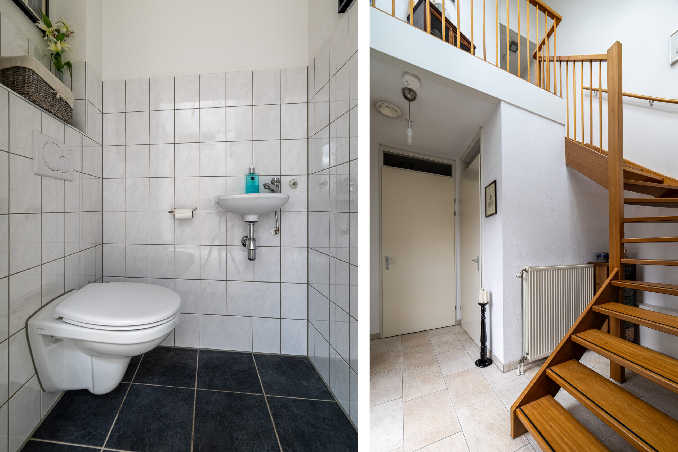 Vanuit de woonkamer bereikt u de centrale verdeelhal, welke eveneens is voorzien van een plavuizen vloer. Deze hal vormt het hart van de woning en biedt toegang tot de slaapkamer op de begane grond, de badkamer en het separate toilet. De slaapkamer op de begane grond is rustig gelegen met uitzicht op de tuin en heeft een prettige afmeting van circa 3.68 m x 3.07 m, waardoor deze uitstekend geschikt is als hoofdslaapkamer. Terug in de hal bereikt u de eerste badkamer (ca. 5 m²). Deze is volledig betegeld en voorzien van een douche, ligbad, wastafelmeubel, spiegelkast, extra badkamermeubel en mechanische afzuiging. Separaat bevindt zich de geheel betegelde toiletruimte met zwevend closet, fonteintje en afzuiging.
